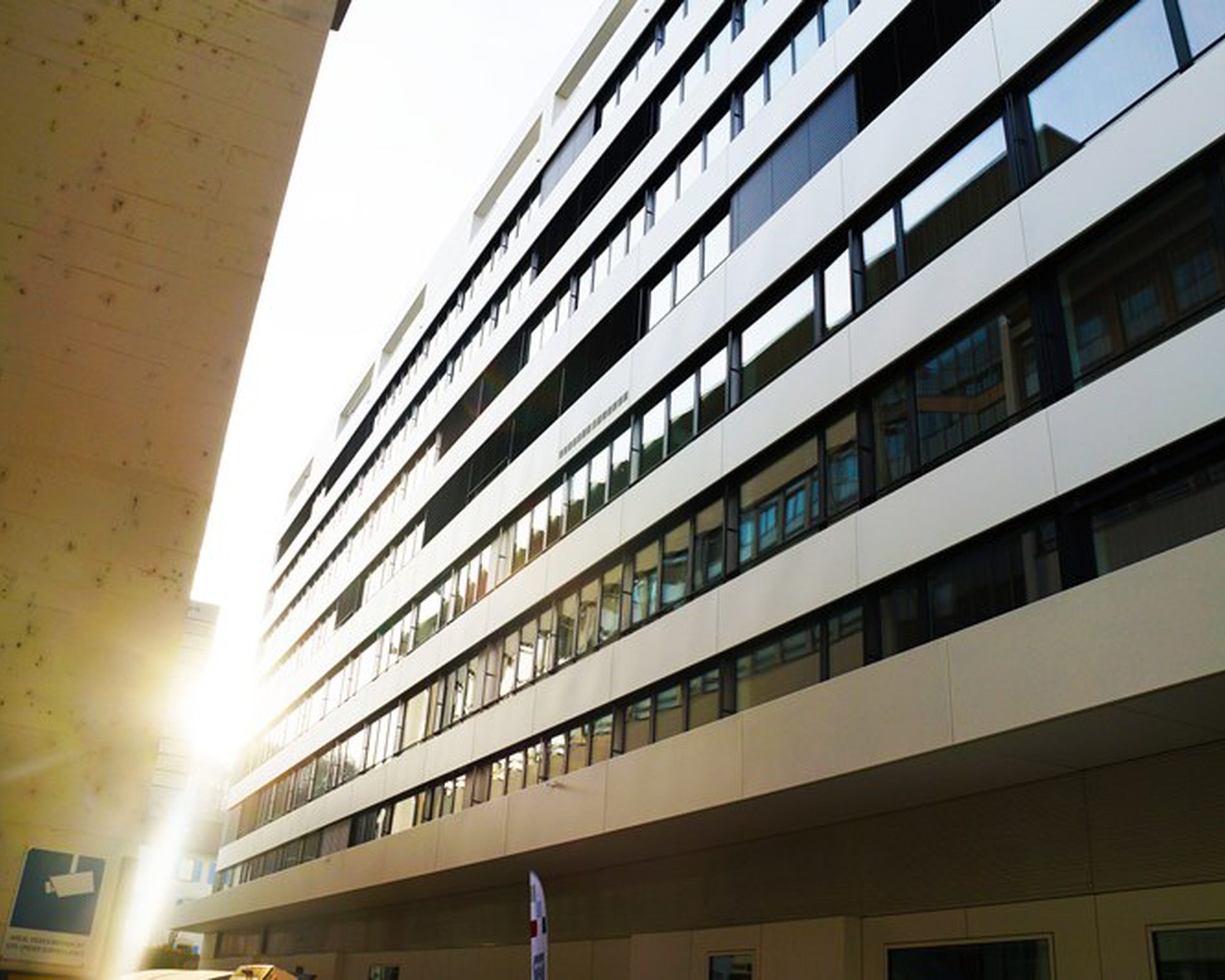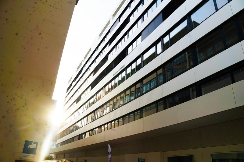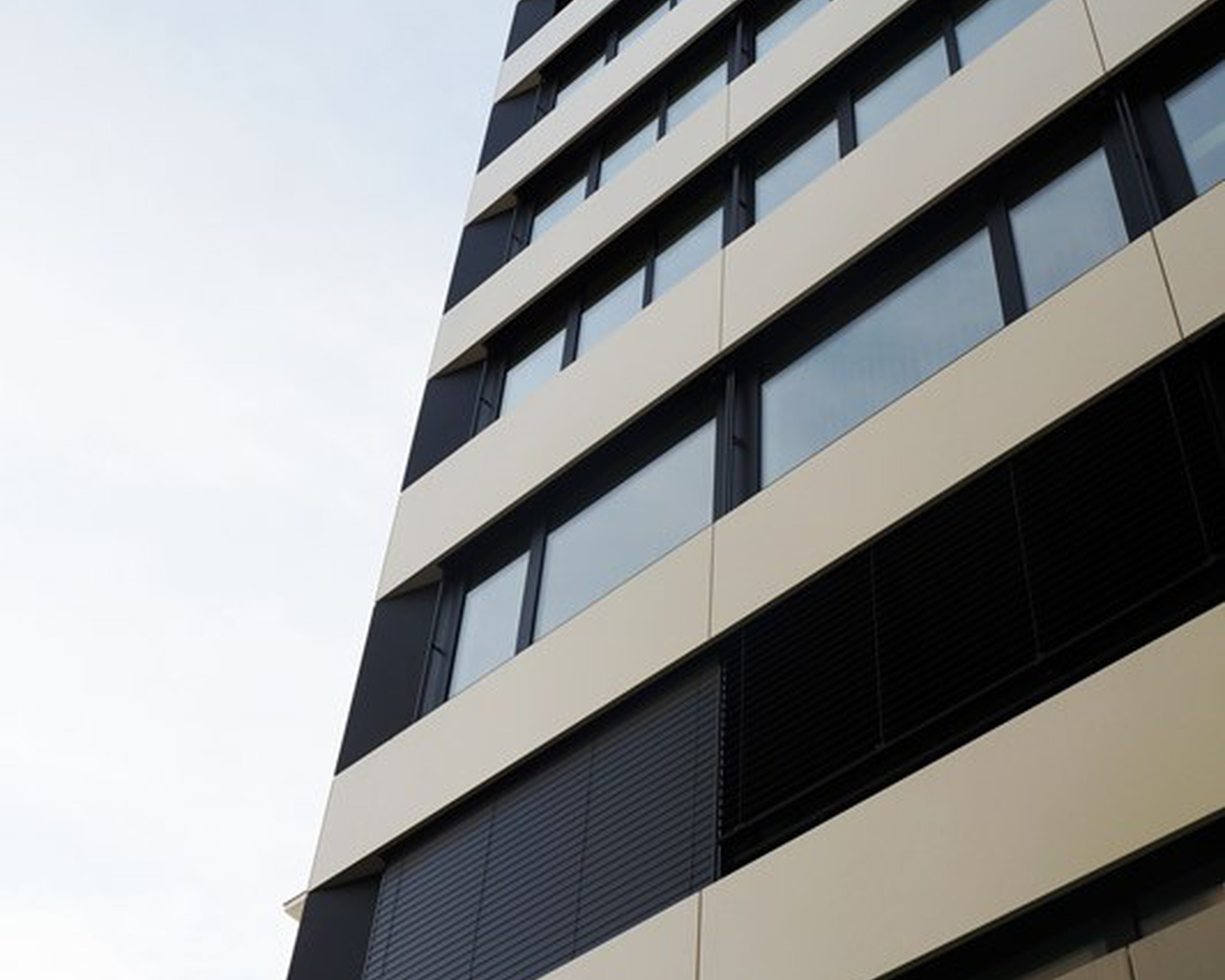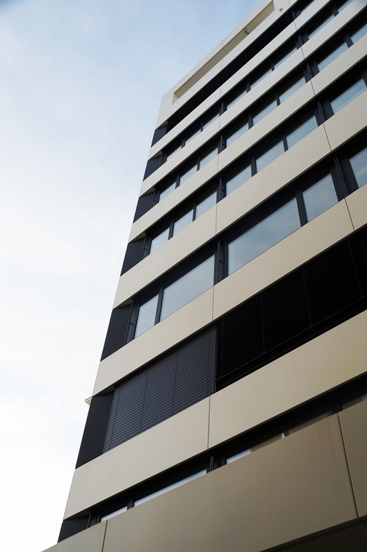 Der Hotel- und Wohnkomplex wurde vom Erdgeschoss bis 8. Obergeschoss mit einer hinterlüfteten pulverbeschichteten Aluminium-Blechfassade mit hochwertiger Dämmung verkleidet. Im Erdgeschoss wurden Metalltüren mit Glas- oder Paneel-Füllungen als Zugang in die Hotellobby oder Wohnungen sowie Metallfenster eingesetzt. Das darüber liegende Vordach mit umlaufender Aluminium-Blechblende und Untersicht schützt die Eingänge. Die Holzmetall-Fenster und Hebeschiebetüren vom 1. - 8. Obergeschoss mit dunklen Rafflamellenstoren schliesst die Fassade ab.