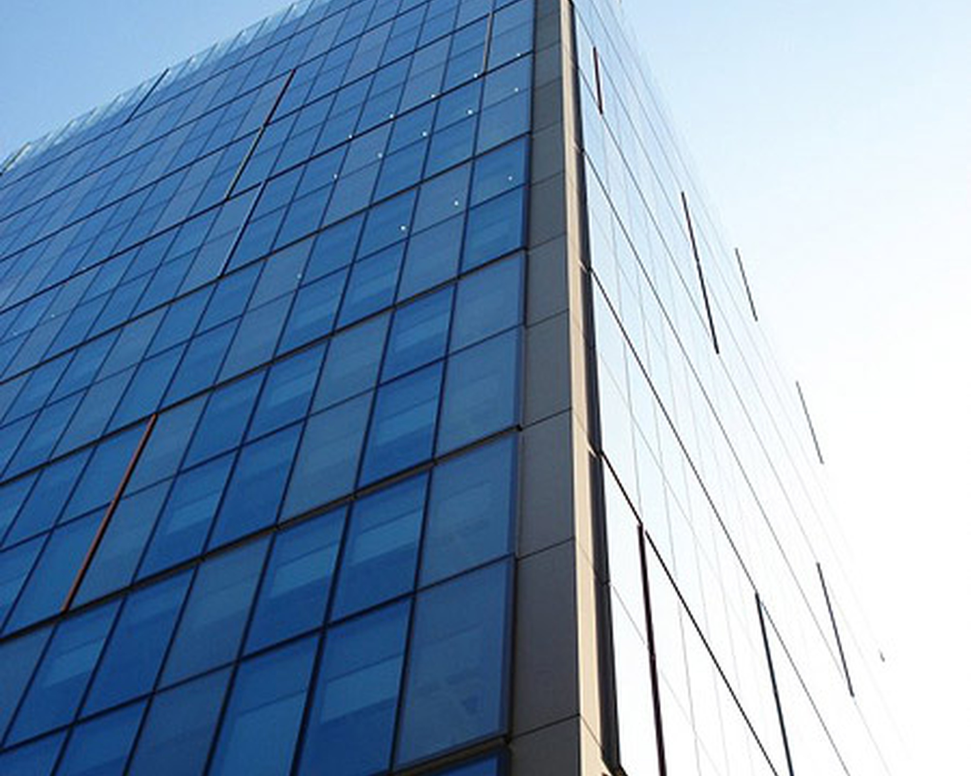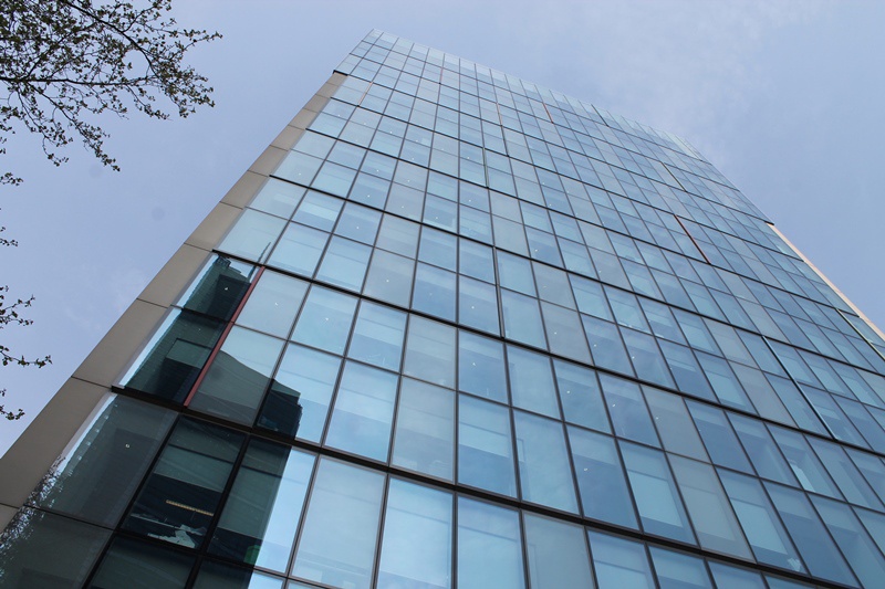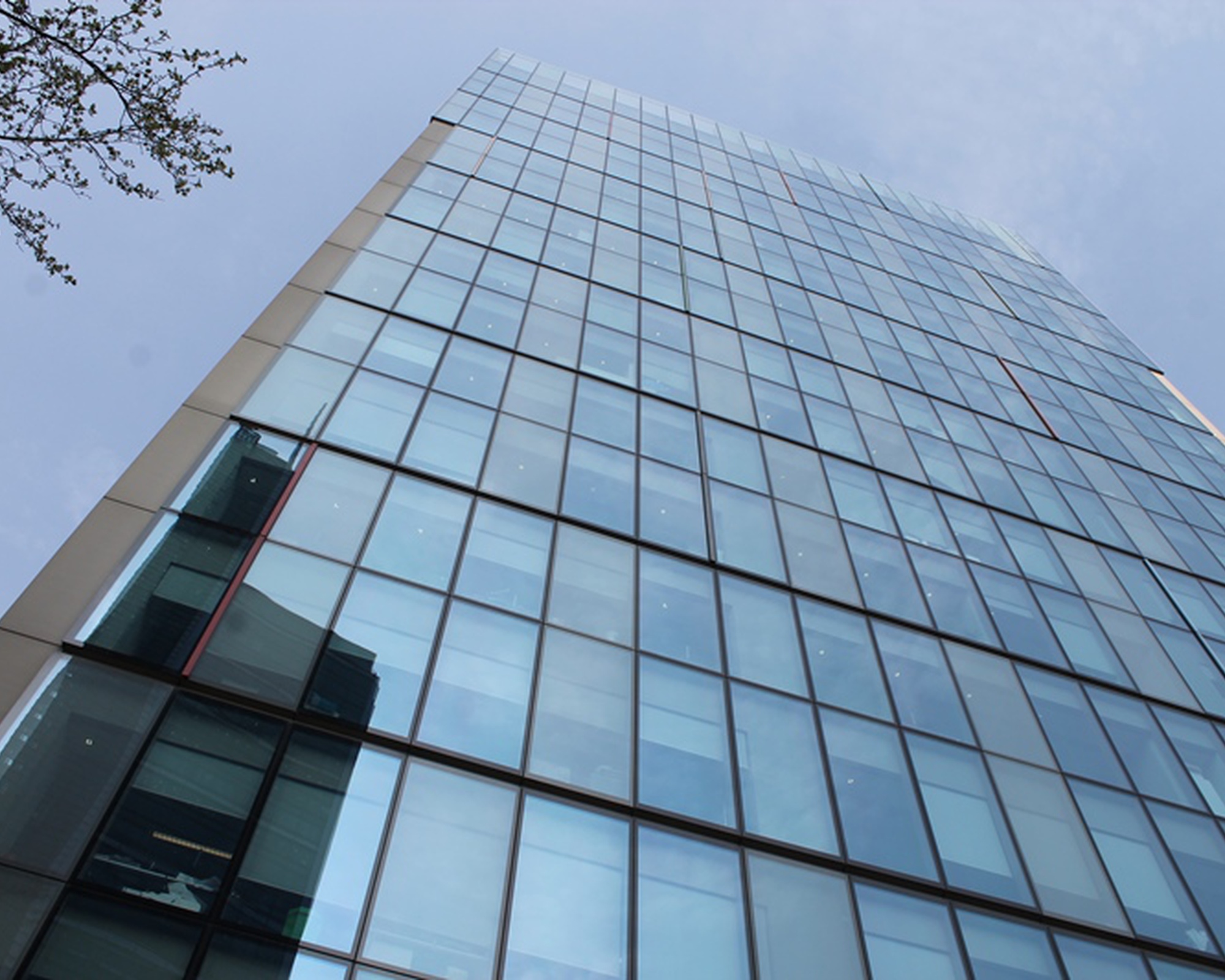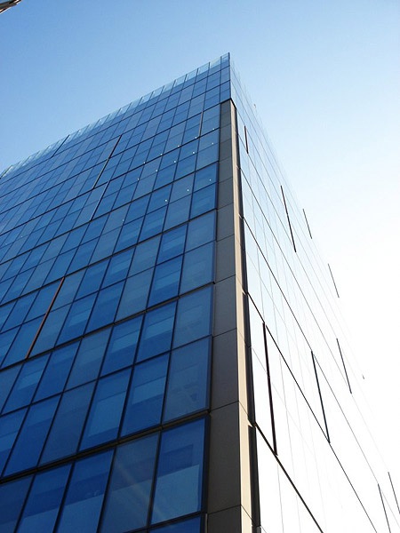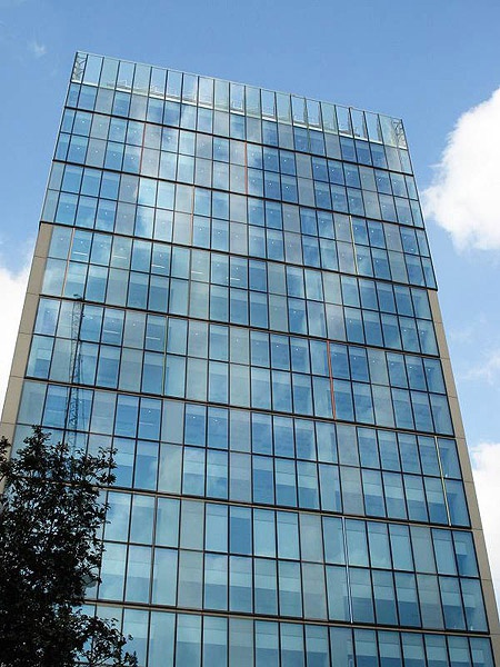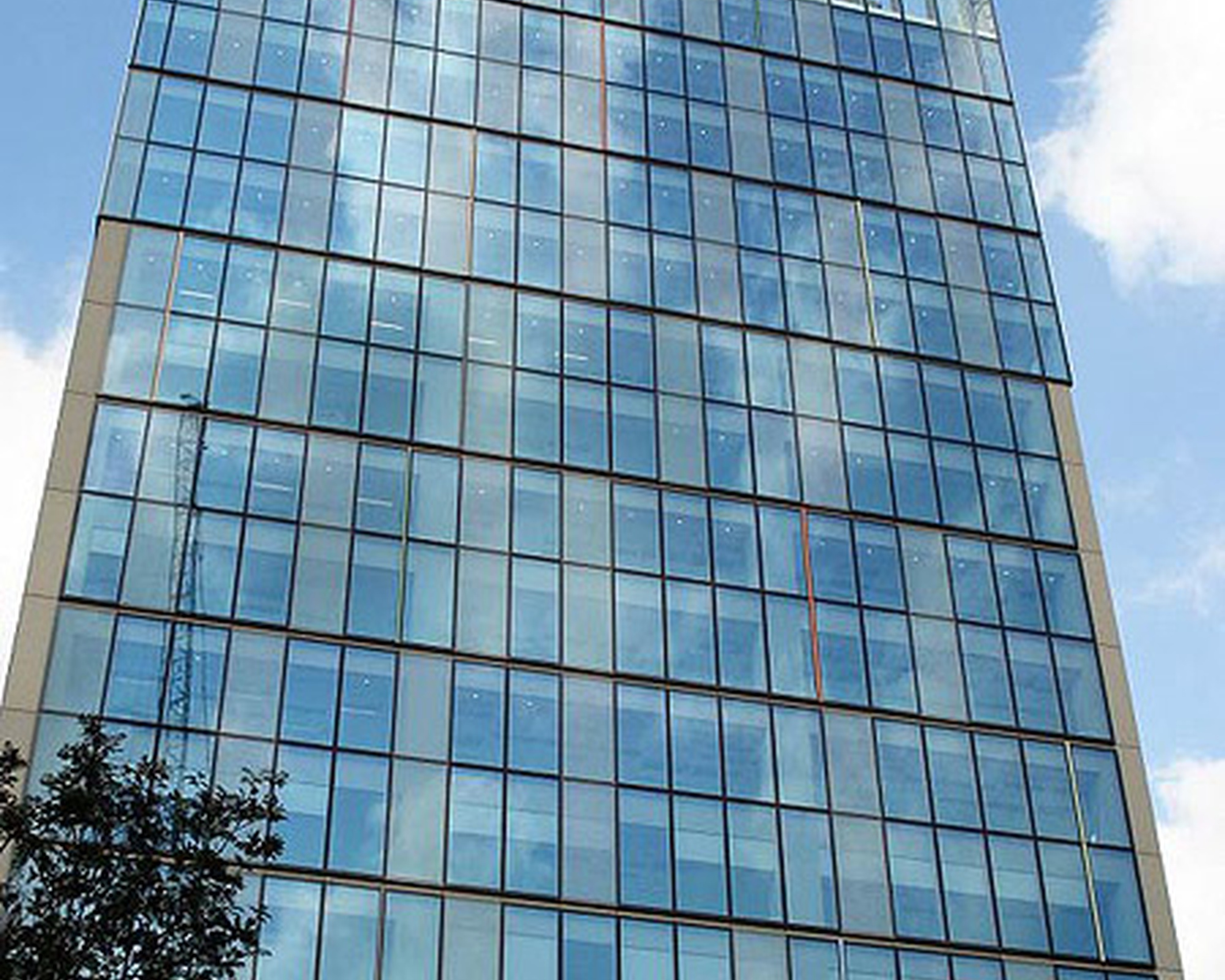 Hochhaus mit Elementfassade, Ganzglas-Dachaufbau