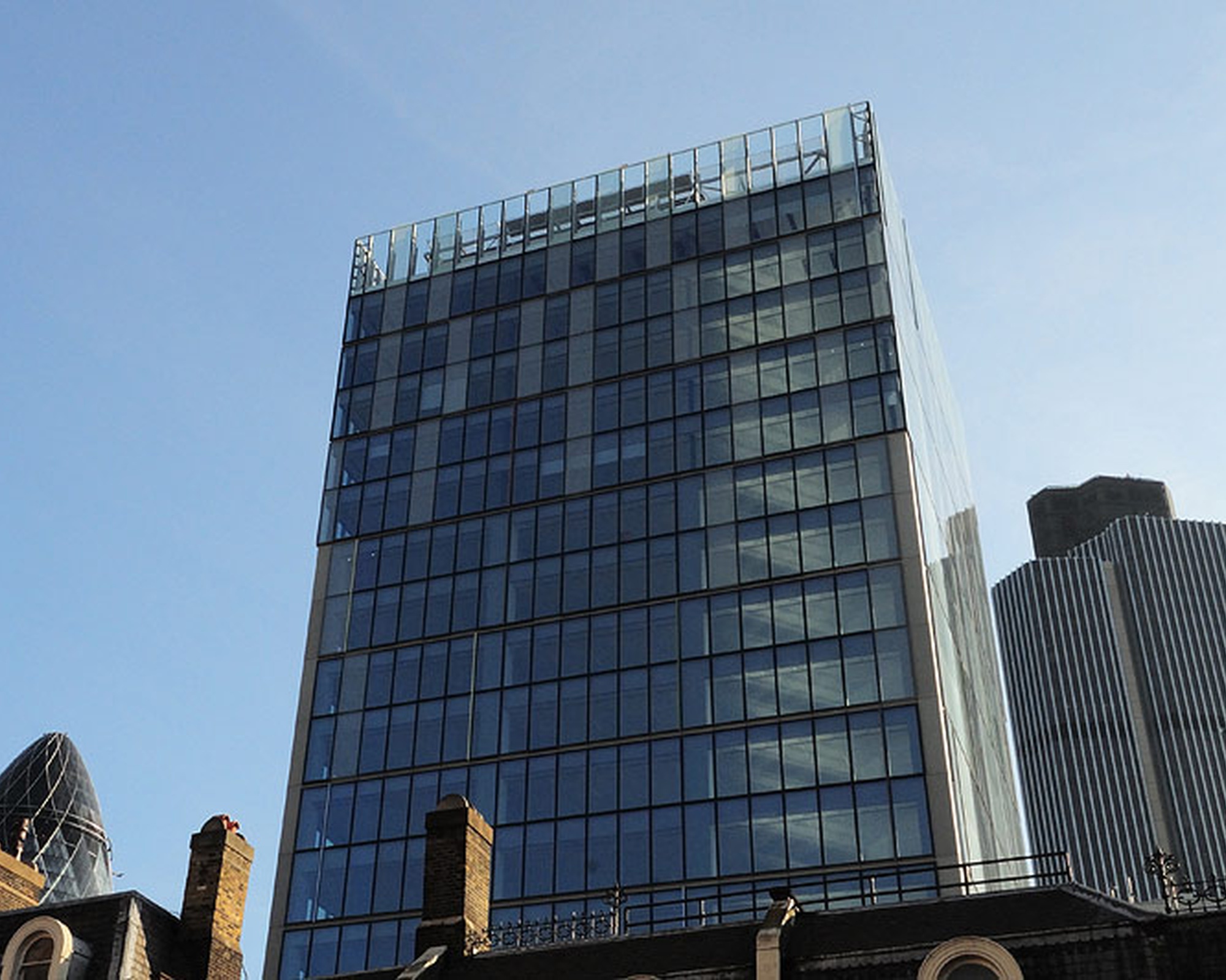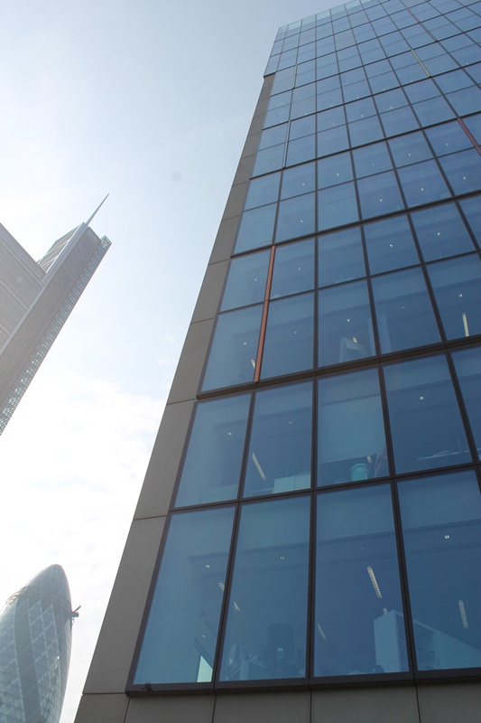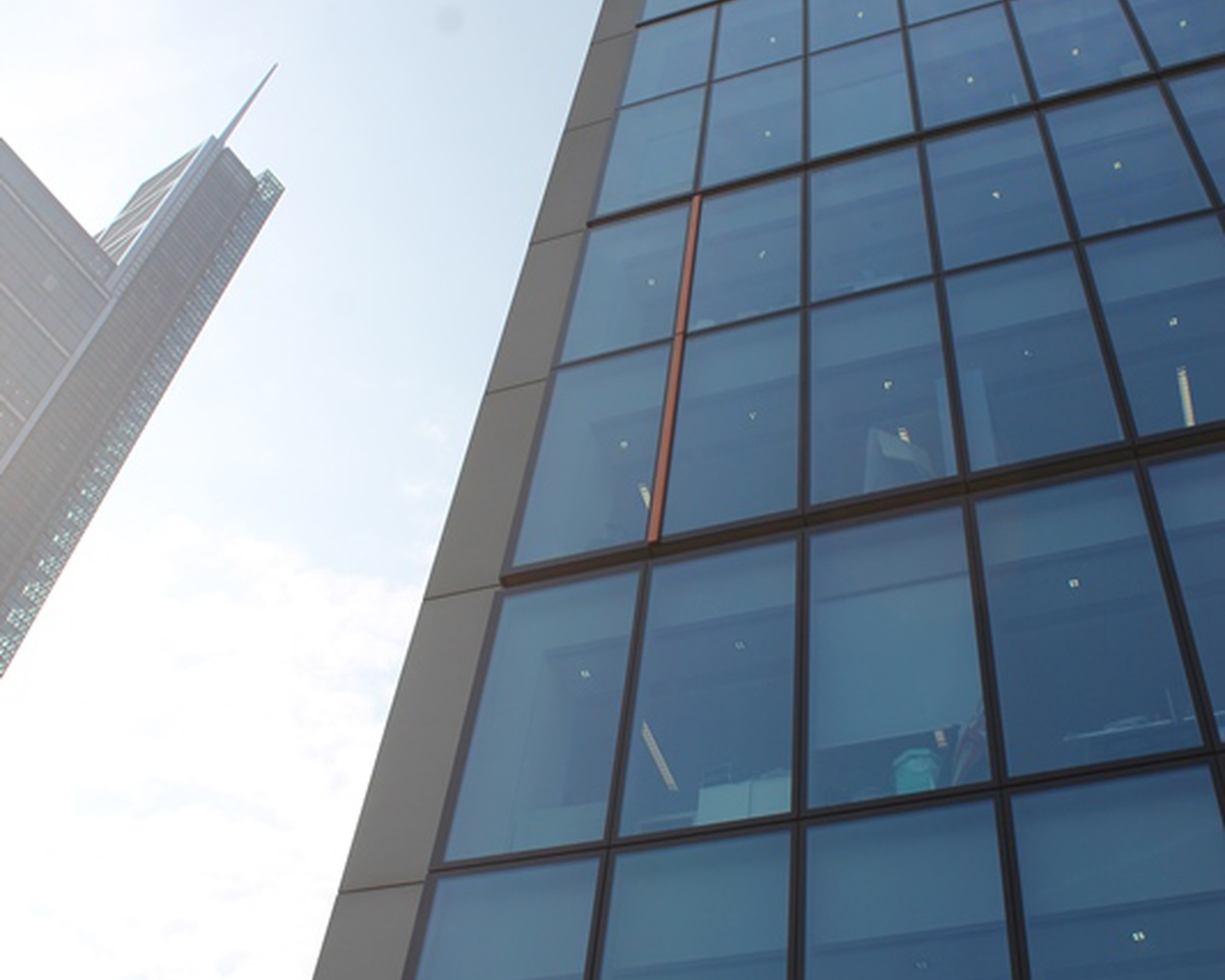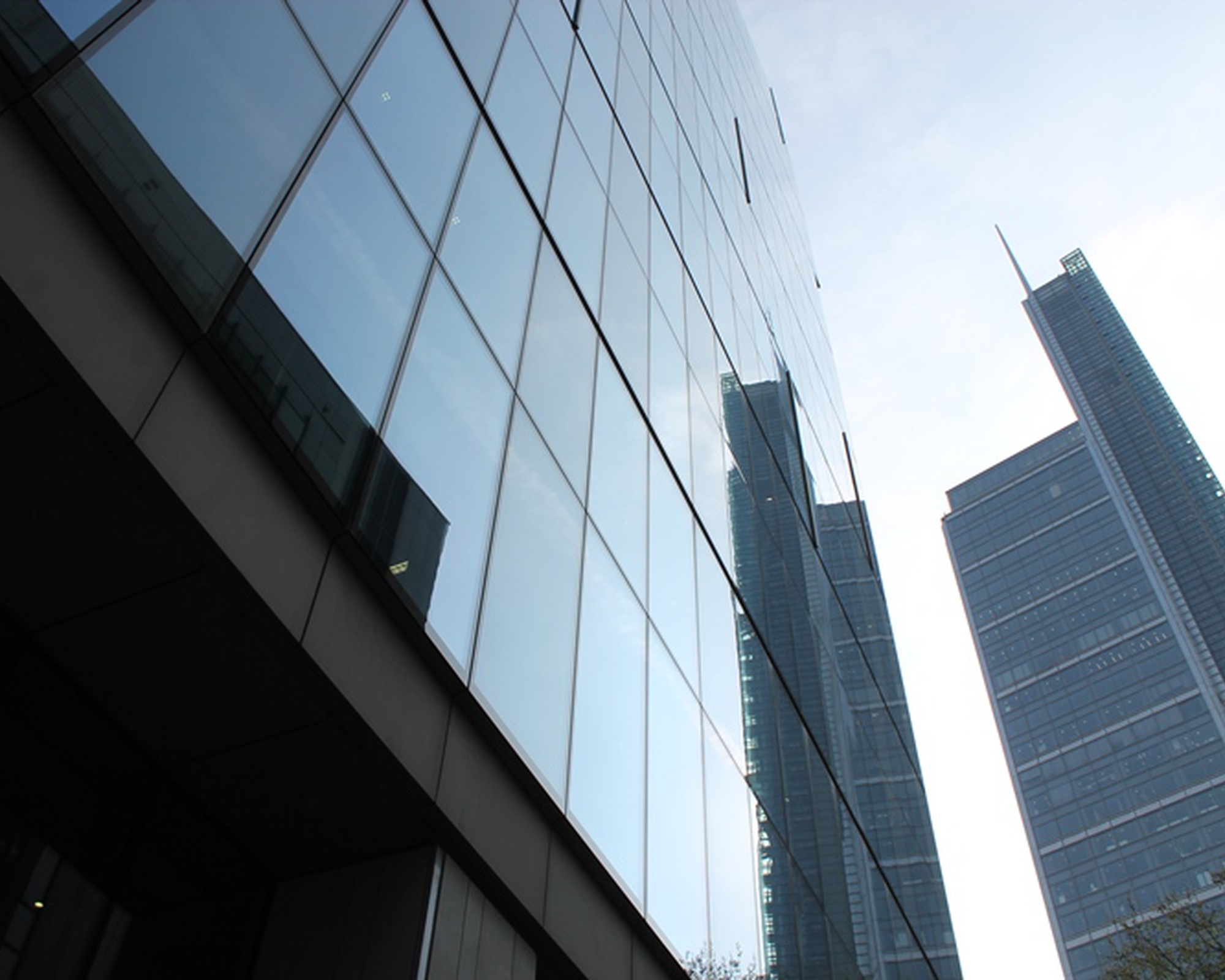 Hochhaus mit Elementfassade, Ganzglas-Dachaufbau