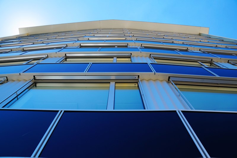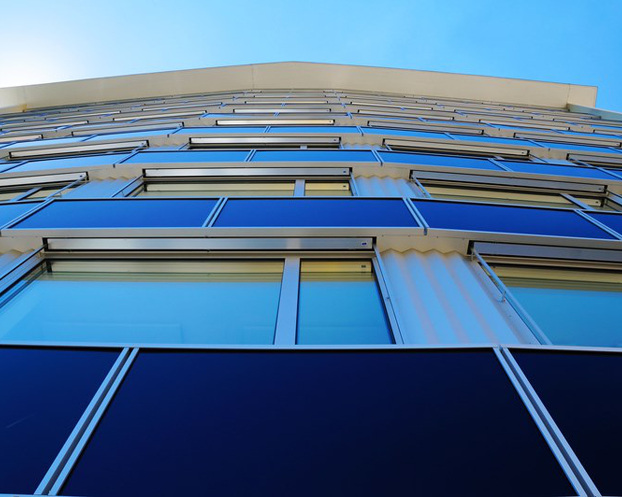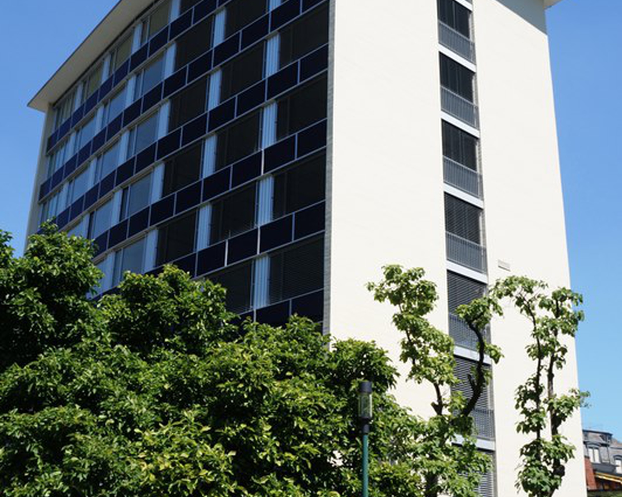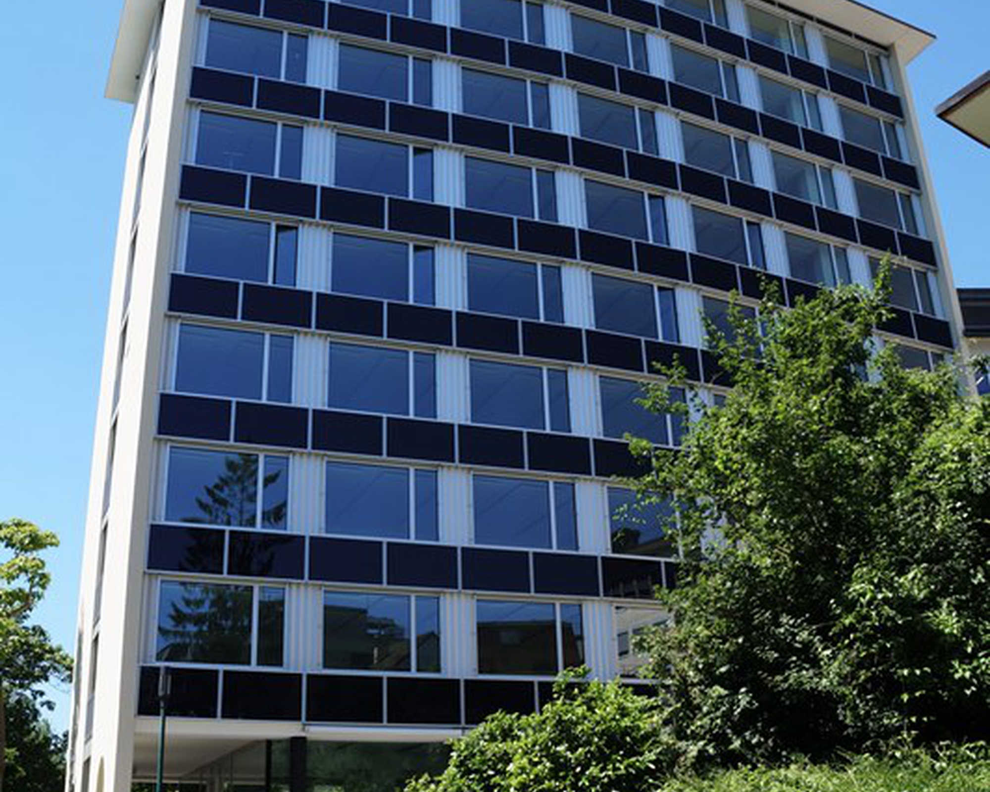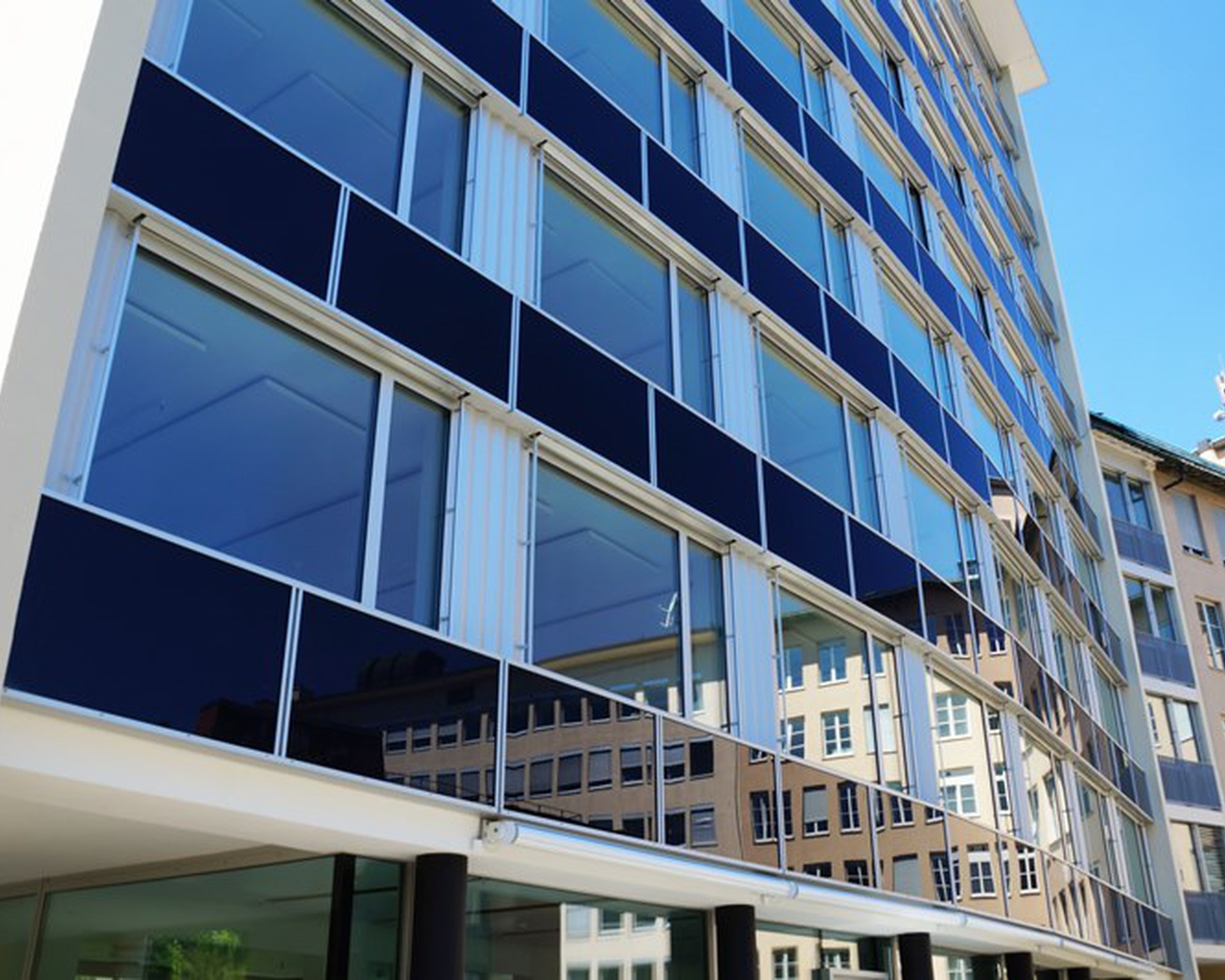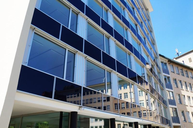 Fensterbänder mit Aluminiumprofilen und 3-fach Isolierverglasung. Sonnenschutz Aluminium-Verbundraffstoren. Brüstungen isoliert und mit emaillierten ESG-Gläser verkleidet.