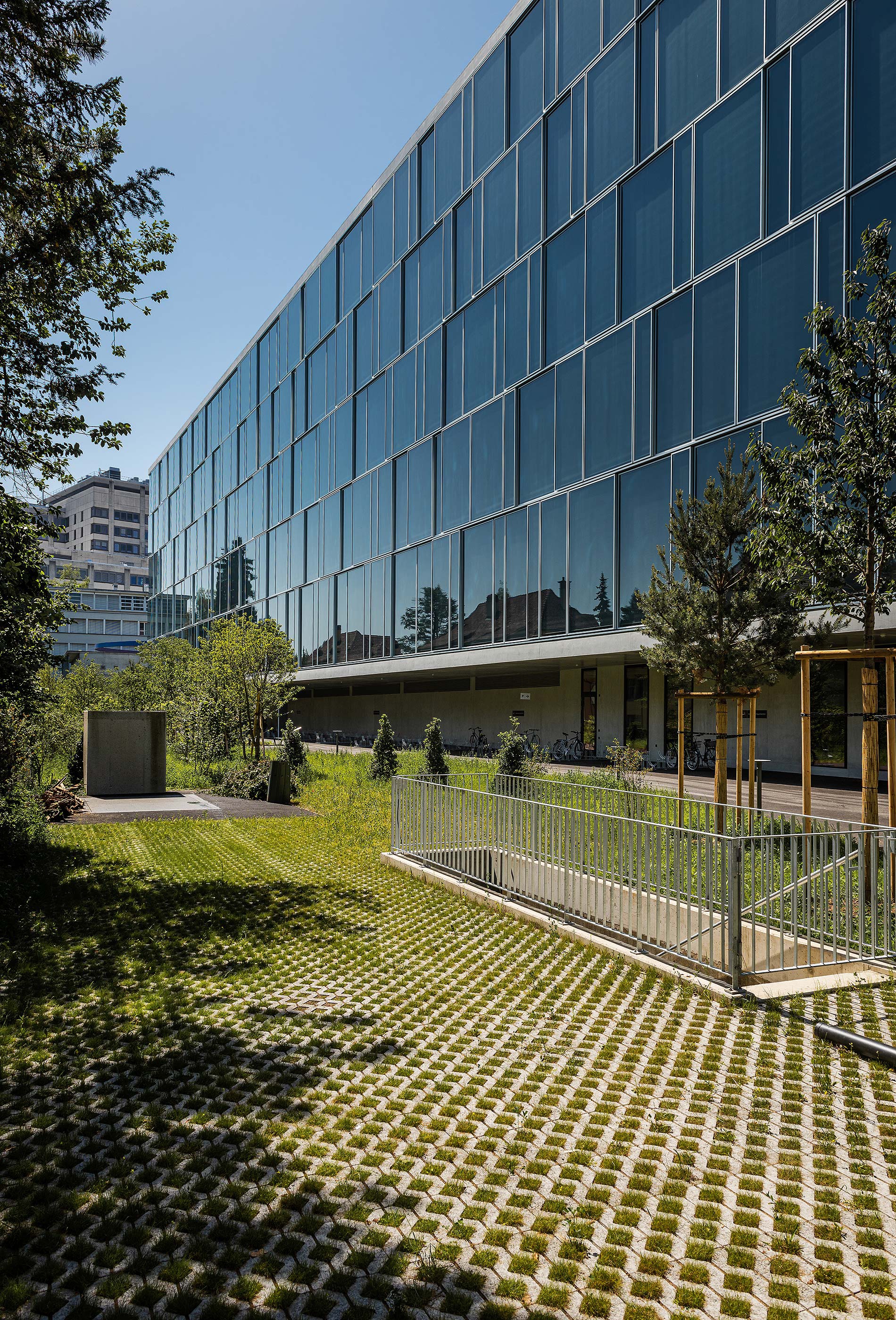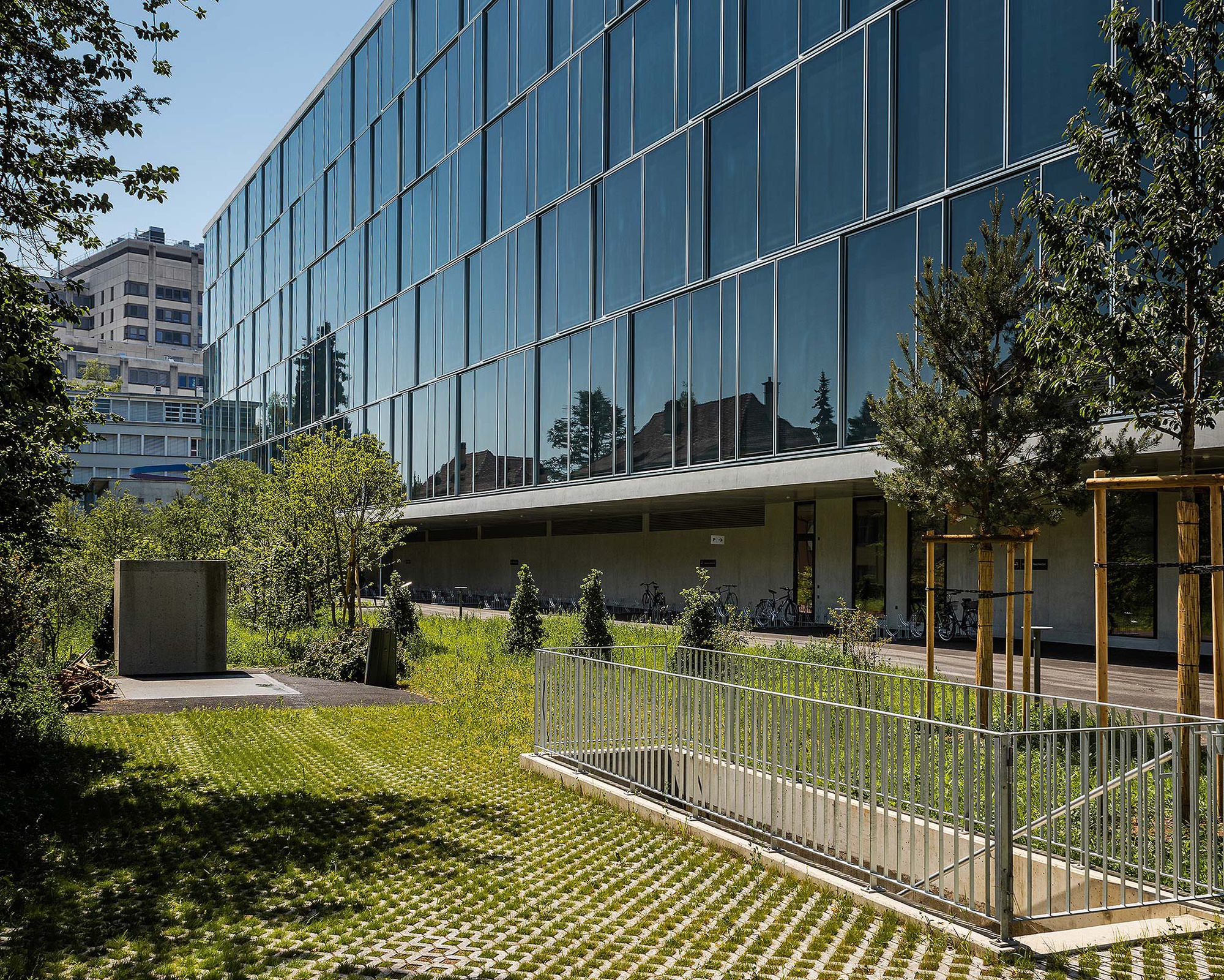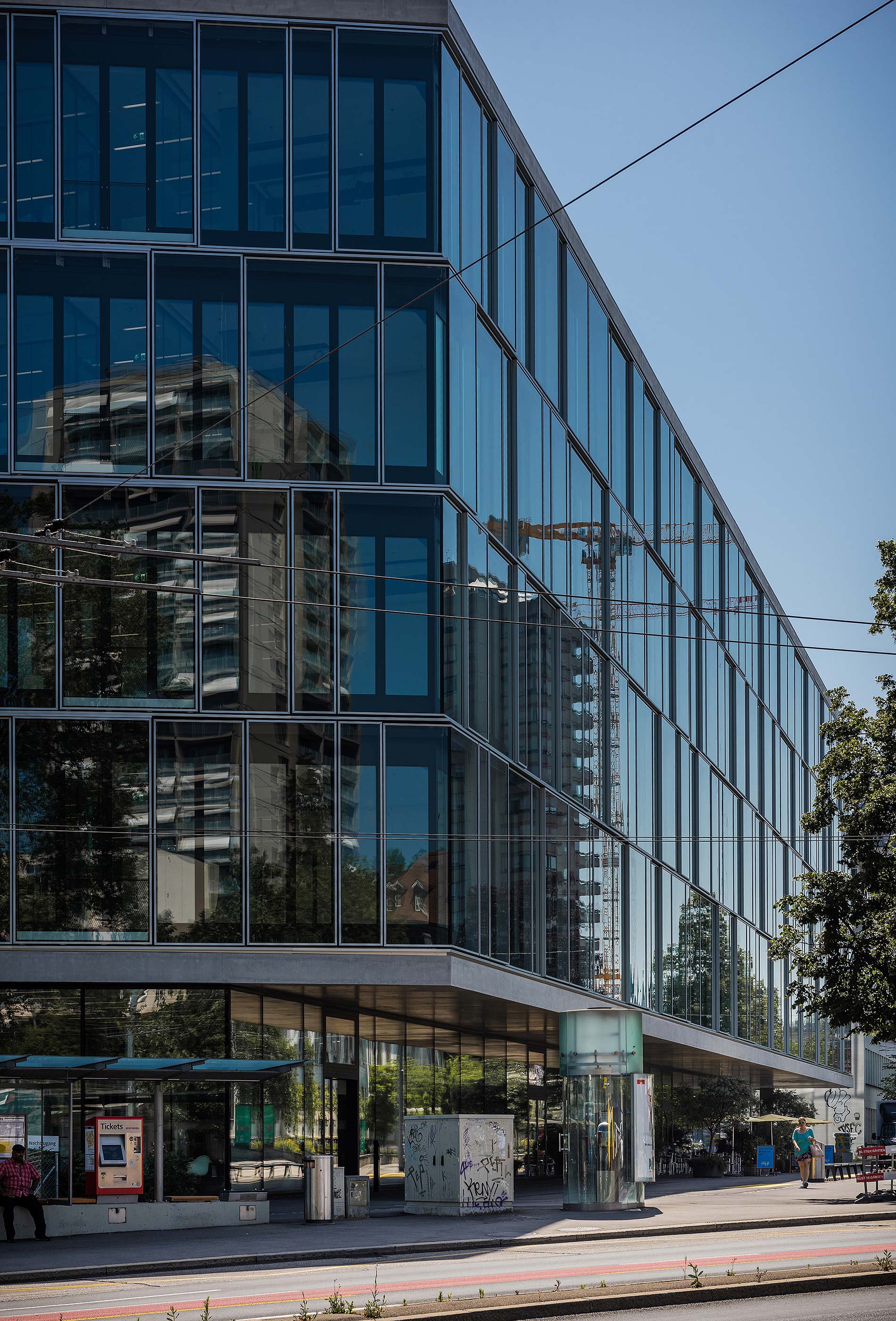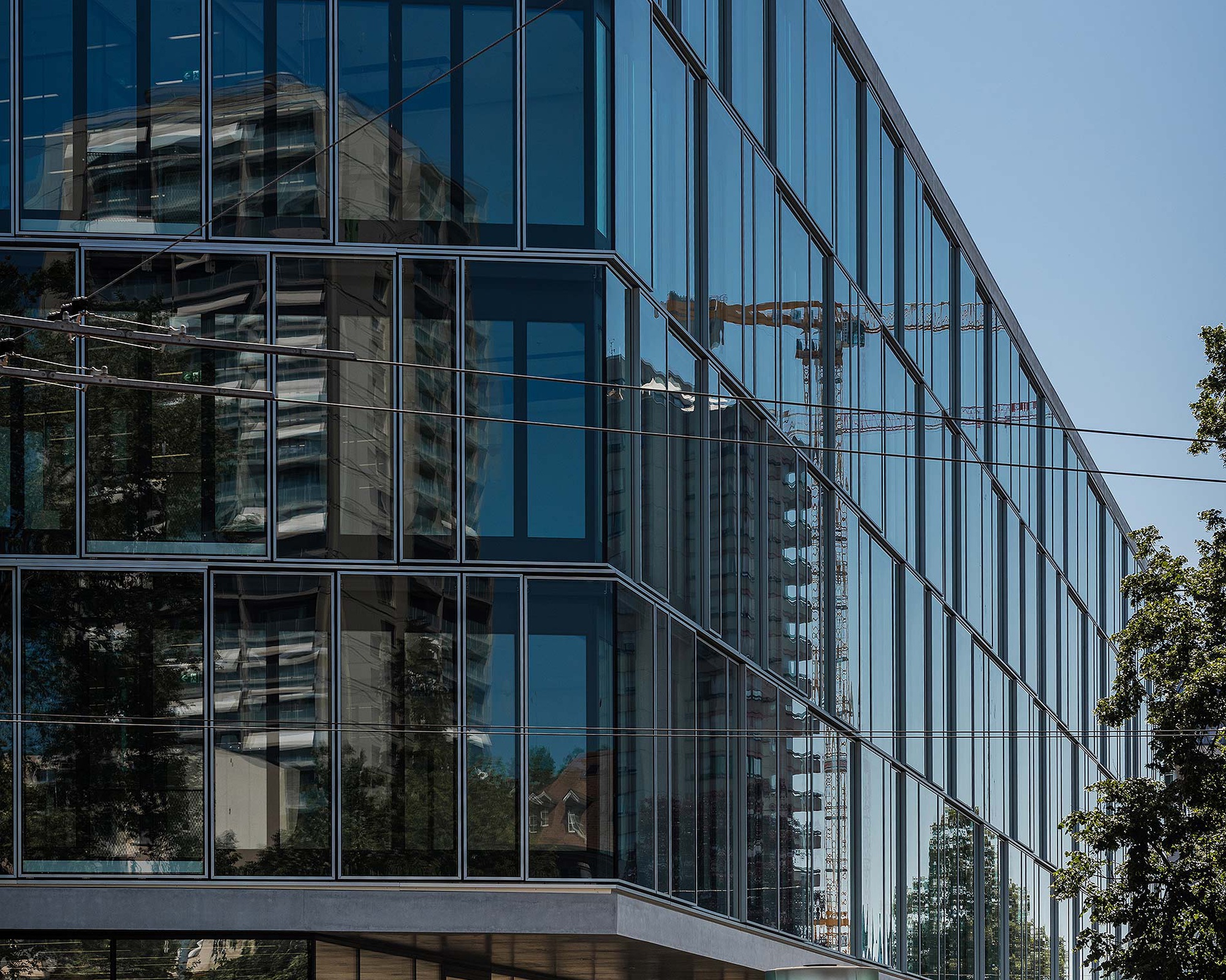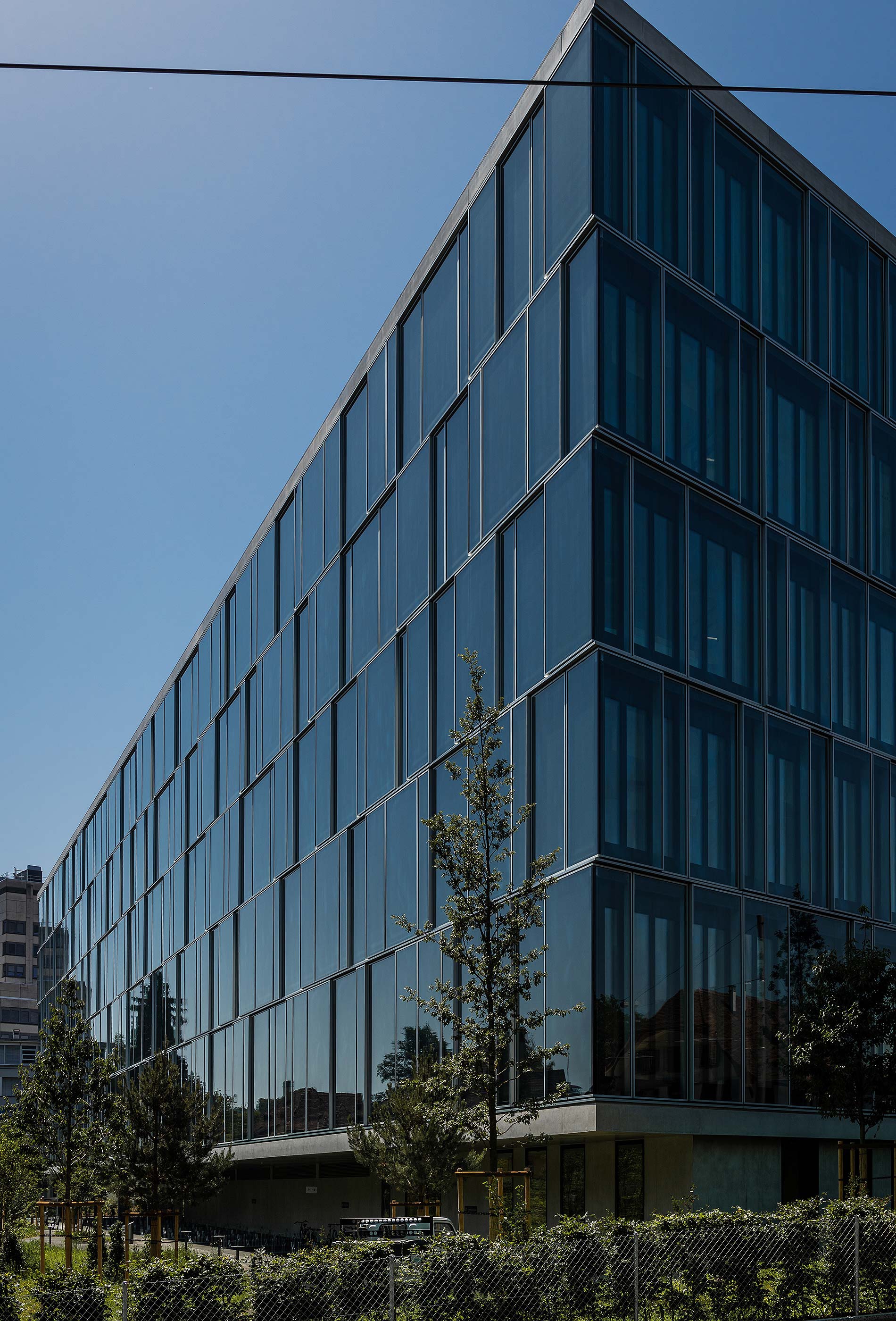 Die Doppelhautfassade besteht innen aus thermisch getrennten und schwarz anodisierten Drehflügelfenstern, sowie aussen aus farblos anodisierten Aluprofilen, welche dem textilen Sonnenschutz den Platz bieten. Süd-, west- und ostseitig fungieren innen zusätzliche Rollos als Blendschutz. Die, in die Fassade integrierten, RWA-Drehflügel der Innenhaut korrespondieren mit Schiebeelemente in der Aussenhaut.