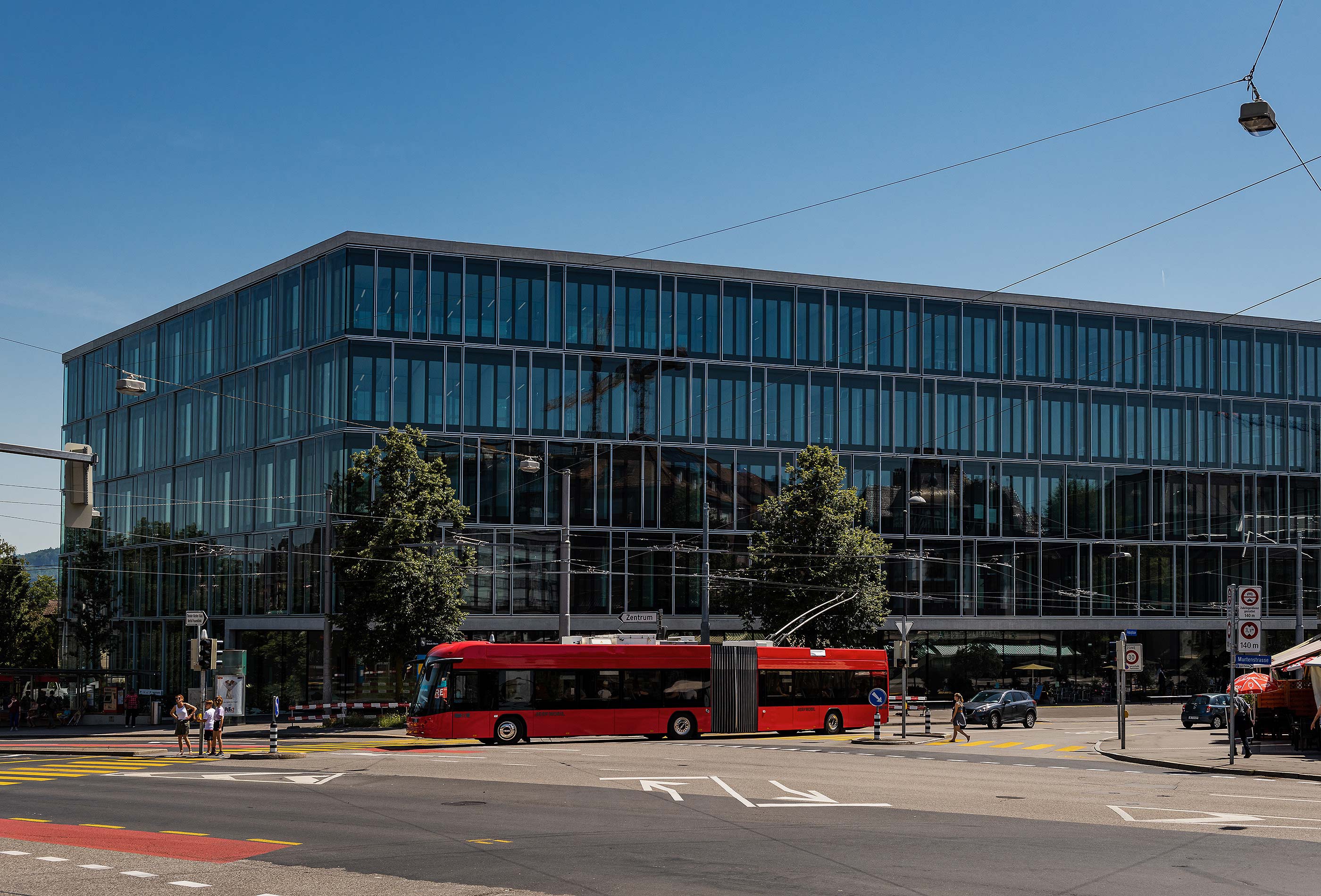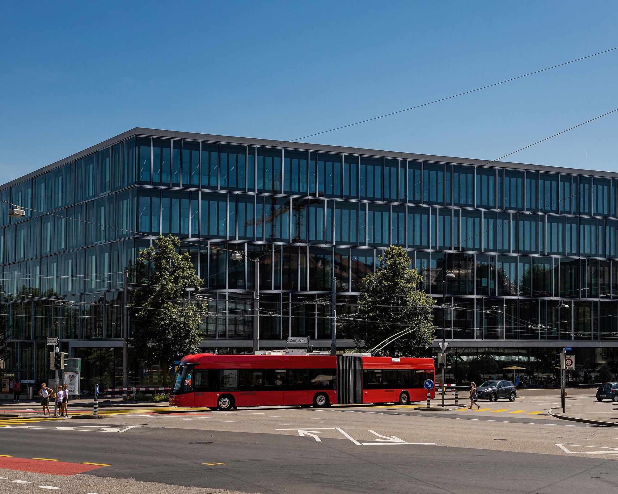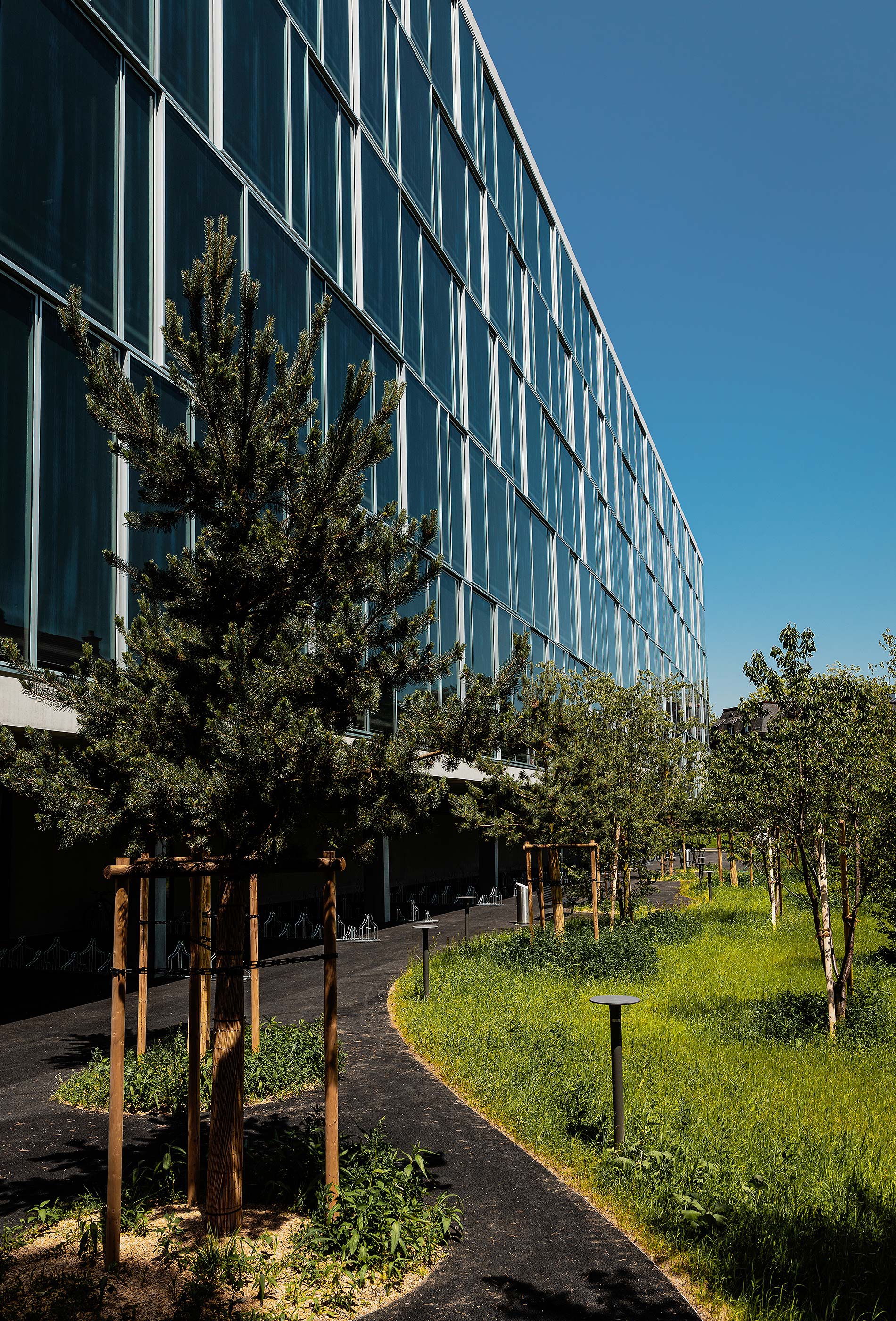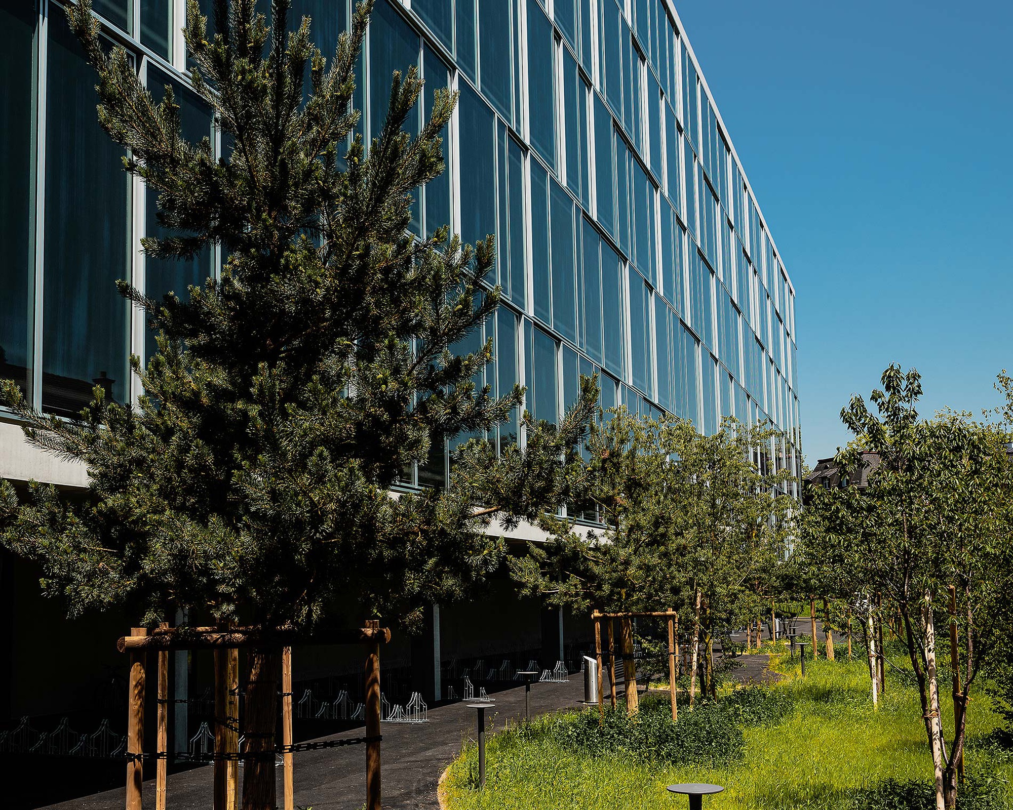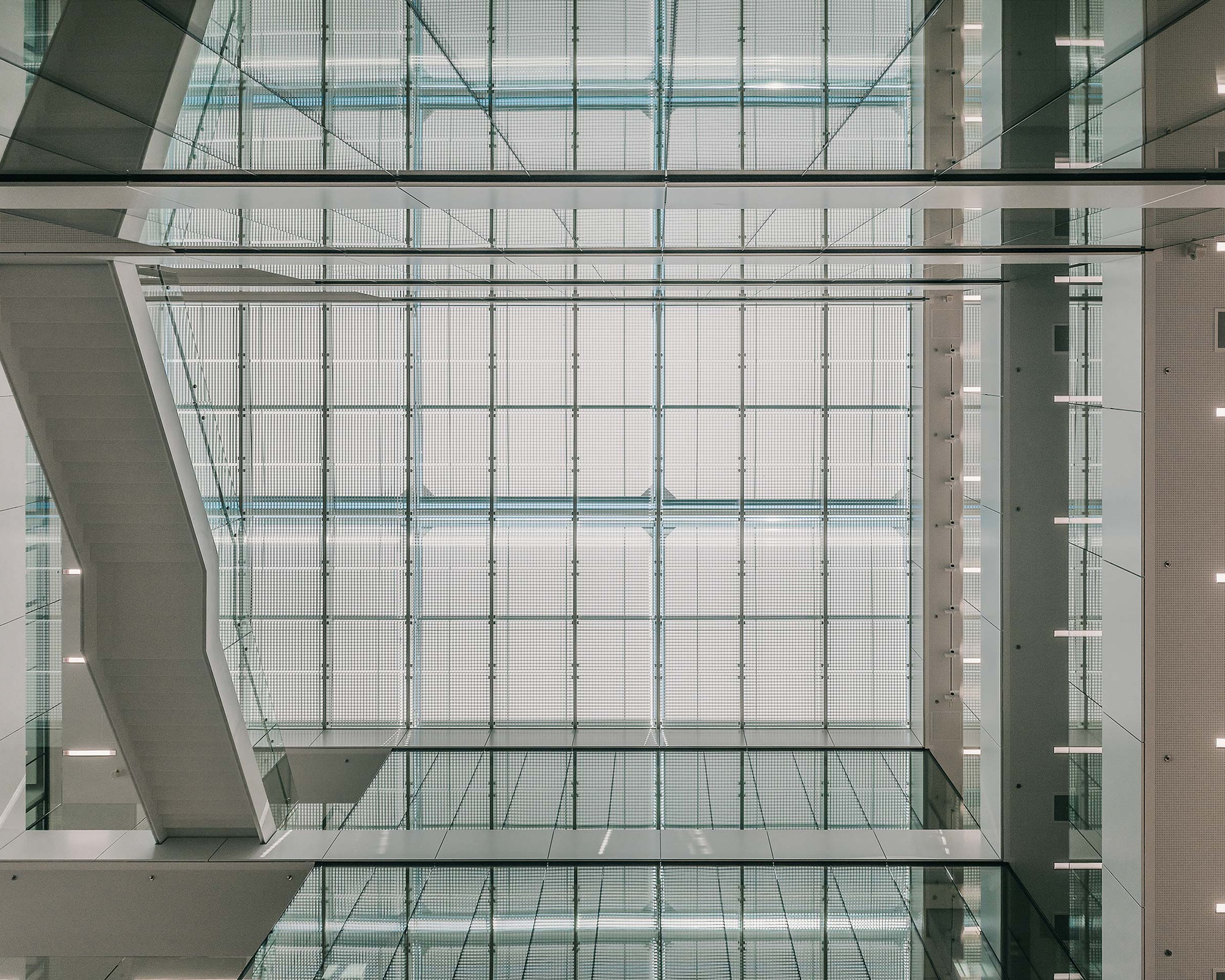 Die Doppelhautfassade besteht innen aus thermisch getrennten und schwarz anodisierten Drehflügelfenstern, sowie aussen aus farblos anodisierten Aluprofilen, welche dem textilen Sonnenschutz den Platz bieten. Süd-, west- und ostseitig fungieren innen zusätzliche Rollos als Blendschutz. Die, in die Fassade integrierten, RWA-Drehflügel der Innenhaut korrespondieren mit Schiebeelemente in der Aussenhaut.