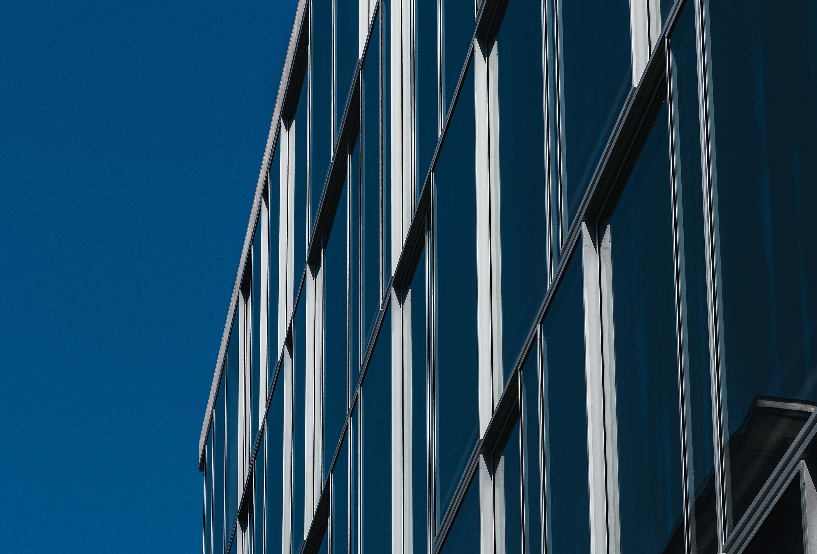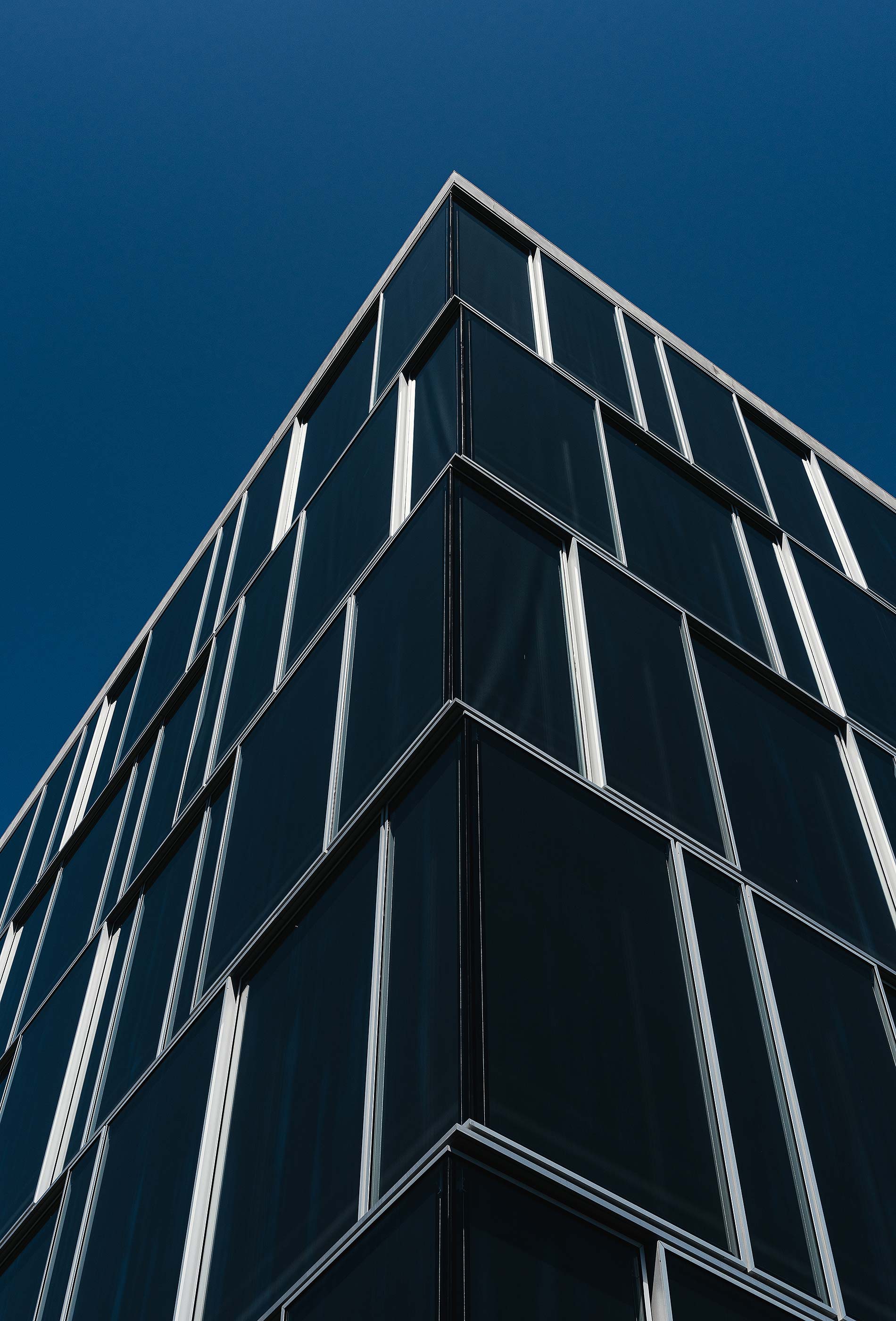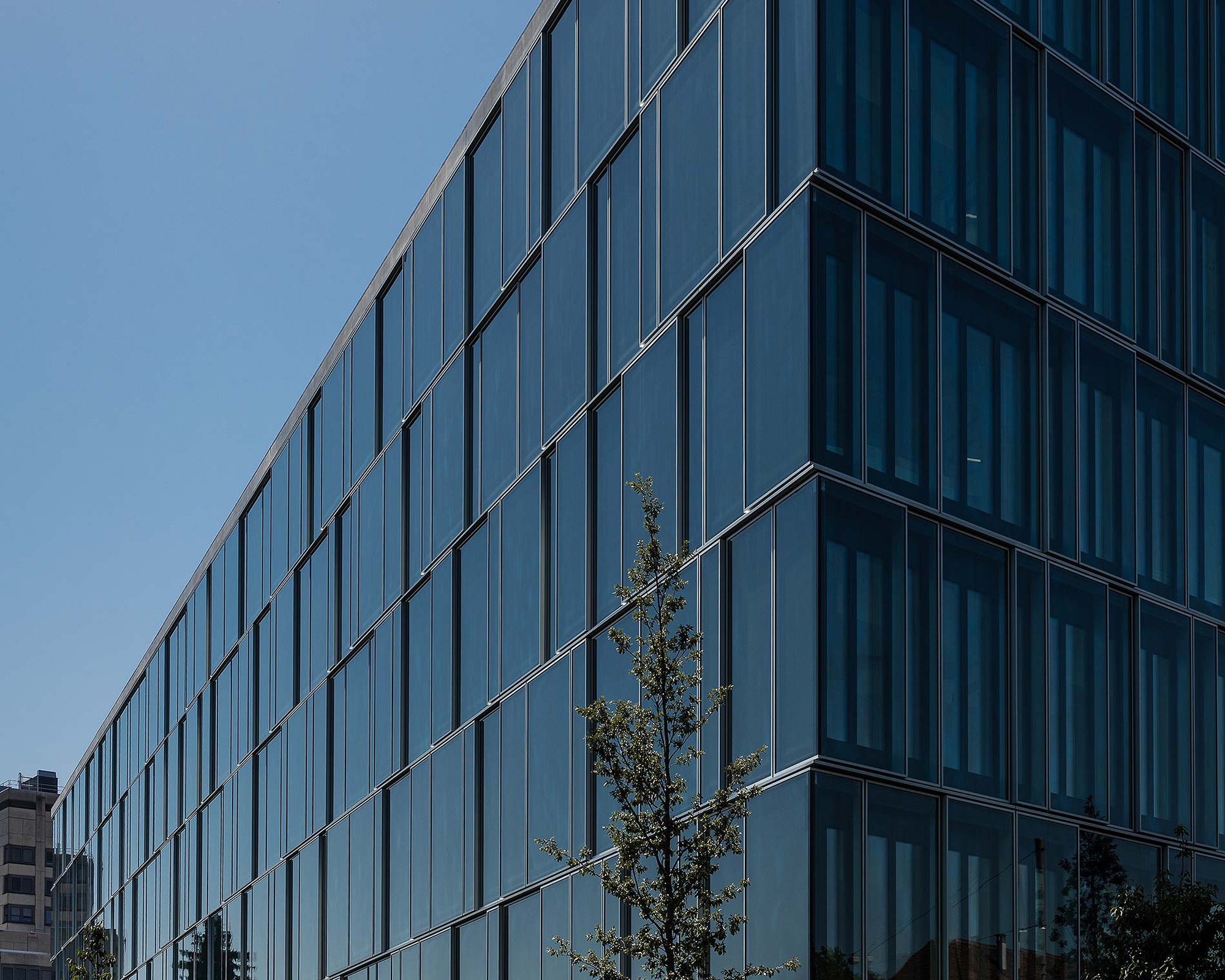 Die geschosshohe, schwarz anodisierte Aluminium Pfosten-Riegel-Konstruktion enthält zwei Windfänge als Eingangsbereiche mit automatischen Schiebe- und Fluchttüren.