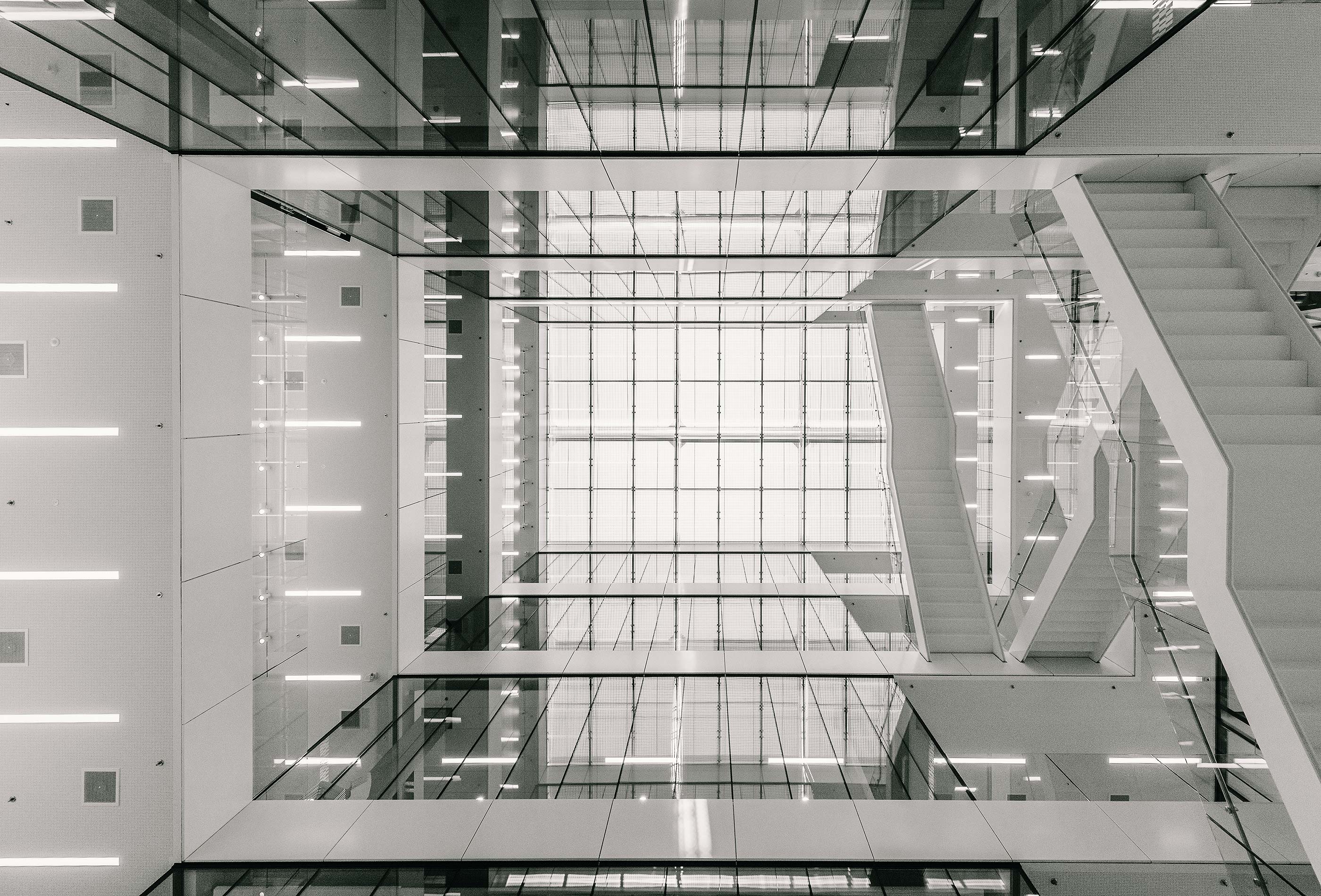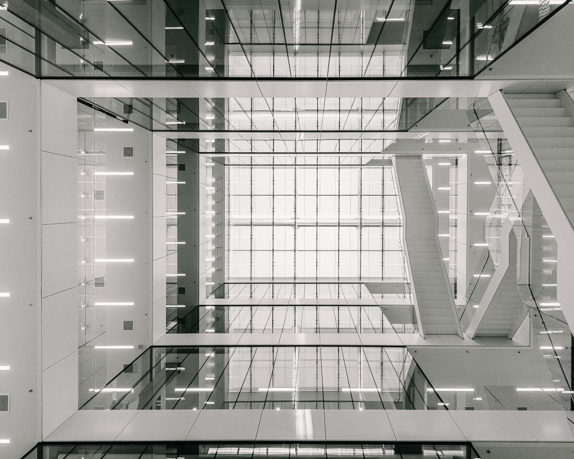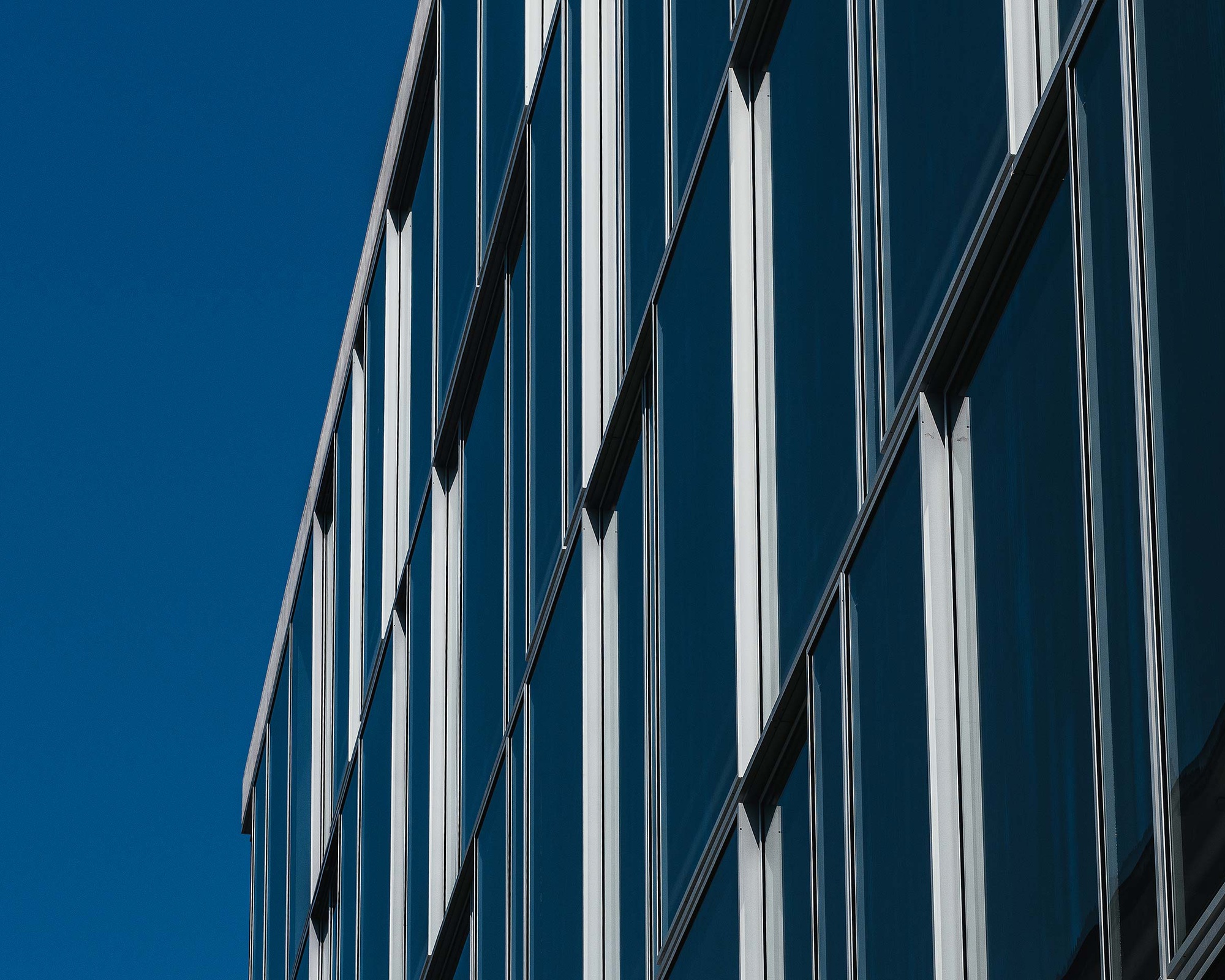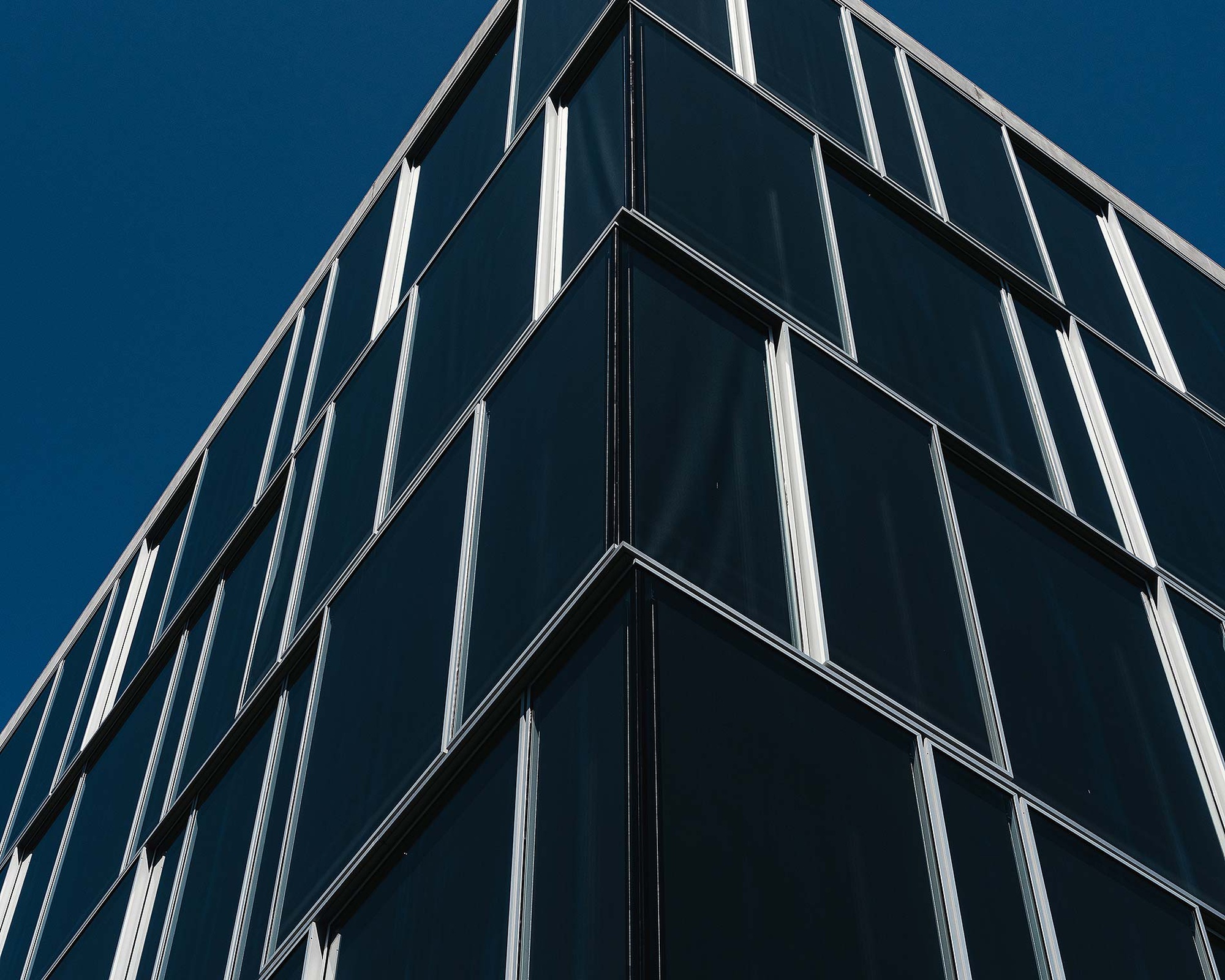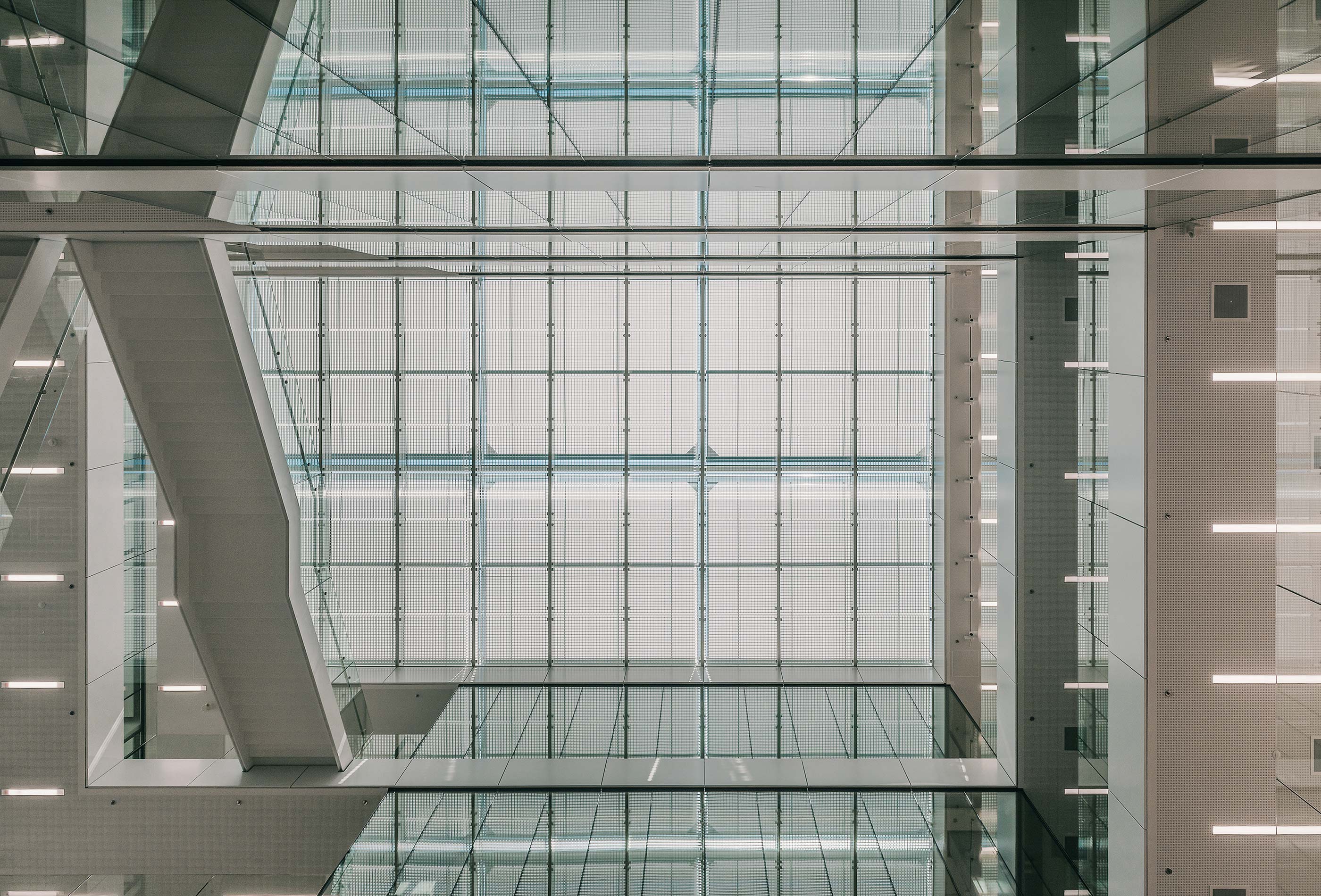 Eine weiss pulverbeschichtete und geschweisste Stahlblechkonstruktion trägt das farblos anodisierte Pfosten-Riegel-System mit durchbruchsicherem Glas und horizontal liegender Beschattung.