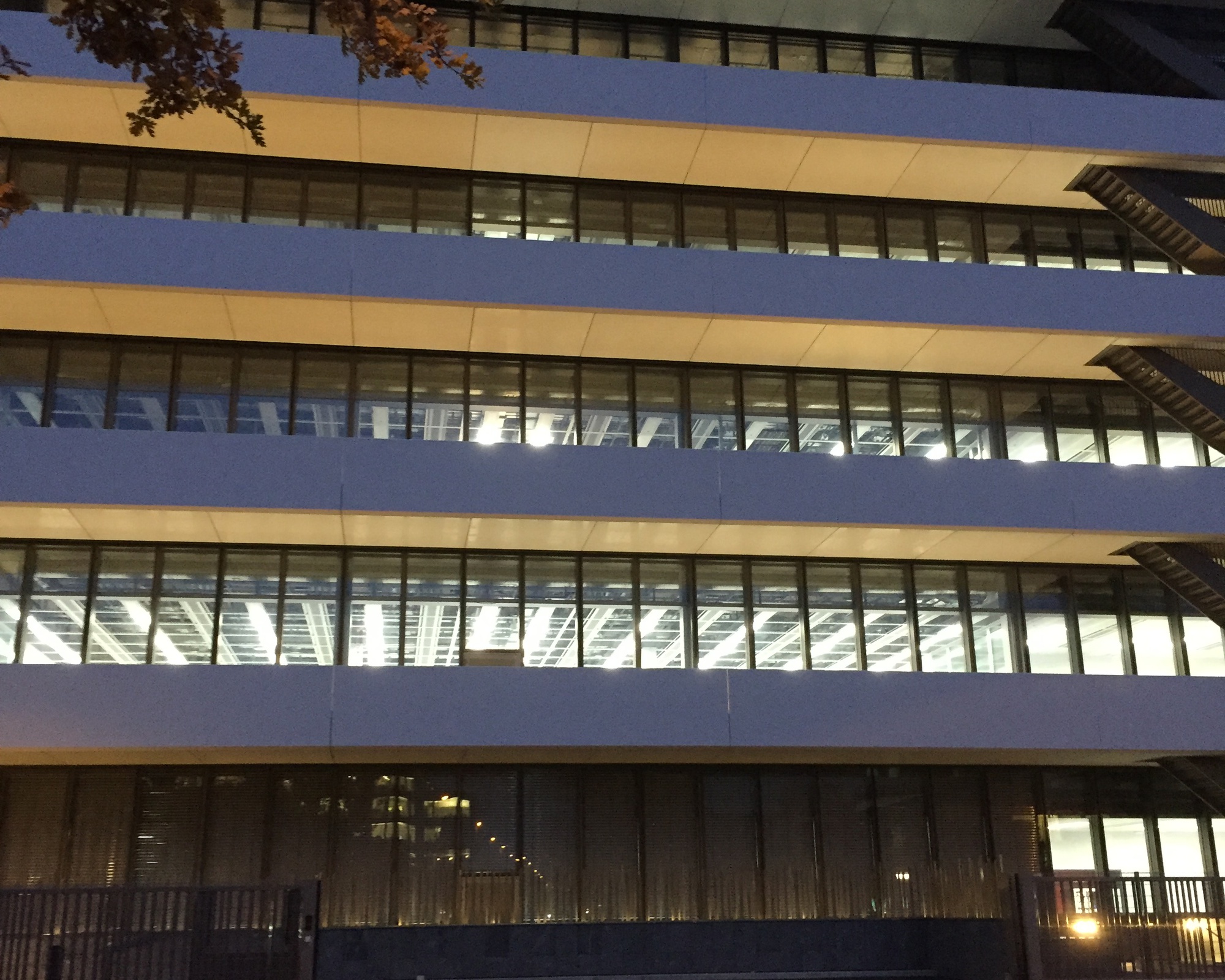 Der Brüstungsbereich ist mit einem vorfabrizierten SSG verklebten und beschichteten ESG-Glas verkleidet.