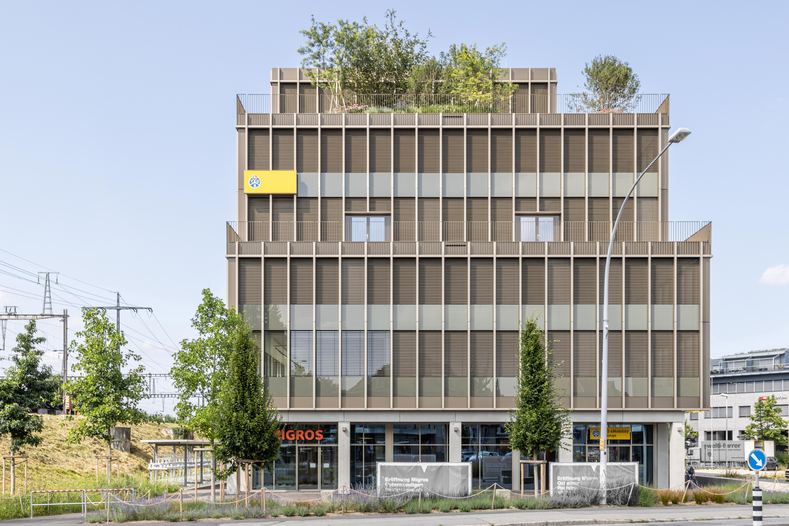 Die rund 5900 m2 Elementfassade umfasst 6 Obergeschosse mit Loggias und Terrassen. Zwischen den aussen aufgesetzten Lisenen befinden sich der Sonnenschutz und die SSG verklebten Brüstungsgläser mit Siebdruck sowie rund 220 Meter integrierte Staketengeländer. Dazu kommen 7 Türen für den Zugang zu den Loggien, Terrassen und Technikaussenräumen. Die Erdgeschossfassade besteht aus einer Pfosten-Riegel-Konstruktion von zirka 980 m2 Fläche mit aufgesetzten glasfaserverstärkten Betonelementen. 260 m2 Untersichtsbleche, drei Windfangeingänge (Ladenräumlichkeiten) mit Schiebetüren sowie 3 Drehflügeltüren für die Haupt- und Nebeneingänge und 1 Servicetor im Erdgeschoss schliessen die Fassade ab.