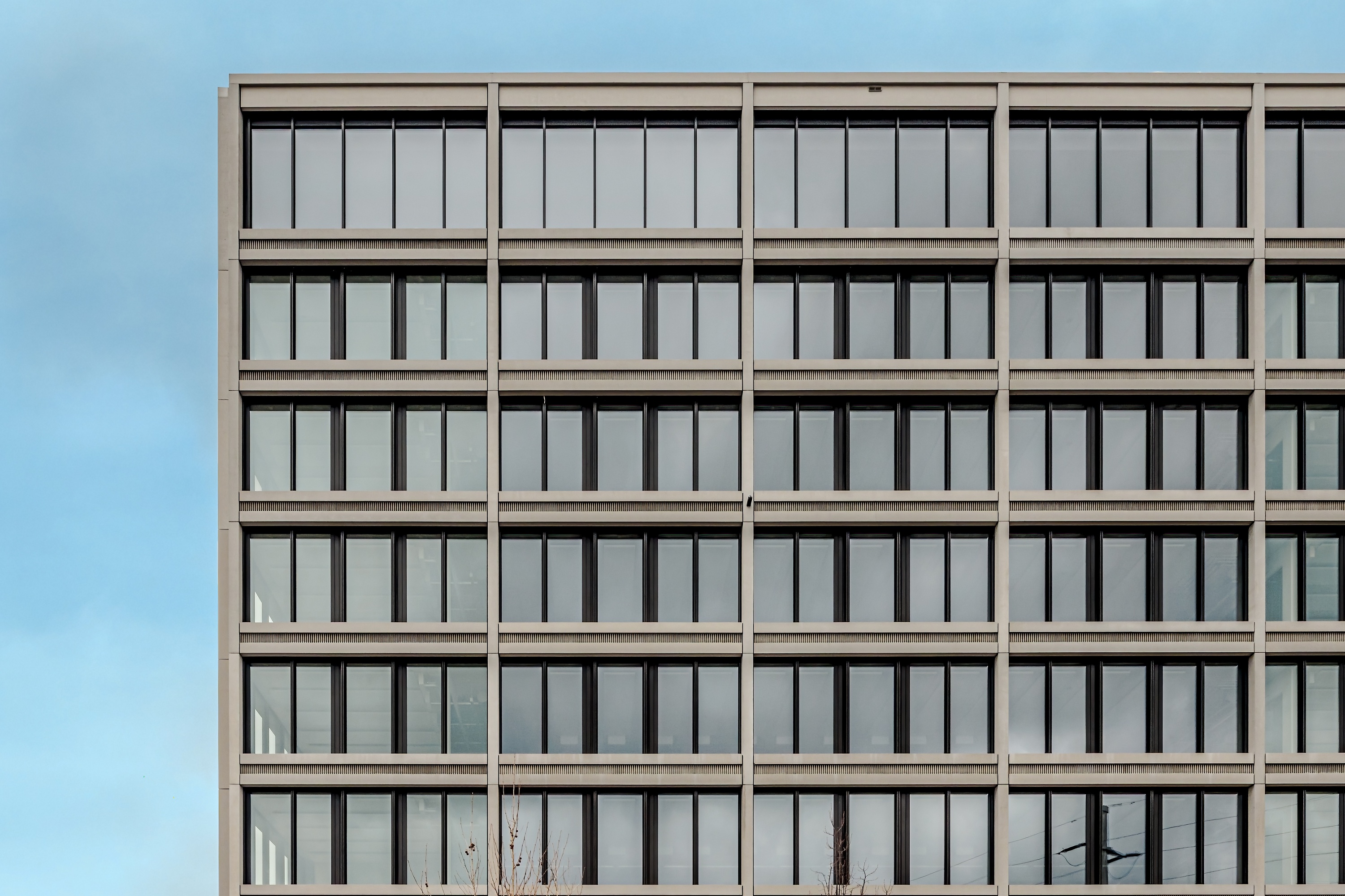 Die Fassade ist als präzise ausgeführte Metallkonstruktion in Pfosten-Riegel-Bauweise mit mineralischer Bekleidung konzipiert. Sie vereint robuste Materialien mit feiner Detaillierung und gewährleistet hohe Anforderungen an Wärmeschutz, Schallschutz und Wartungsfreundlichkeit. Insgesamt wurden 750 Festverglasungen mit rund 2000 m² Glasfläche sowie zusätzliche P-R-Fassade im 8.OG und EG von 200 m² realisiert.