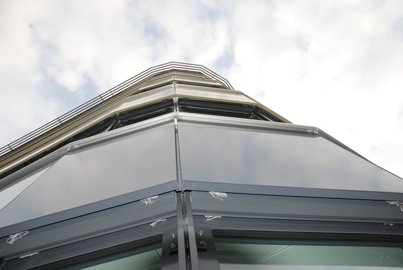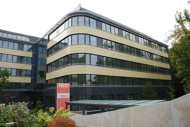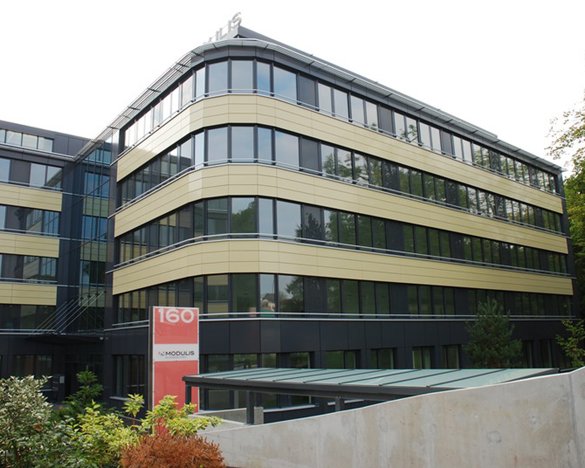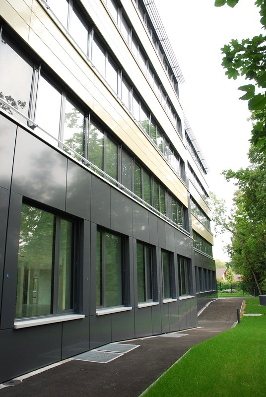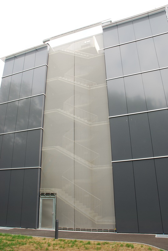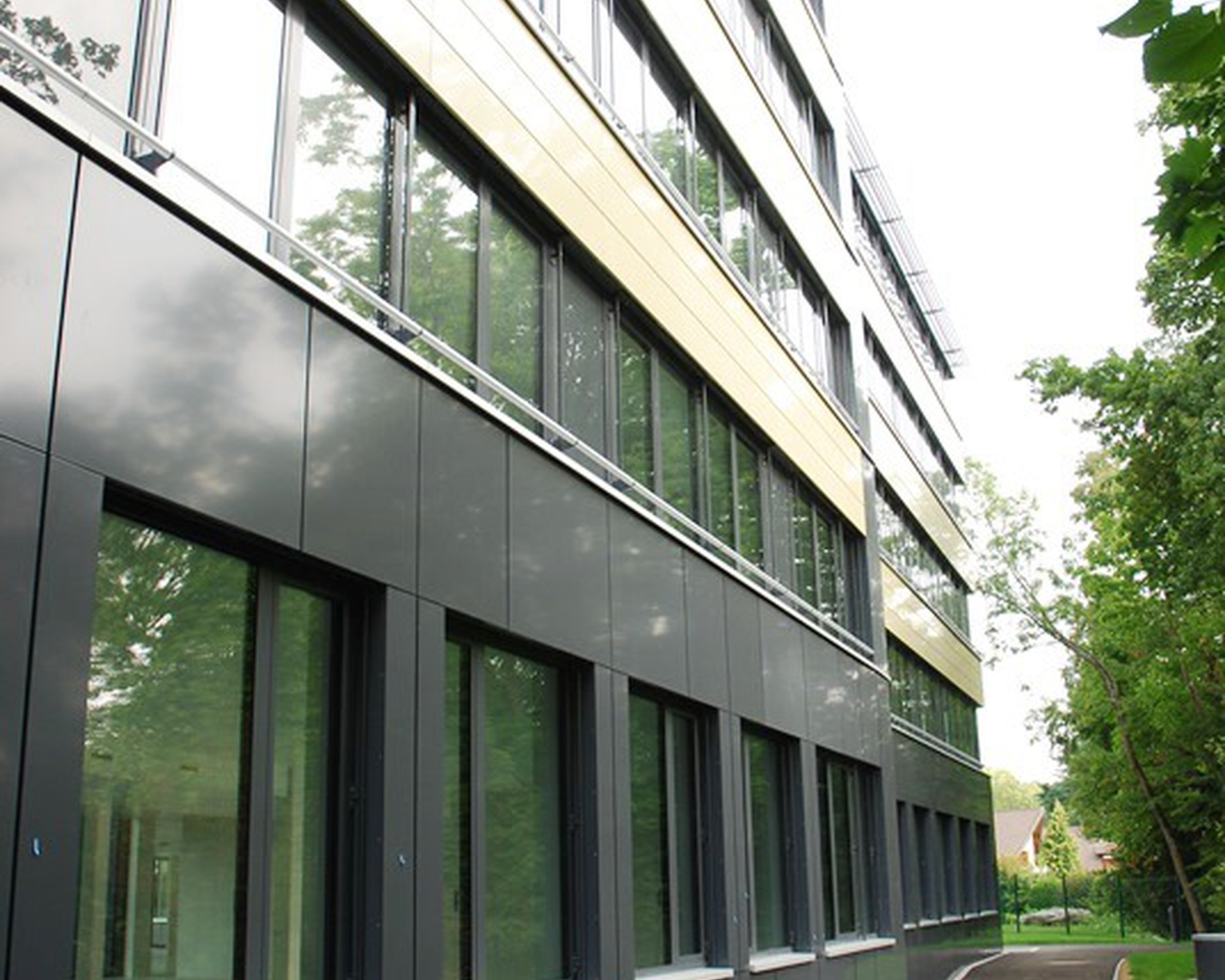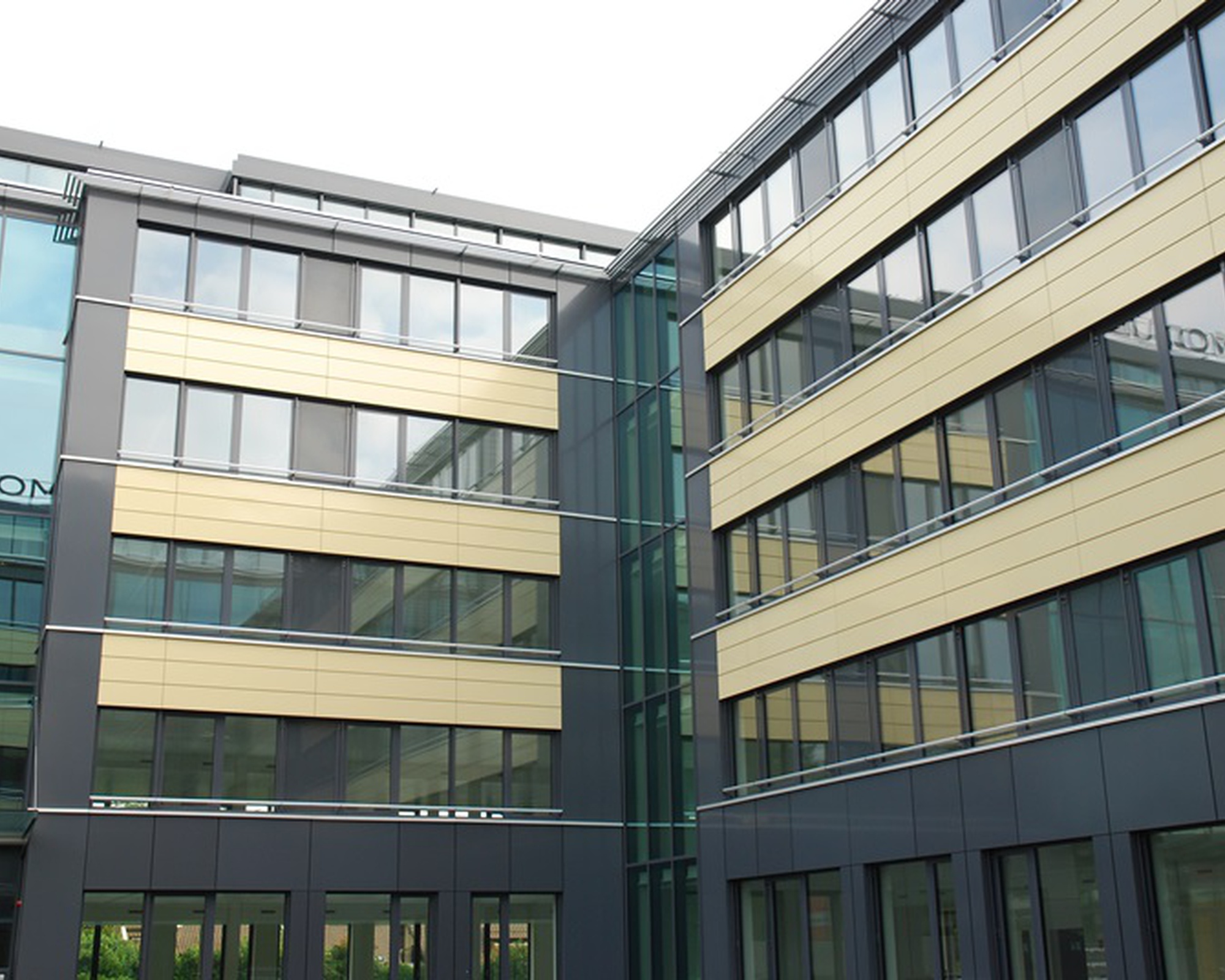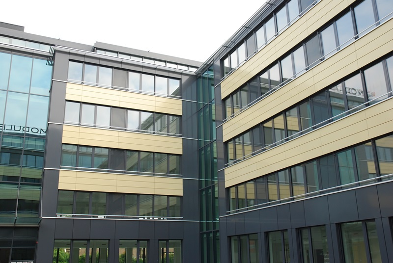 Bâtiment administratif de 4 niveaux avec attique, sous divisé en 4 zones comprenant 2 cages d'escaliers avec ascenseurs et 3 cages d'escaliers de sorties de secours. Des fenêtres en bandes posées sur des allèges en béton équipent les zones "bureau" alors que la lumière naturelle accède aux espaces de liaison entre zones et les cages d'escaliers au travers de larges façades poteau-traverse éuipées de vitrages toute hauteur. Les allèges de fenêtres sont recouvertes entre le 1er et le 4ème étage par un habillage en cassette aluminium de 2mm de couleur jaune qui tranche avec l'habillage des murs borgnes toute hauteur en tôles aluminium de 4 mm de couleur anthracite. L'isolation des murs extérieurs est assurée par 2 couches de laine verre de 100mm. La protection anti chute au niveau des 3 cages d'escalier de sortie de secours est assurée par une maille en inox.