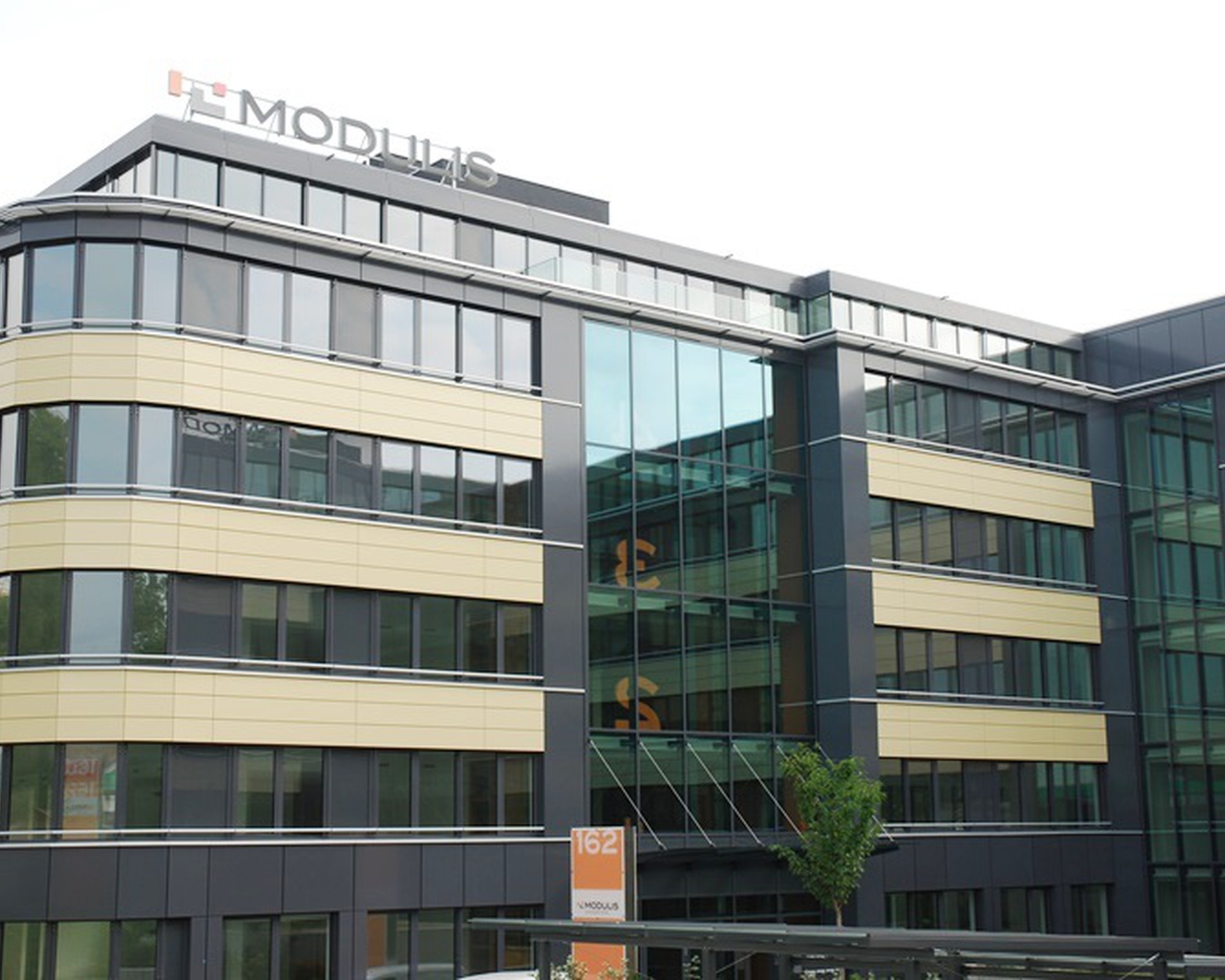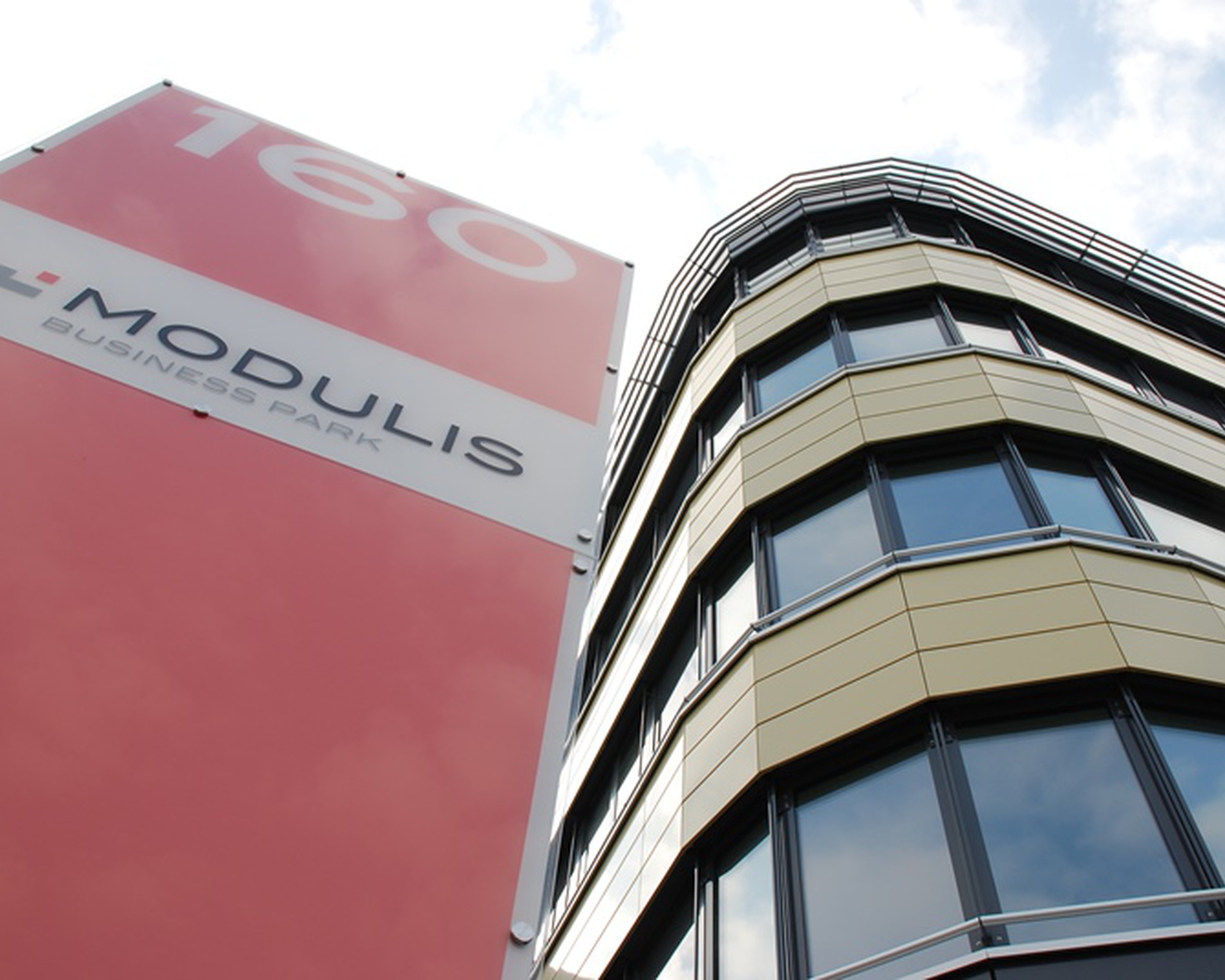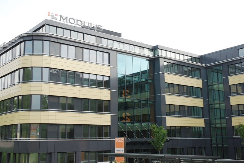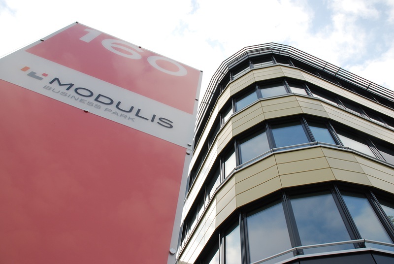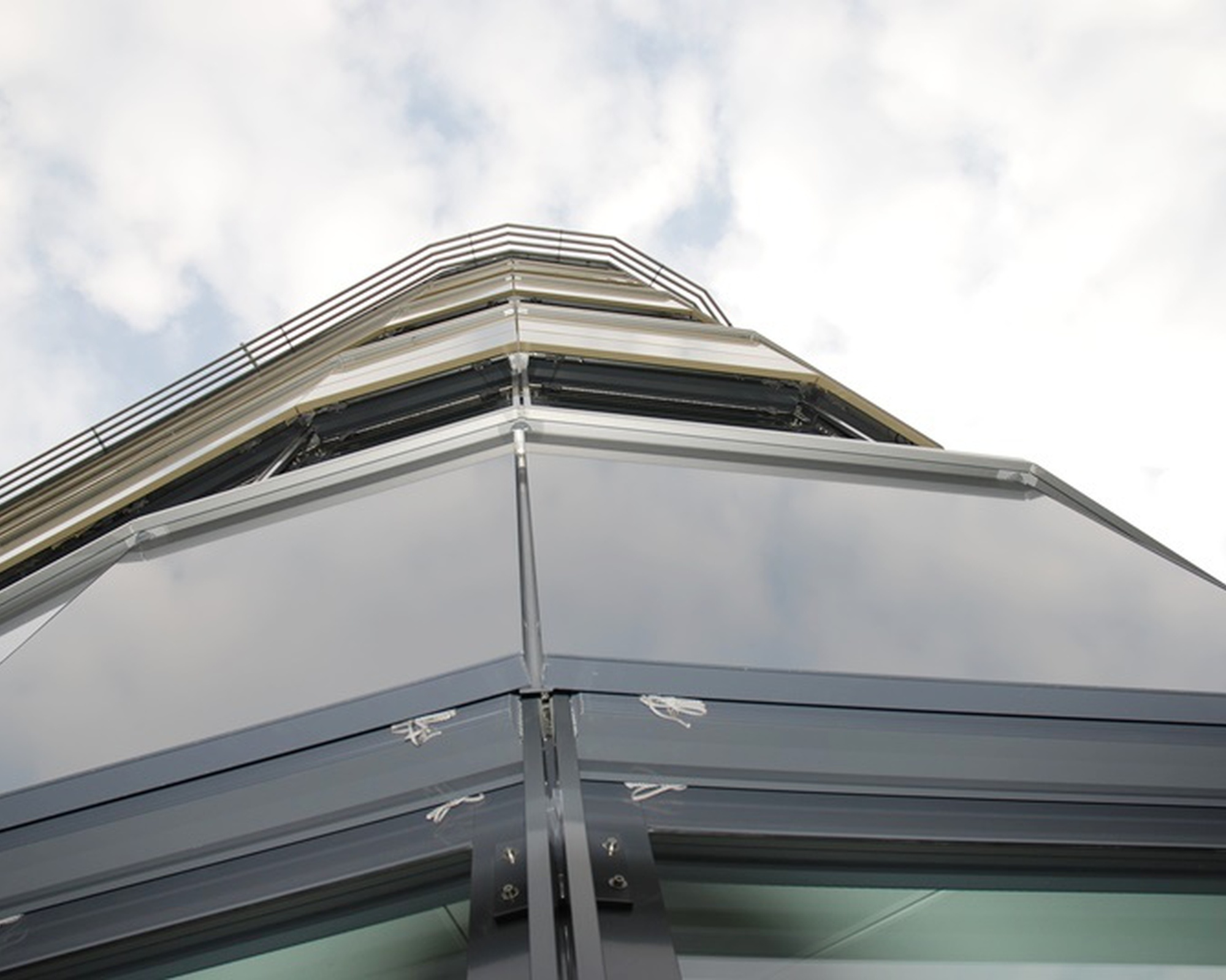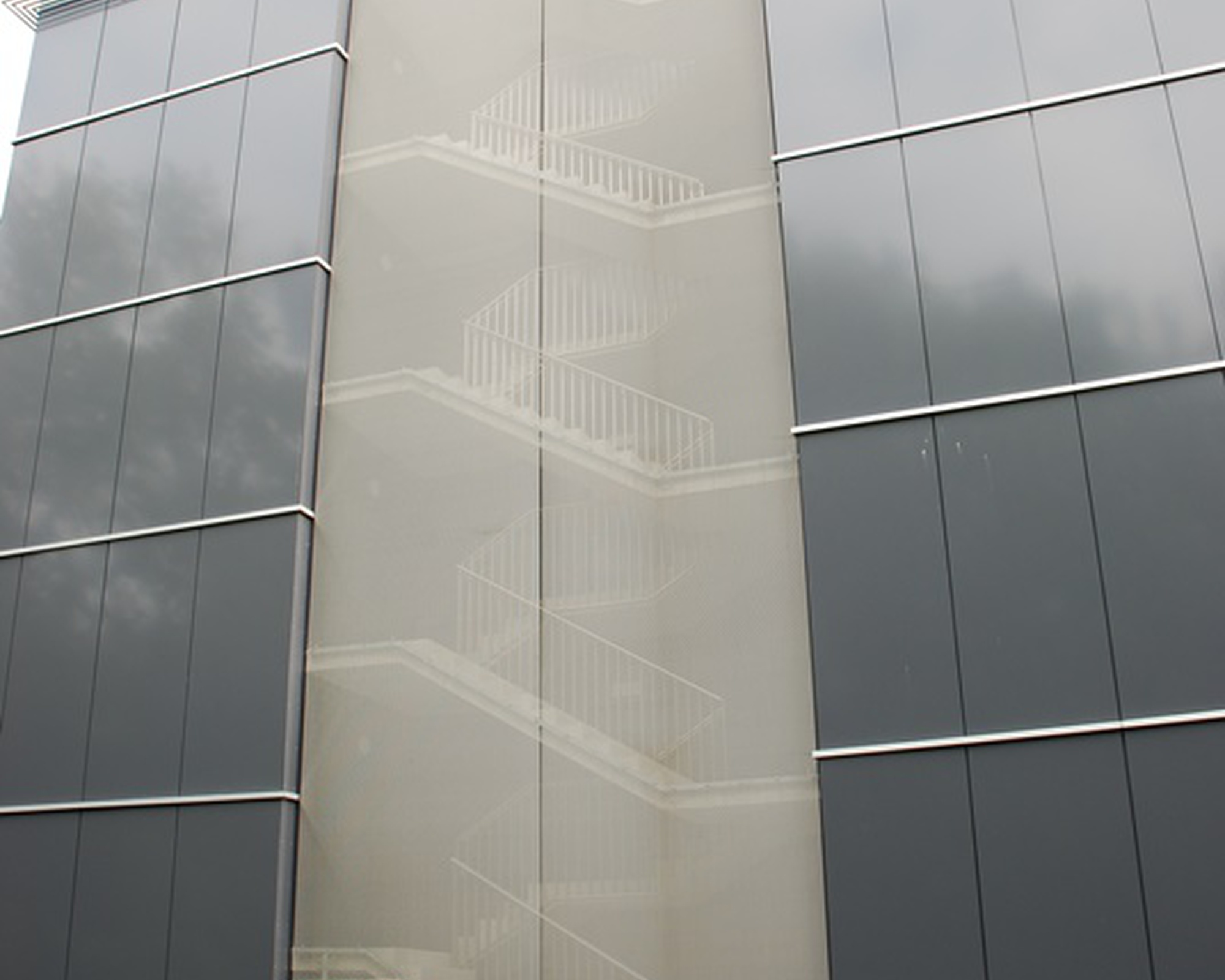 Bâtiment administratif de 4 niveaux avec attique, sous divisé en 4 zones comprenant 2 cages d'escaliers avec ascenseurs et 3 cages d'escaliers de sorties de secours. Des fenêtres en bandes posées sur des allèges en béton équipent les zones "bureau" alors que la lumière naturelle accède aux espaces de liaison entre zones et les cages d'escaliers au travers de larges façades poteau-traverse éuipées de vitrages toute hauteur. Les allèges de fenêtres sont recouvertes entre le 1er et le 4ème étage par un habillage en cassette aluminium de 2mm de couleur jaune qui tranche avec l'habillage des murs borgnes toute hauteur en tôles aluminium de 4 mm de couleur anthracite. L'isolation des murs extérieurs est assurée par 2 couches de laine verre de 100mm. La protection anti chute au niveau des 3 cages d'escalier de sortie de secours est assurée par une maille en inox.