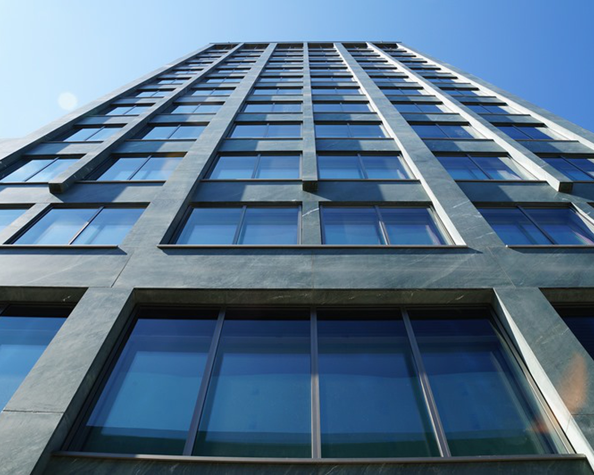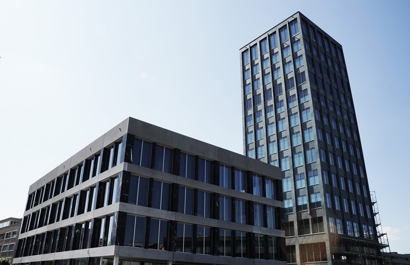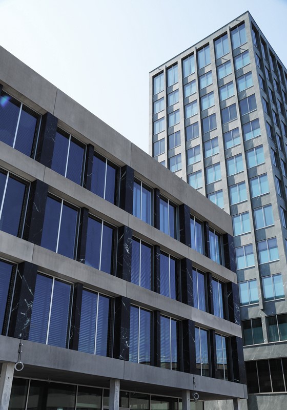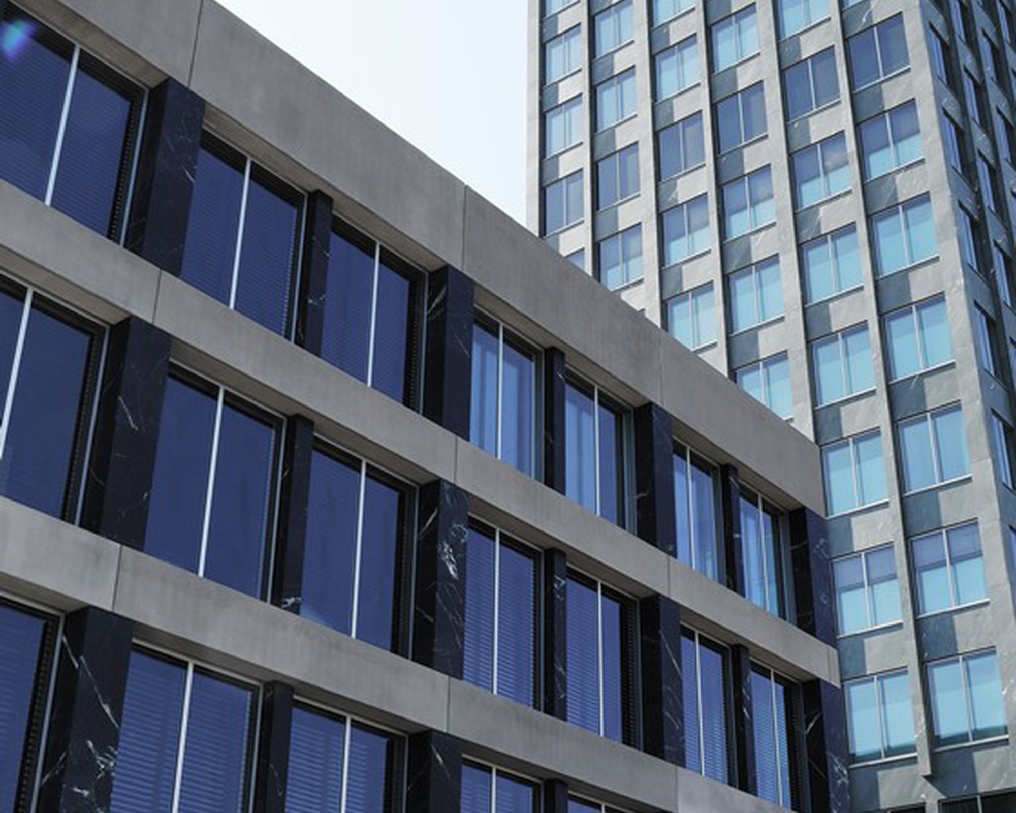 La façade de cet immeuble a été exécutée avec un système Aktiv-Air Plus propre à la société Fahrni (espace d'air entre peau intérieure et extérieure ventilée à l'aide d'un système d'air sous pression incluant les stores à lamelles). L'habillage des espaces entre les éléments de façade est réalisée en pierre naturelle et en plaques de béton préfabriquées. La surface de la tour de 12 étages et du bâtiment adjacent de 4 étages composé dans leur ensemble de 558 éléments représente un total de 5690 m2.
