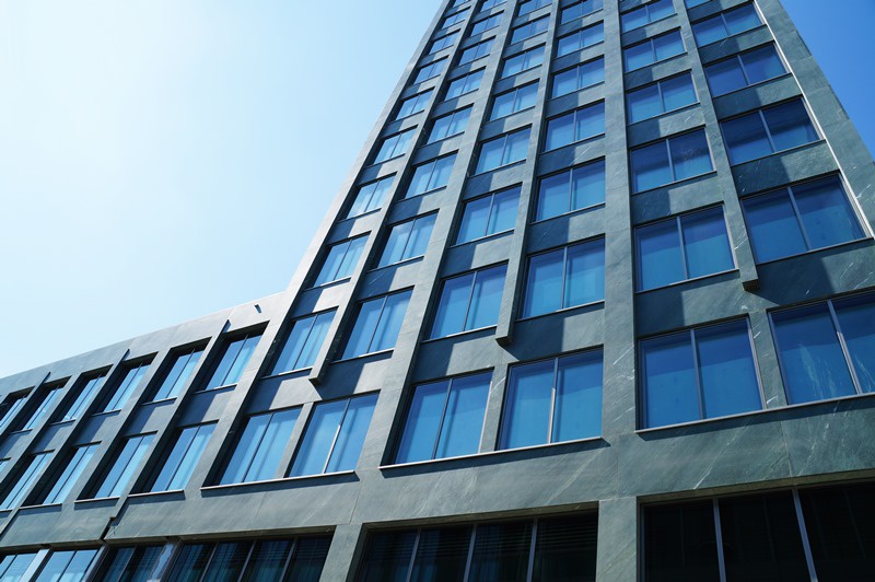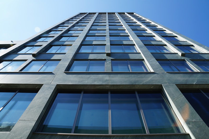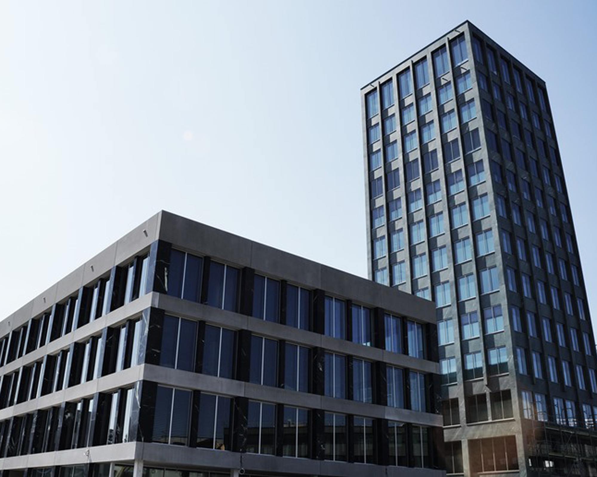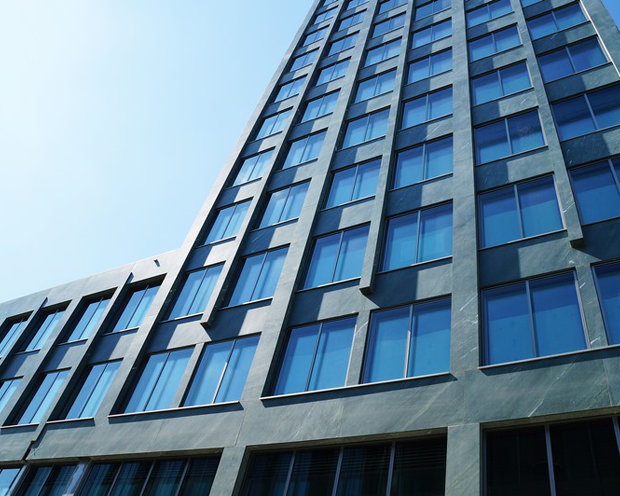 La façade de cet immeuble a été exécutée avec un système Aktiv-Air Plus propre à la société Fahrni (espace d'air entre peau intérieure et extérieure ventilée à l'aide d'un système d'air sous pression incluant les stores à lamelles). L'habillage des espaces entre les éléments de façade est réalisée en pierre naturelle et en plaques de béton préfabriquées. La surface de la tour de 12 étages et du bâtiment adjacent de 4 étages composé dans leur ensemble de 558 éléments représente un total de 5690 m2.