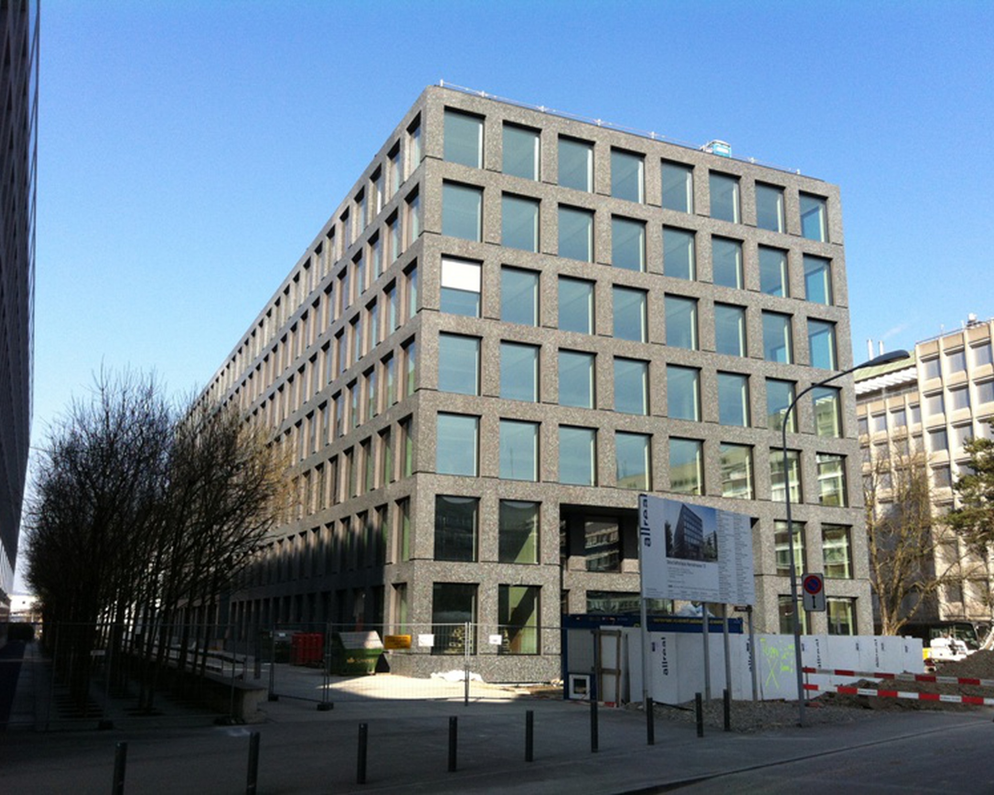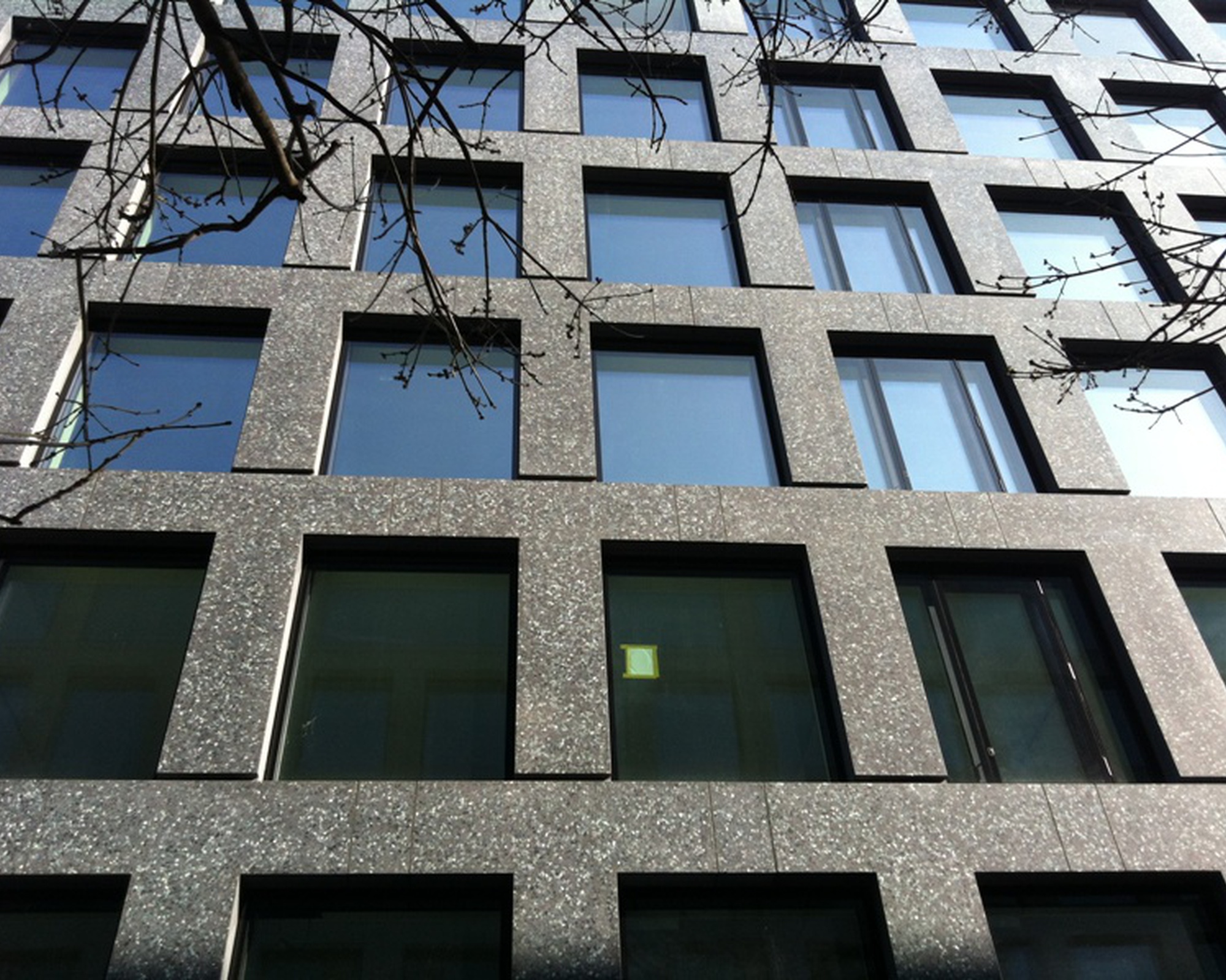 520 éléments de façade caisson Activ-Plus. Habillage en pierre reconstituée à l'extérieur. Habillage de l'étage technique avec des grilles alu.