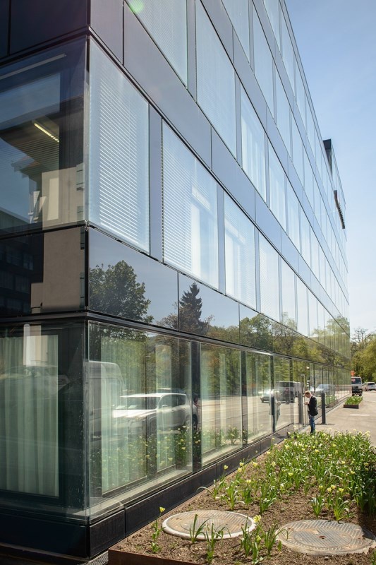 Façade double peau composée de fenêtres en bande posées sur une allège en bâton sur la face intérieure et d'une peau extérieure réalisée à l'aide de bandes alternées de vitrages transparents et émaillés.
