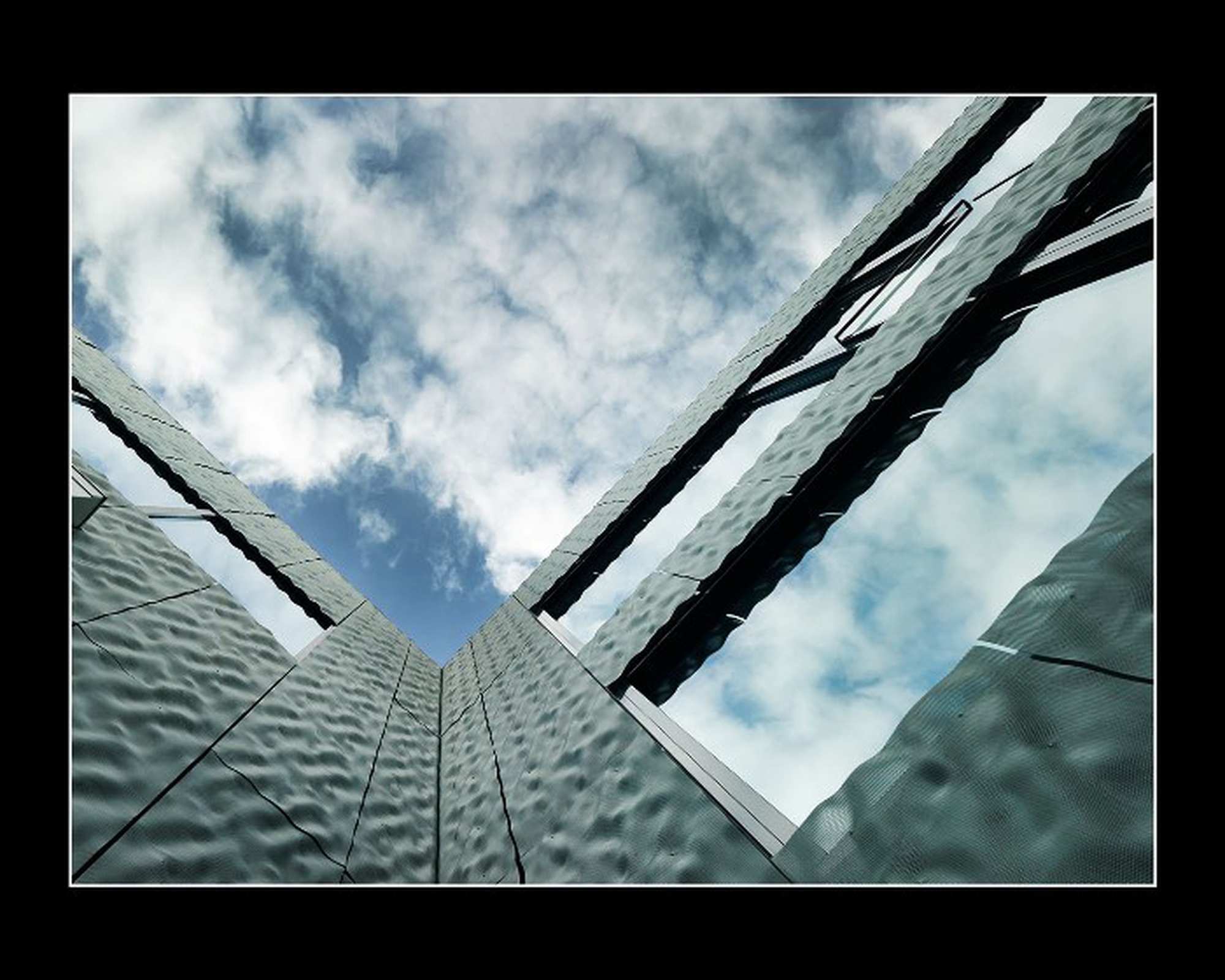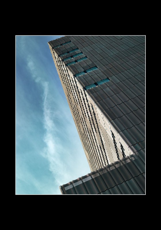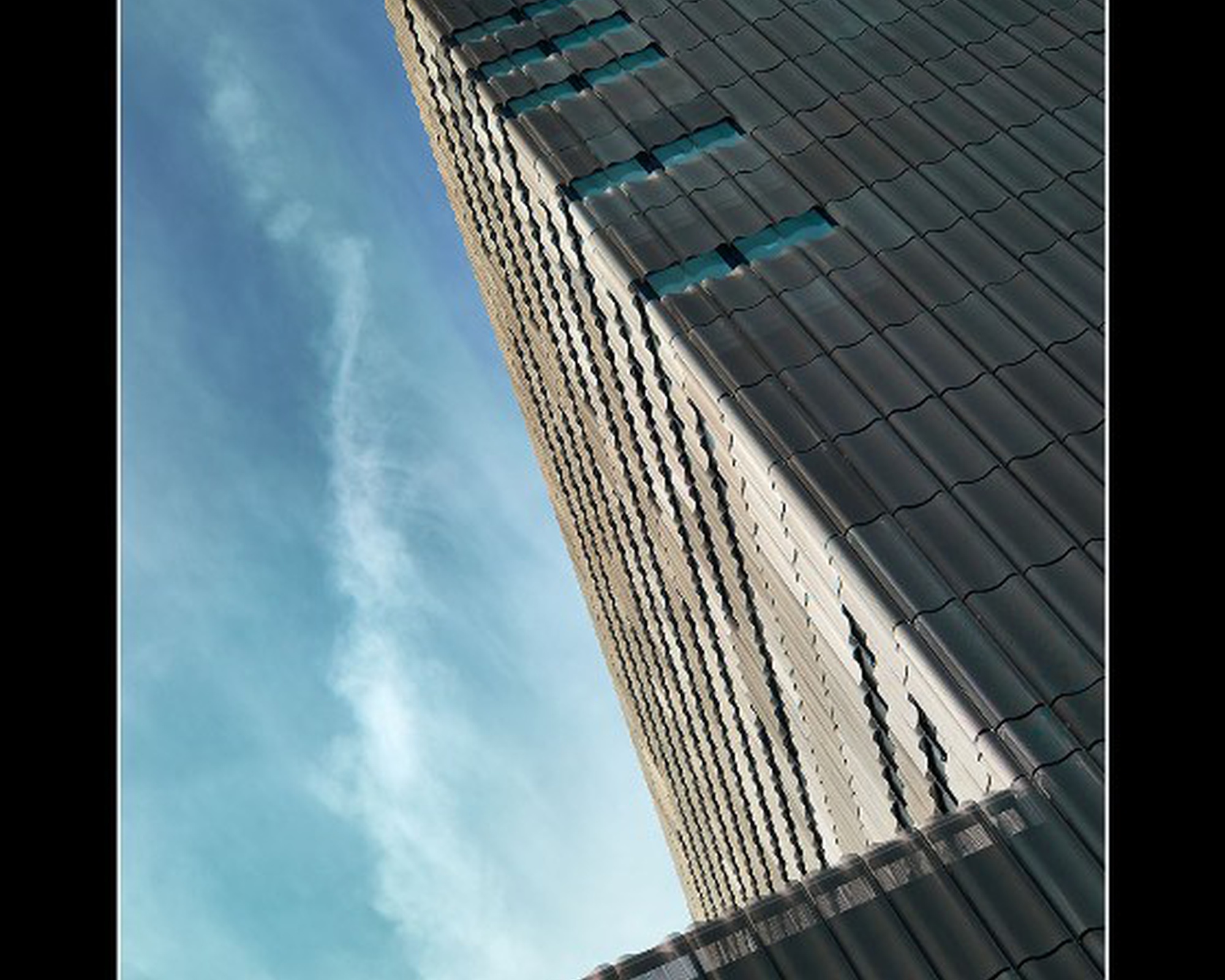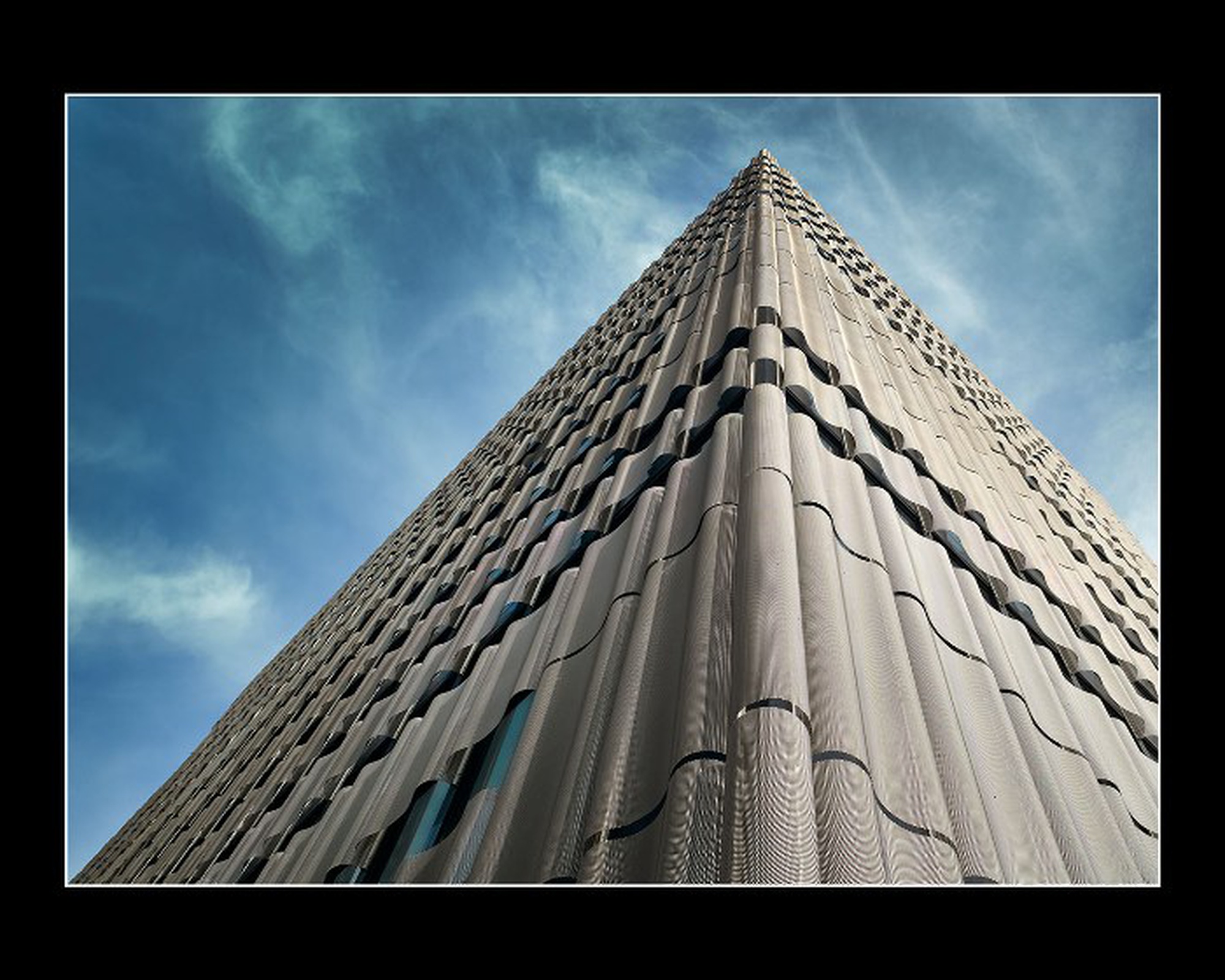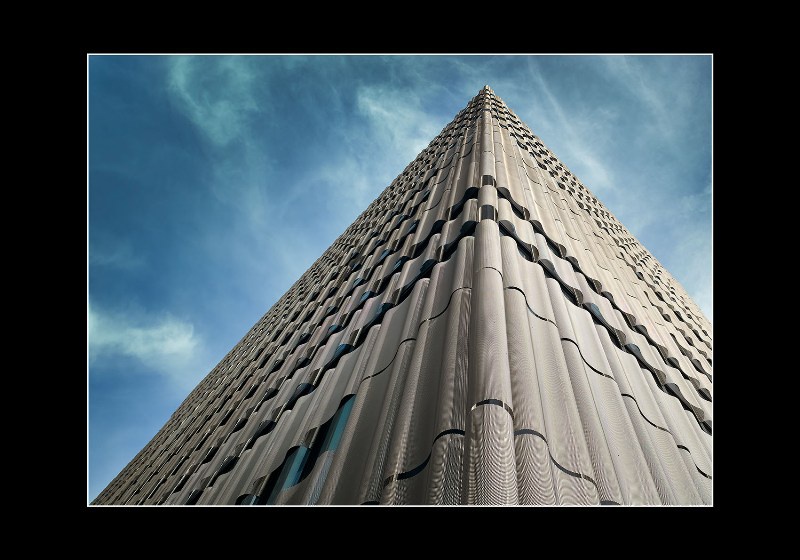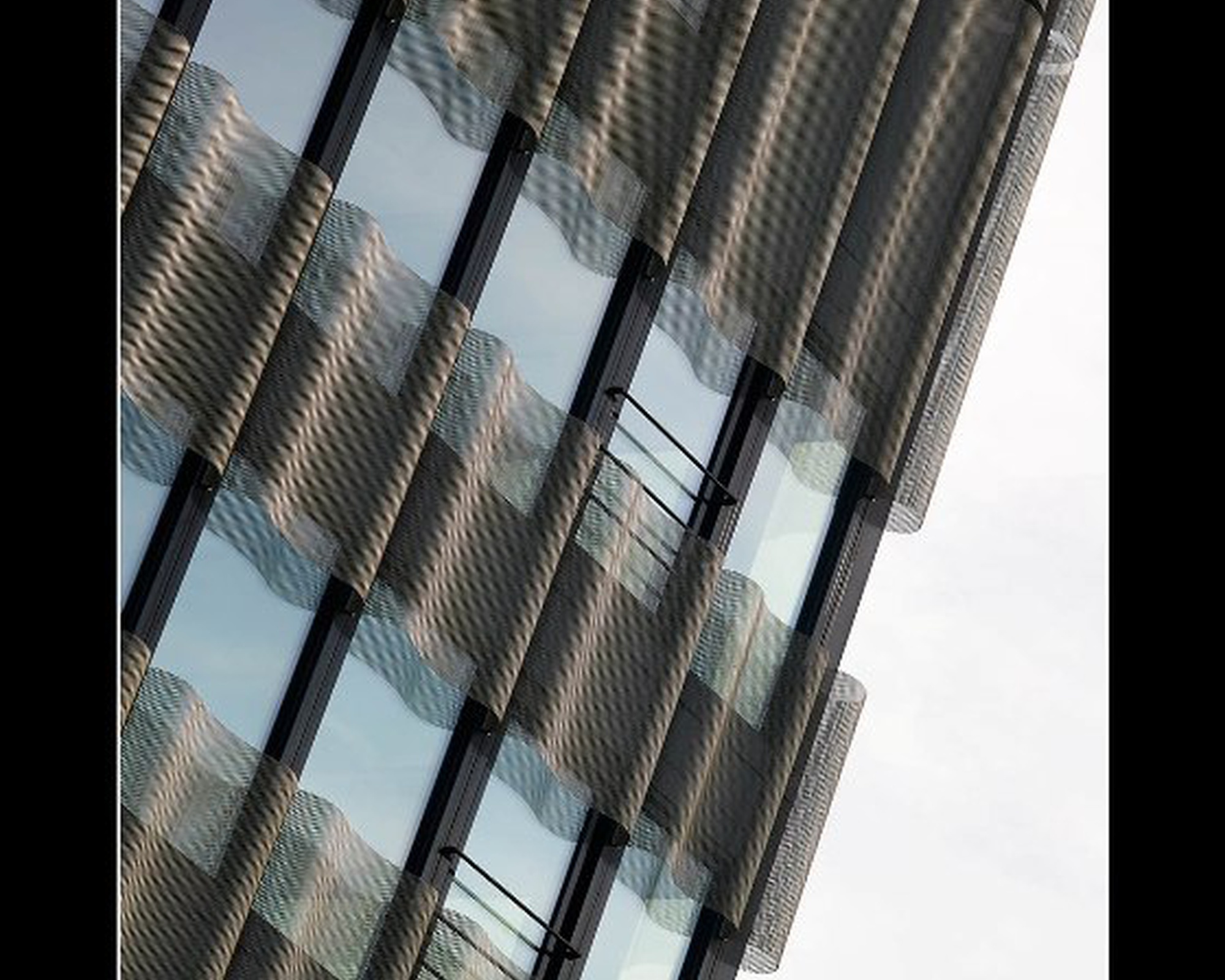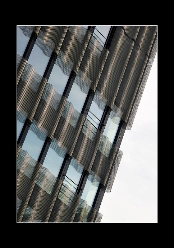 Eléments de façade habillés par des panneaux de métal dépolyé en forme de vagues, stores d'occultation extérieur Zip-Screen. Façades en cour intérieure coupe feu EI30 / EI60 habillées par des panneaux de métal deployé à relief.