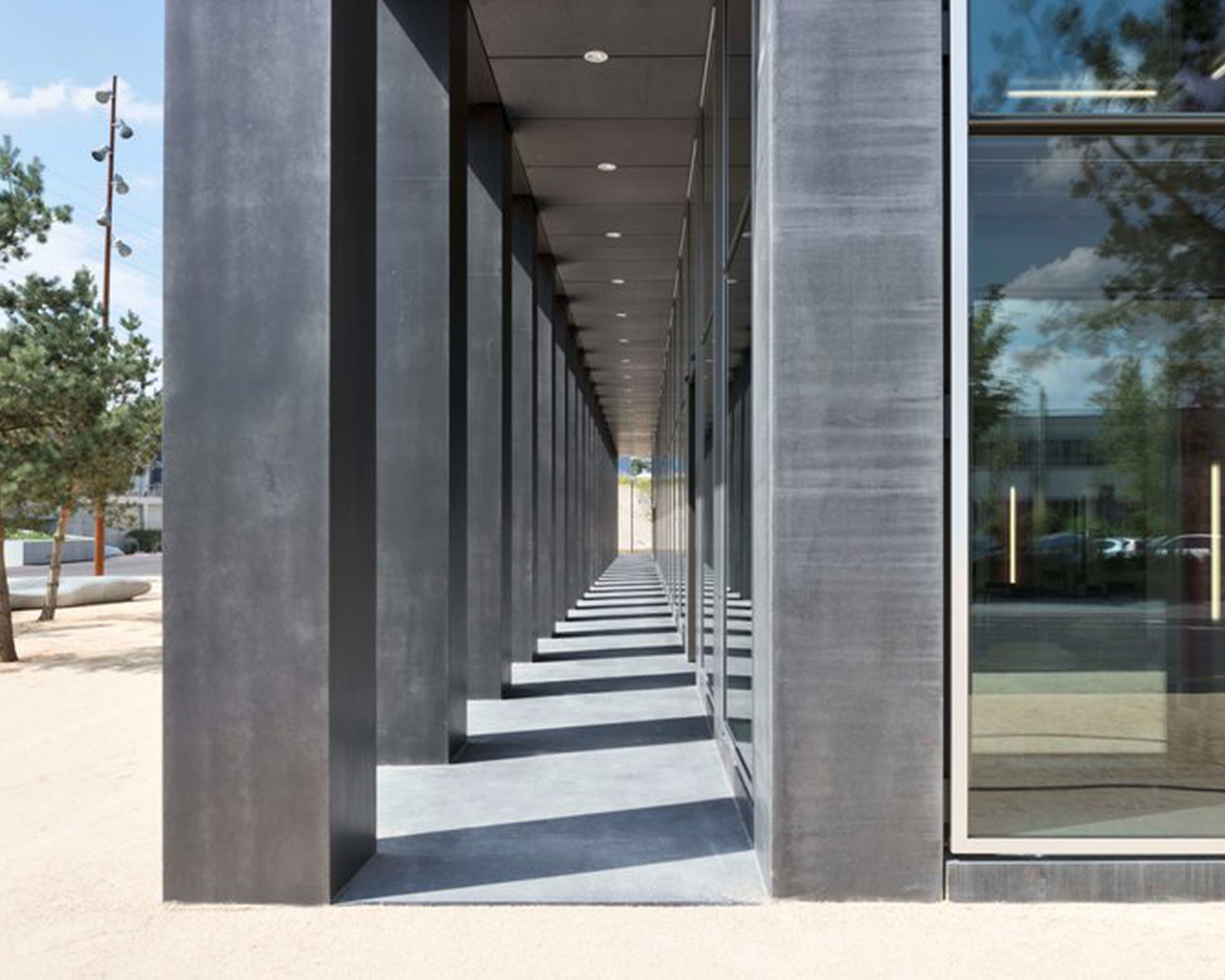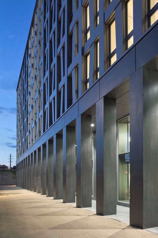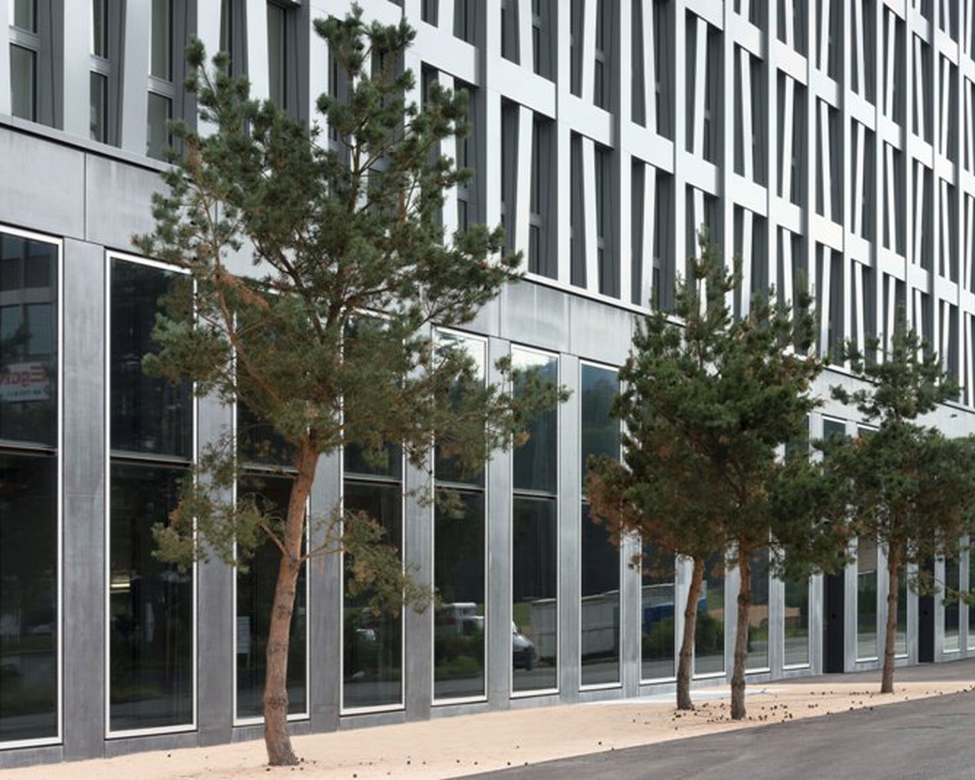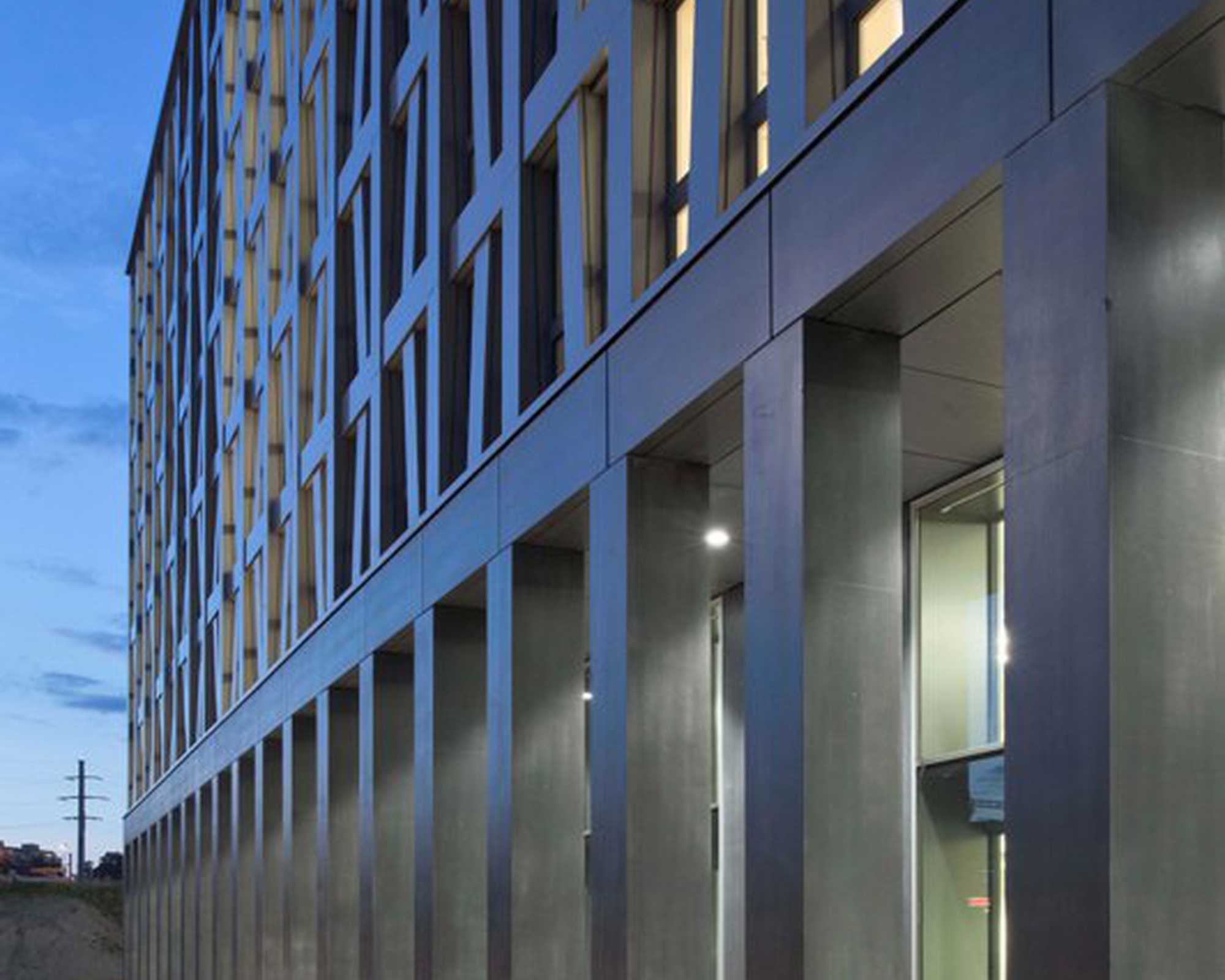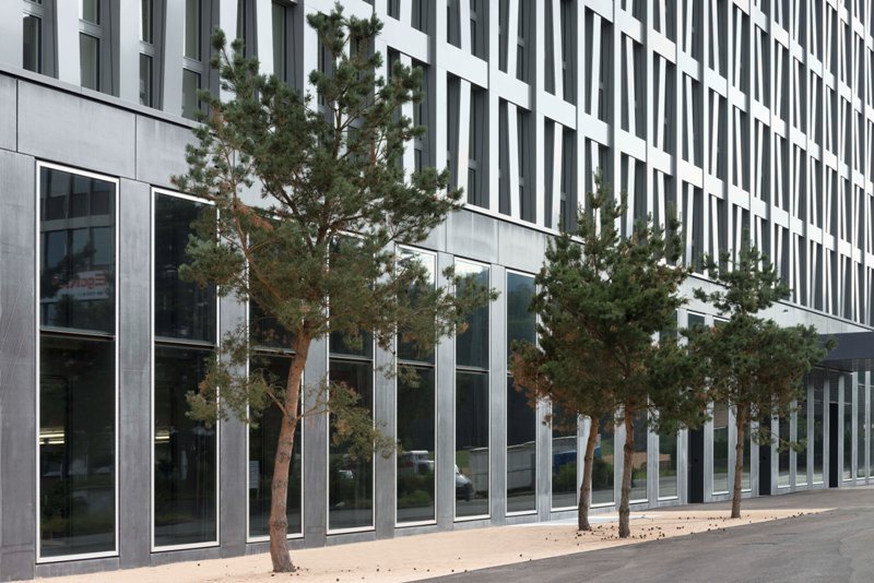 Façade extérieure et de cour intérieure en éléments bois-métal associée à un habillage de façade ventilée en tôle. Le rez-de-chaussée et le premier étage sont exécutés sous forme d'éléments caissons avec un habillage vitré. Les édicules de toiture sont en structure métallique habillées par du métal déployé. L'enveloppe du bâtiment est certifié MINERGIE P ECO Standard.