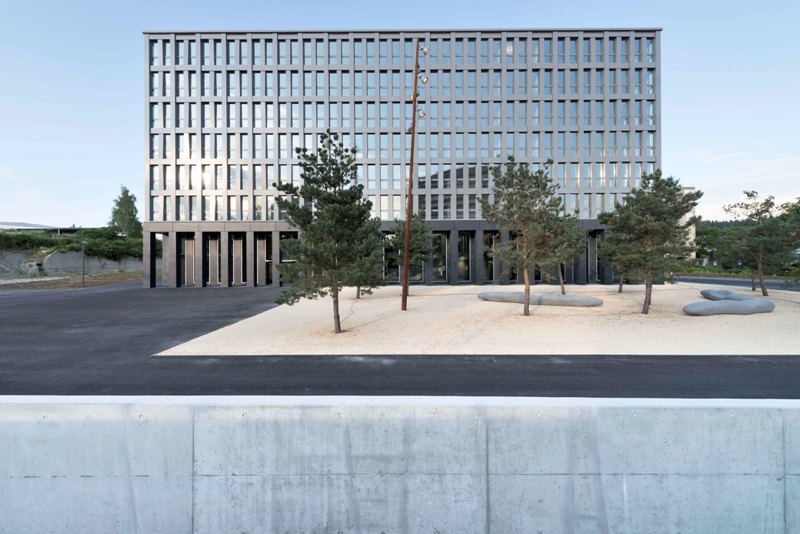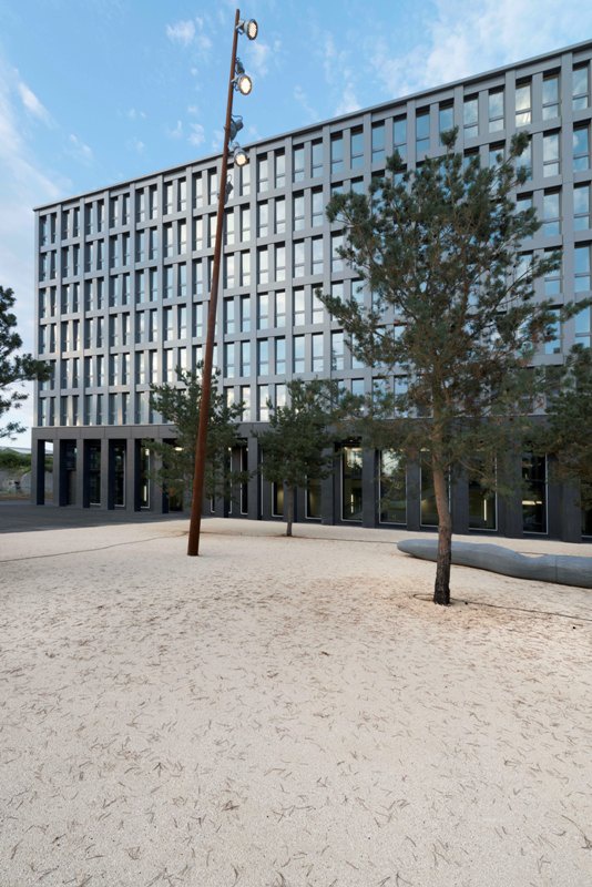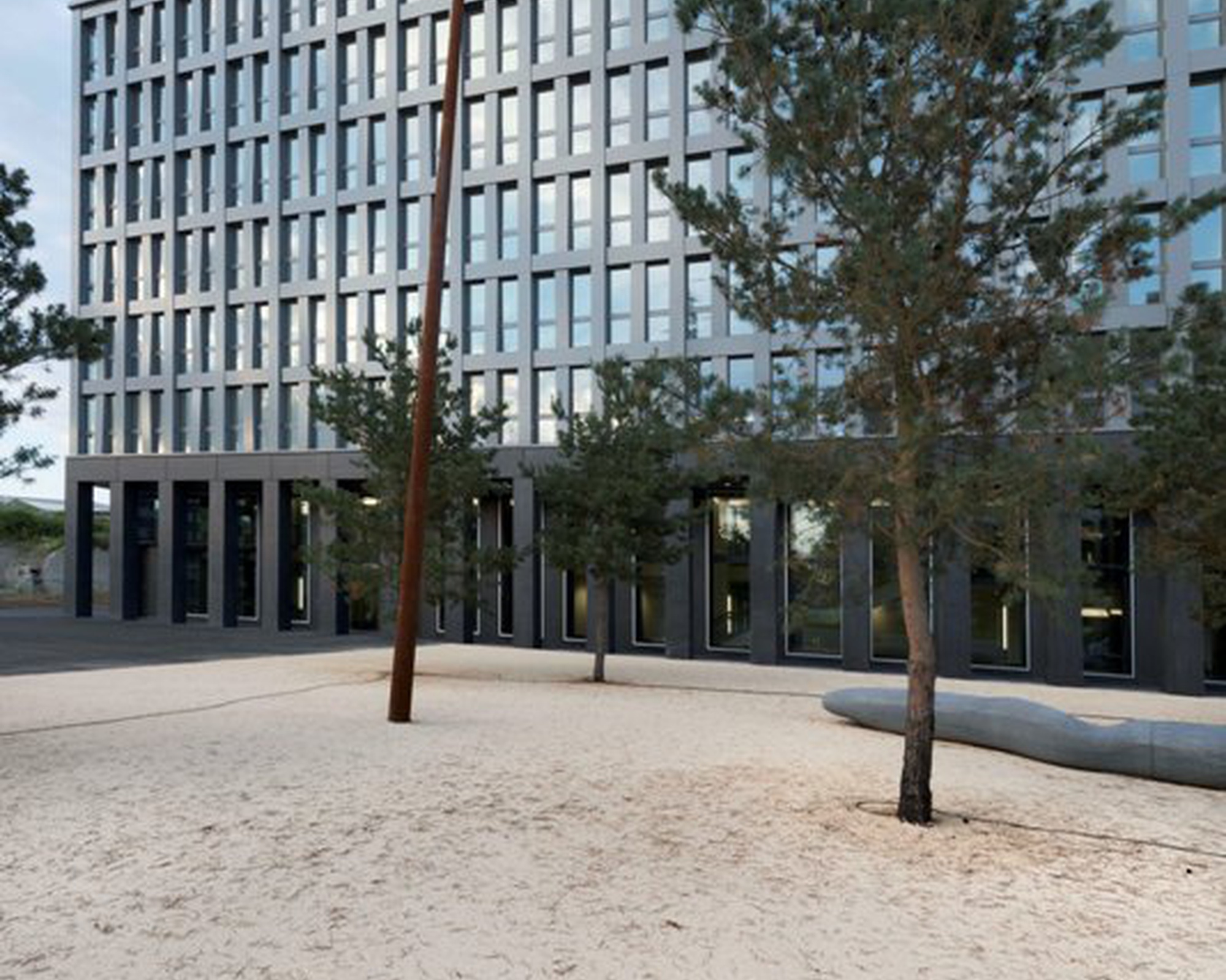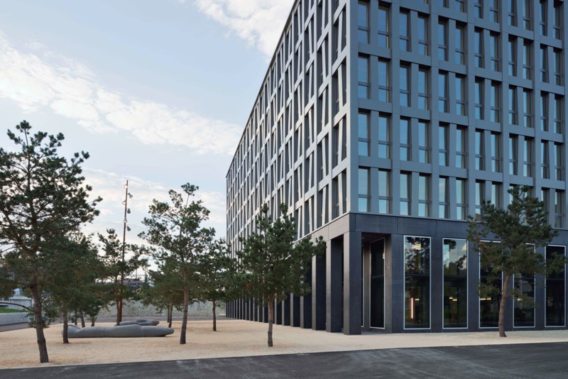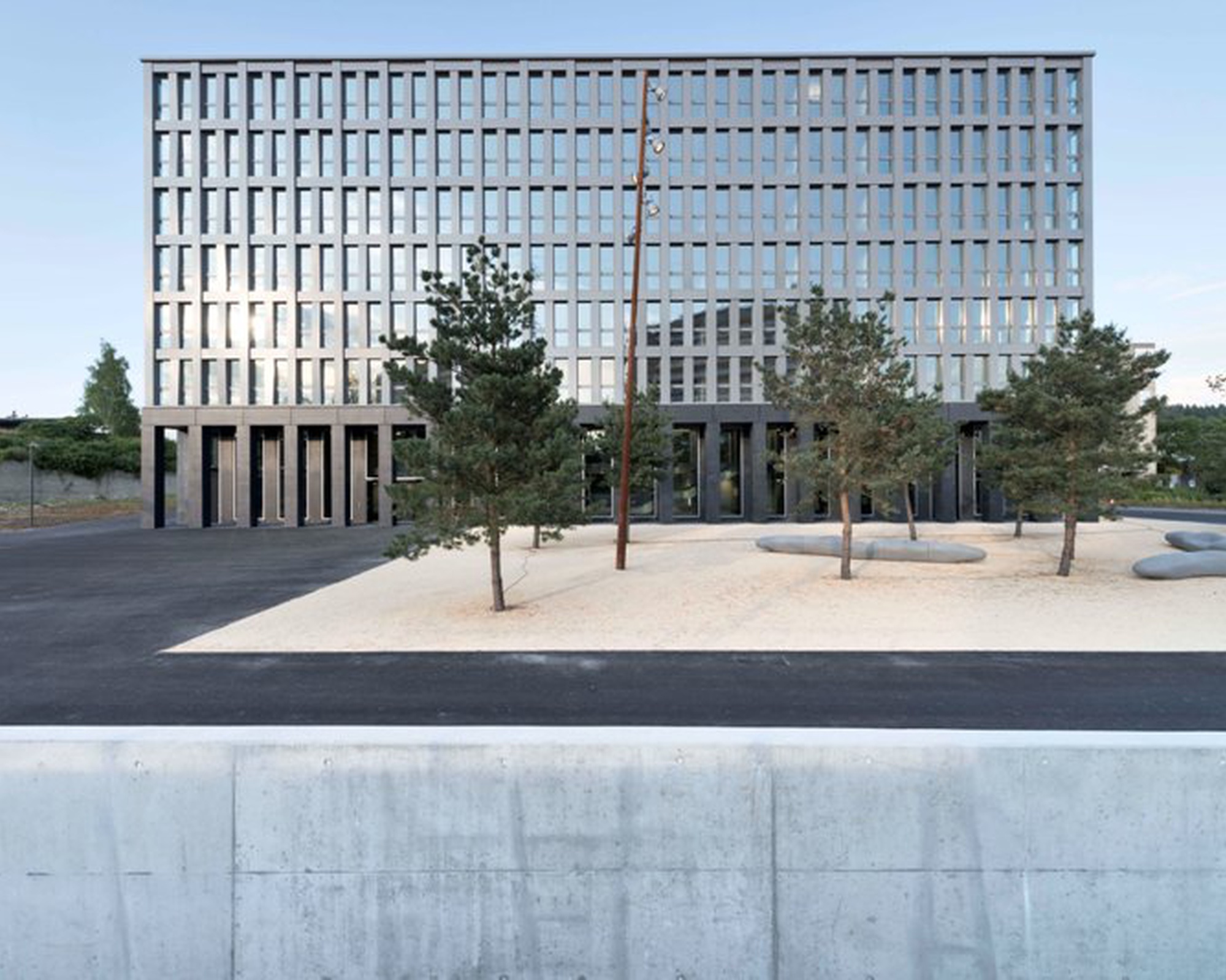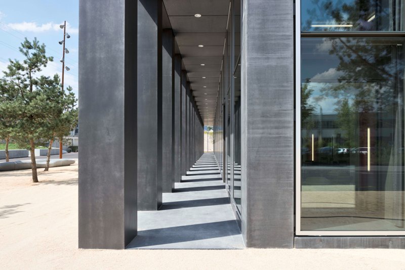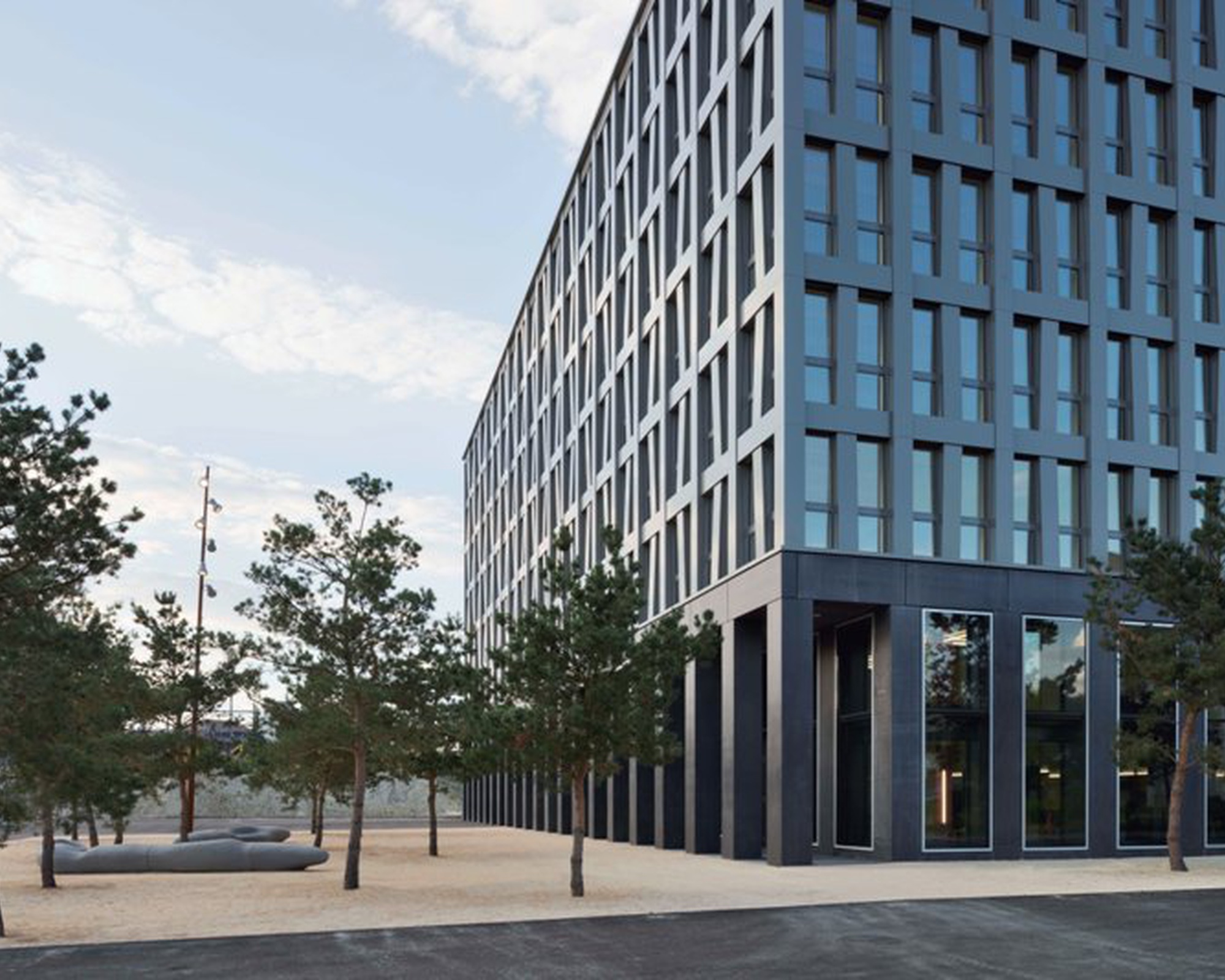 Façade extérieure et de cour intérieure en éléments bois-métal associée à un habillage de façade ventilée en tôle. Le rez-de-chaussée et le premier étage sont exécutés sous forme d'éléments caissons avec un habillage vitré. Les édicules de toiture sont en structure métallique habillées par du métal déployé. L'enveloppe du bâtiment est certifié MINERGIE P ECO Standard.