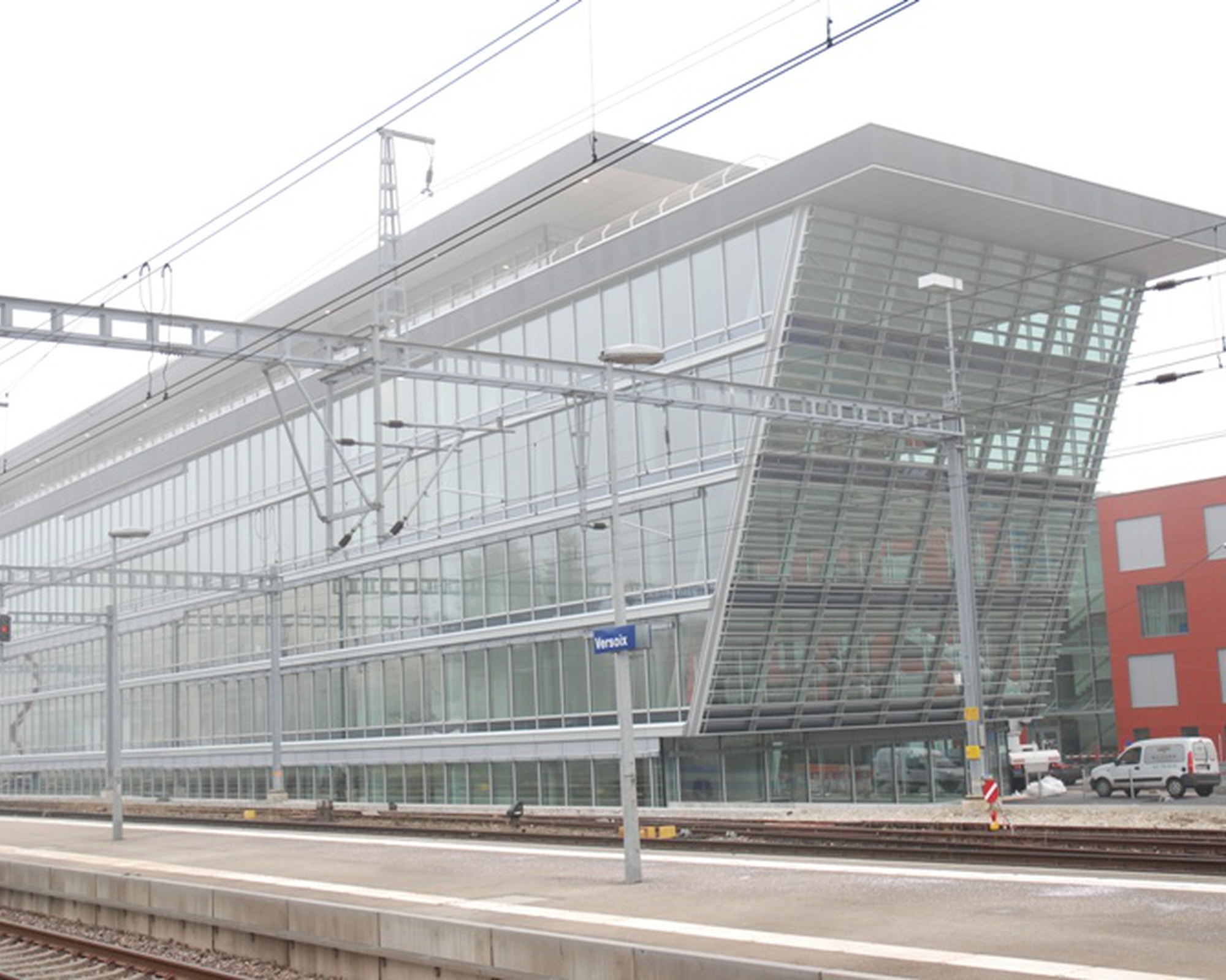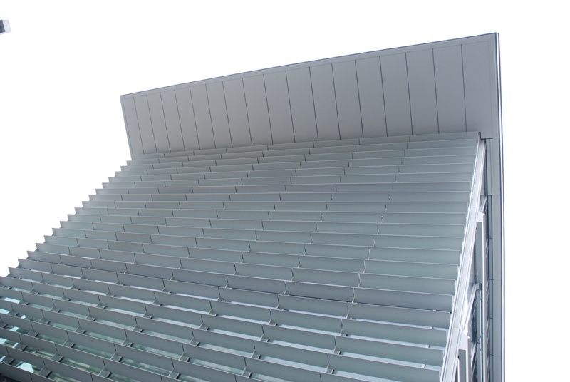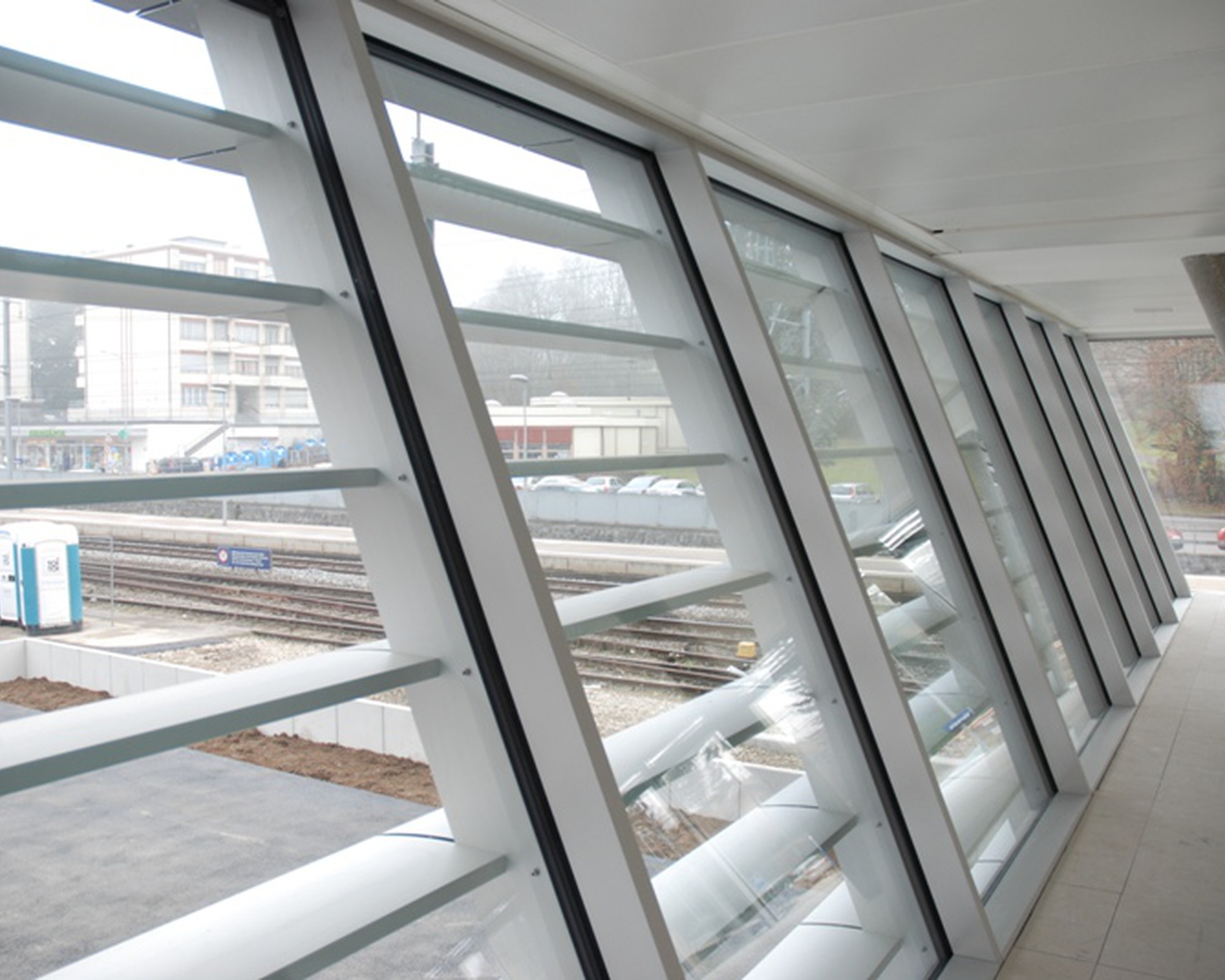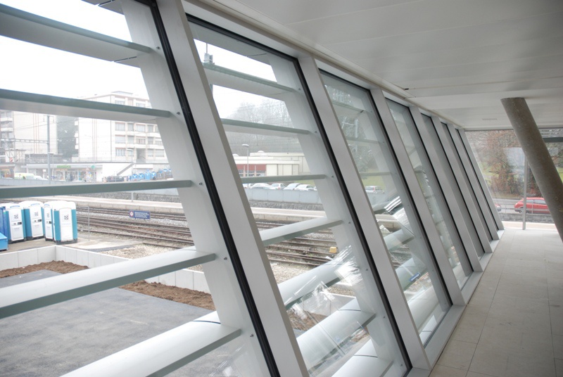 Façade poteaux traverses posée sur des sous construction filante de 5'600mm. Verres 42dB. Sous face en tôles aluminium de 4mm.