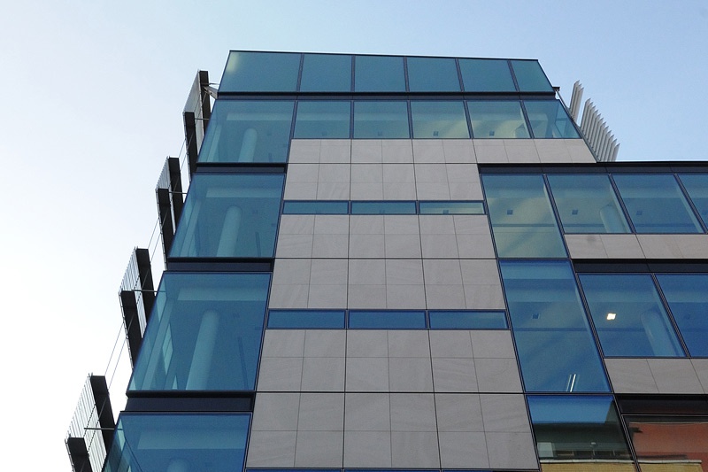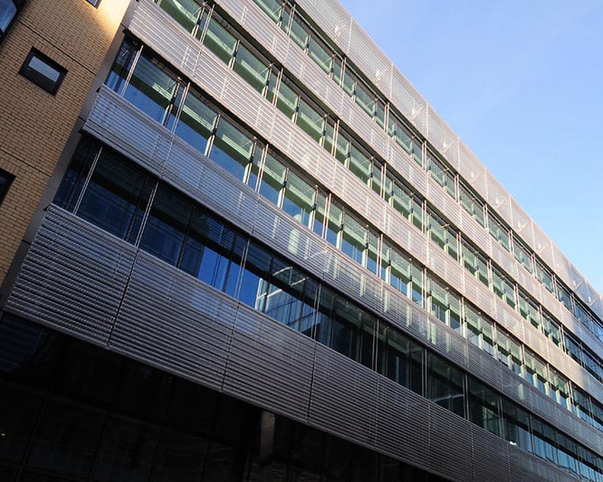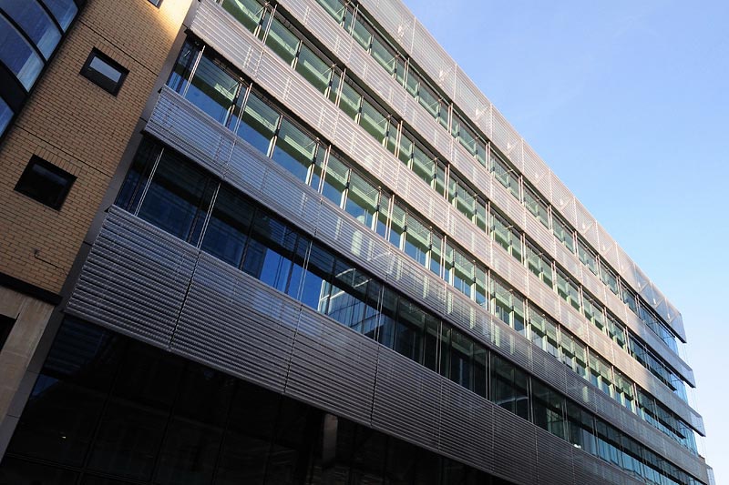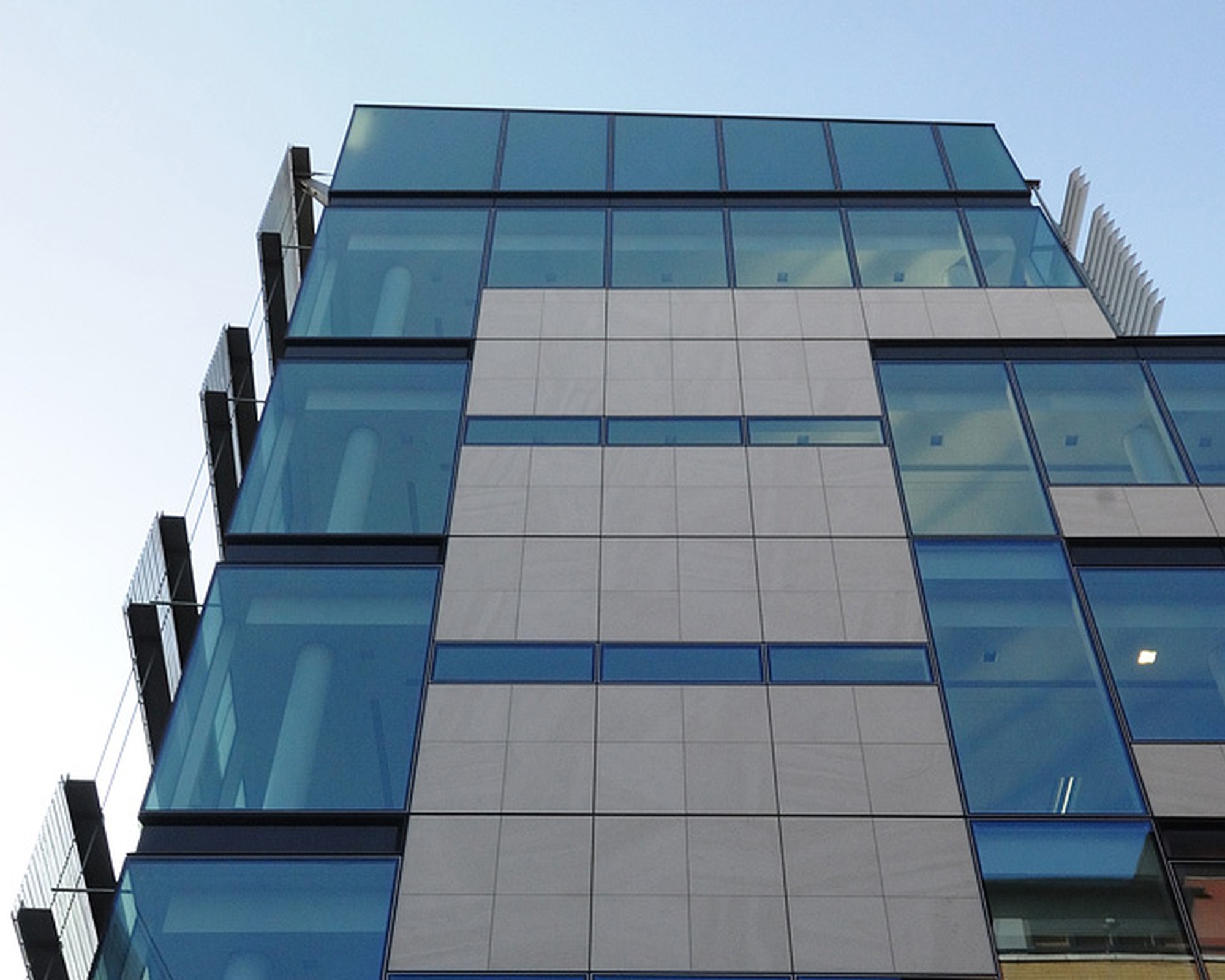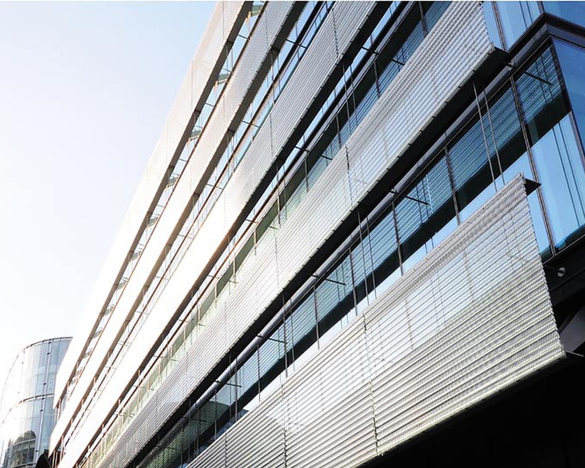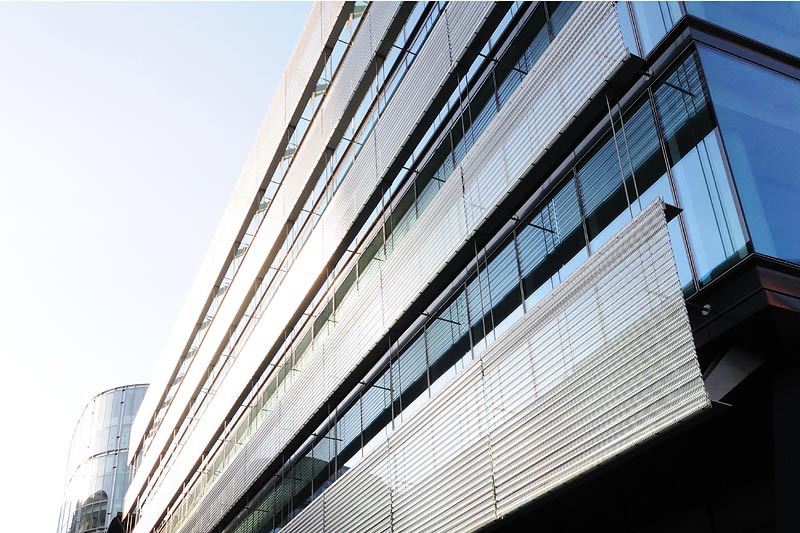 Façade modulaire, protection solaire, bâtiment cube de verre
