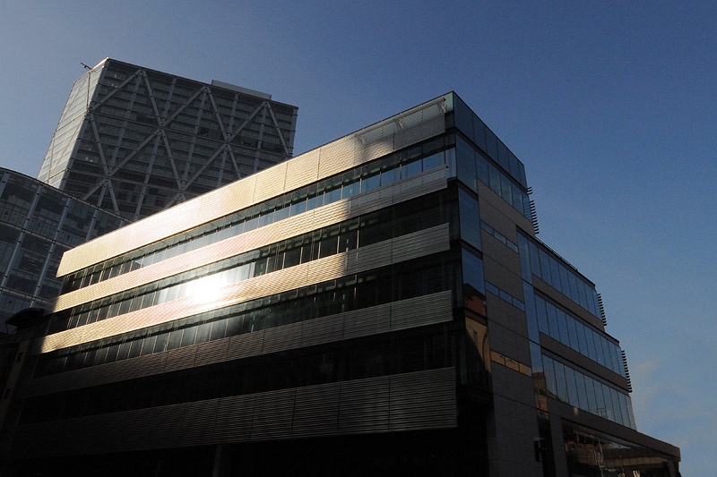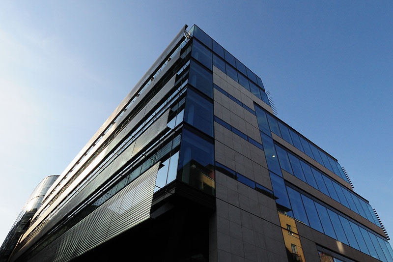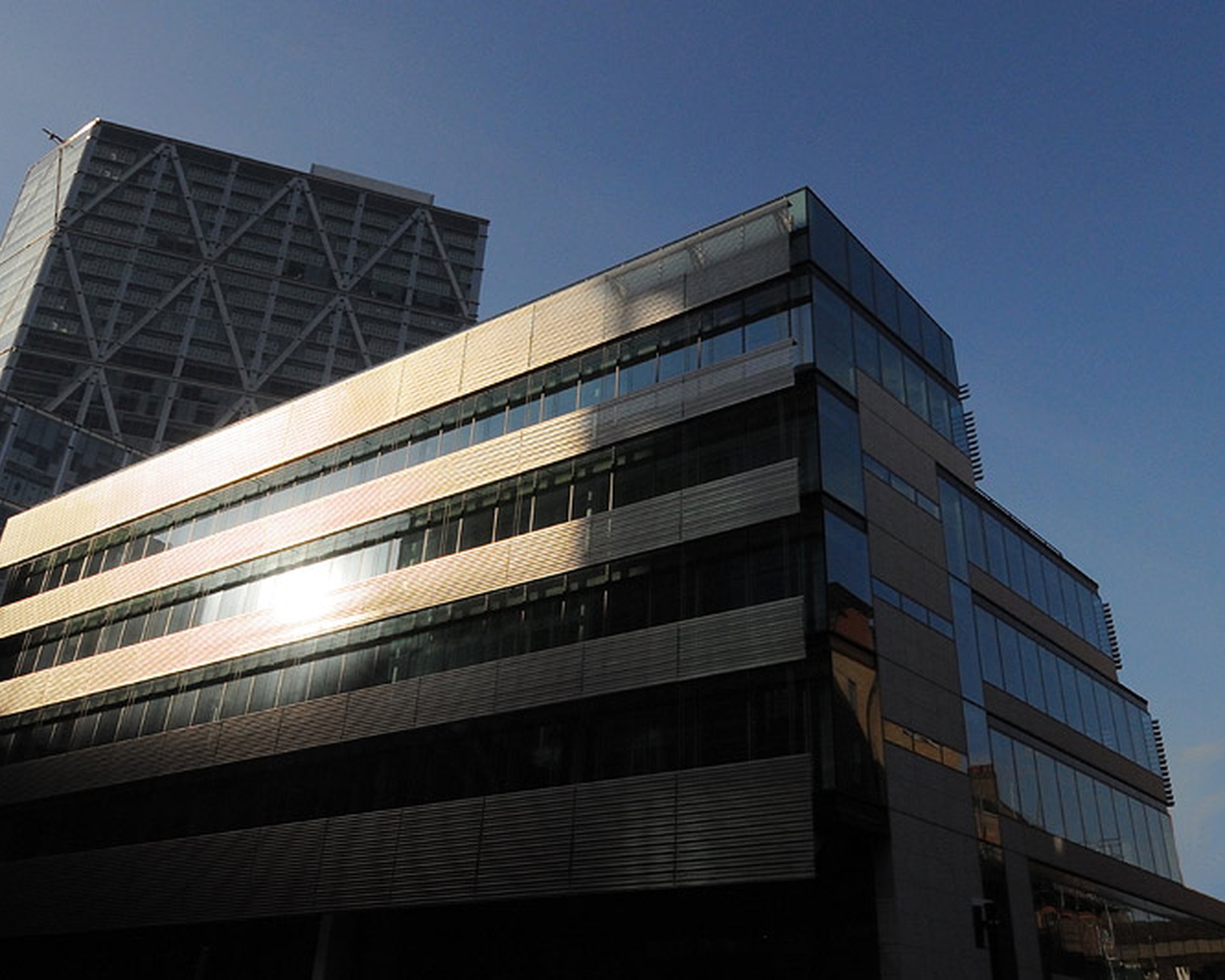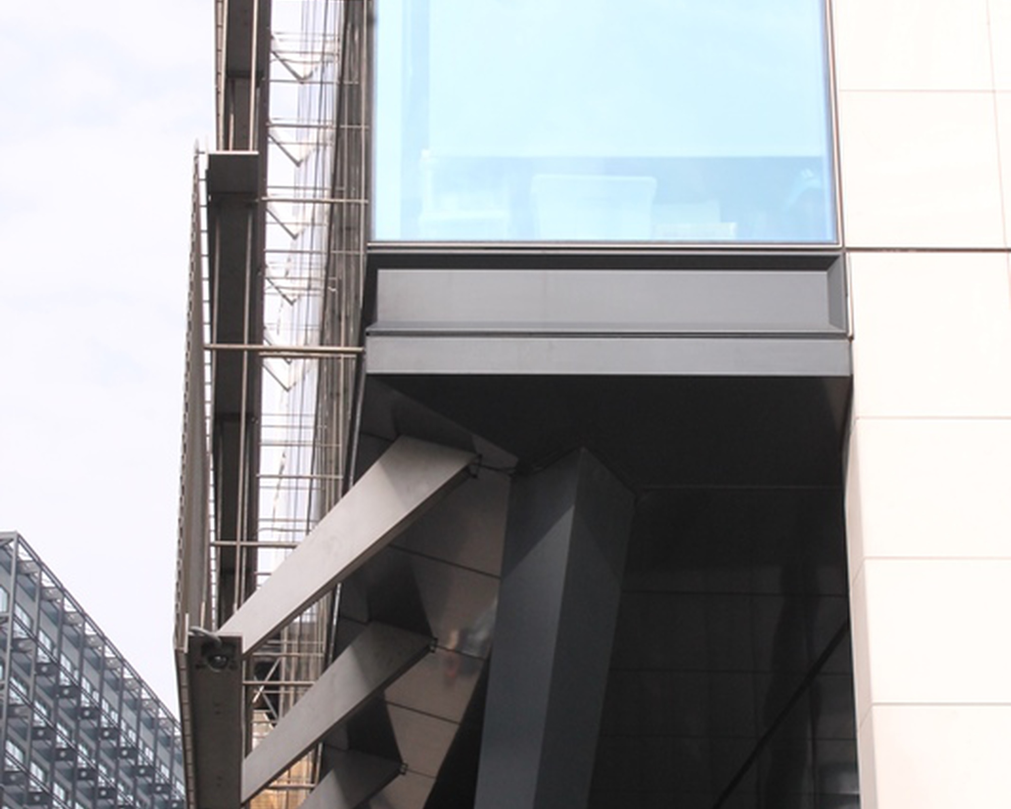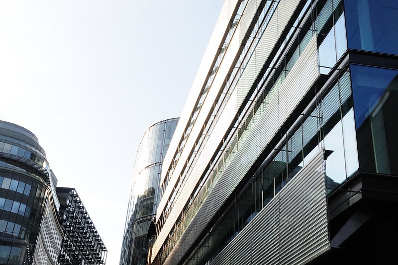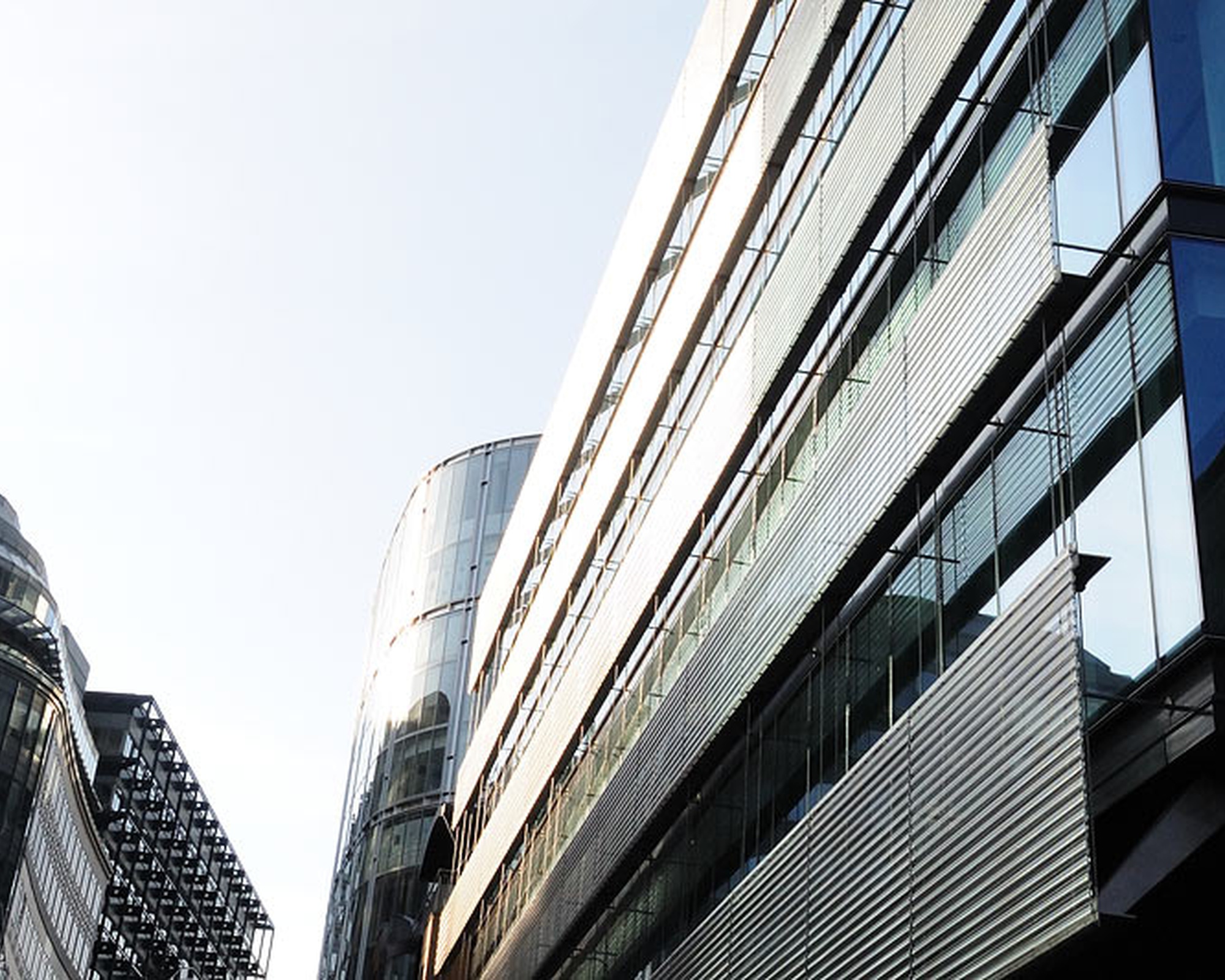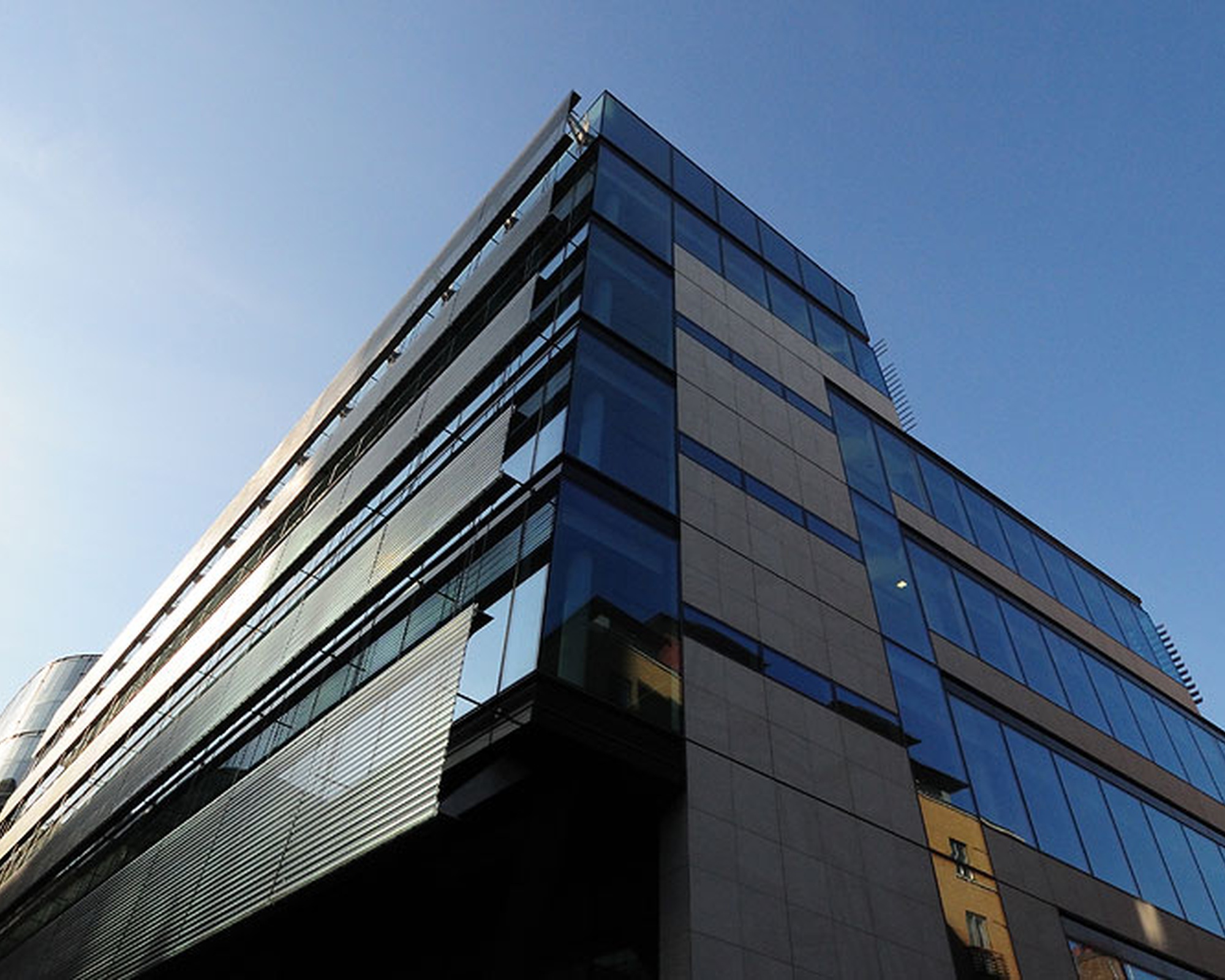 Façade modulaire, protection solaire, bâtiment cube de verre