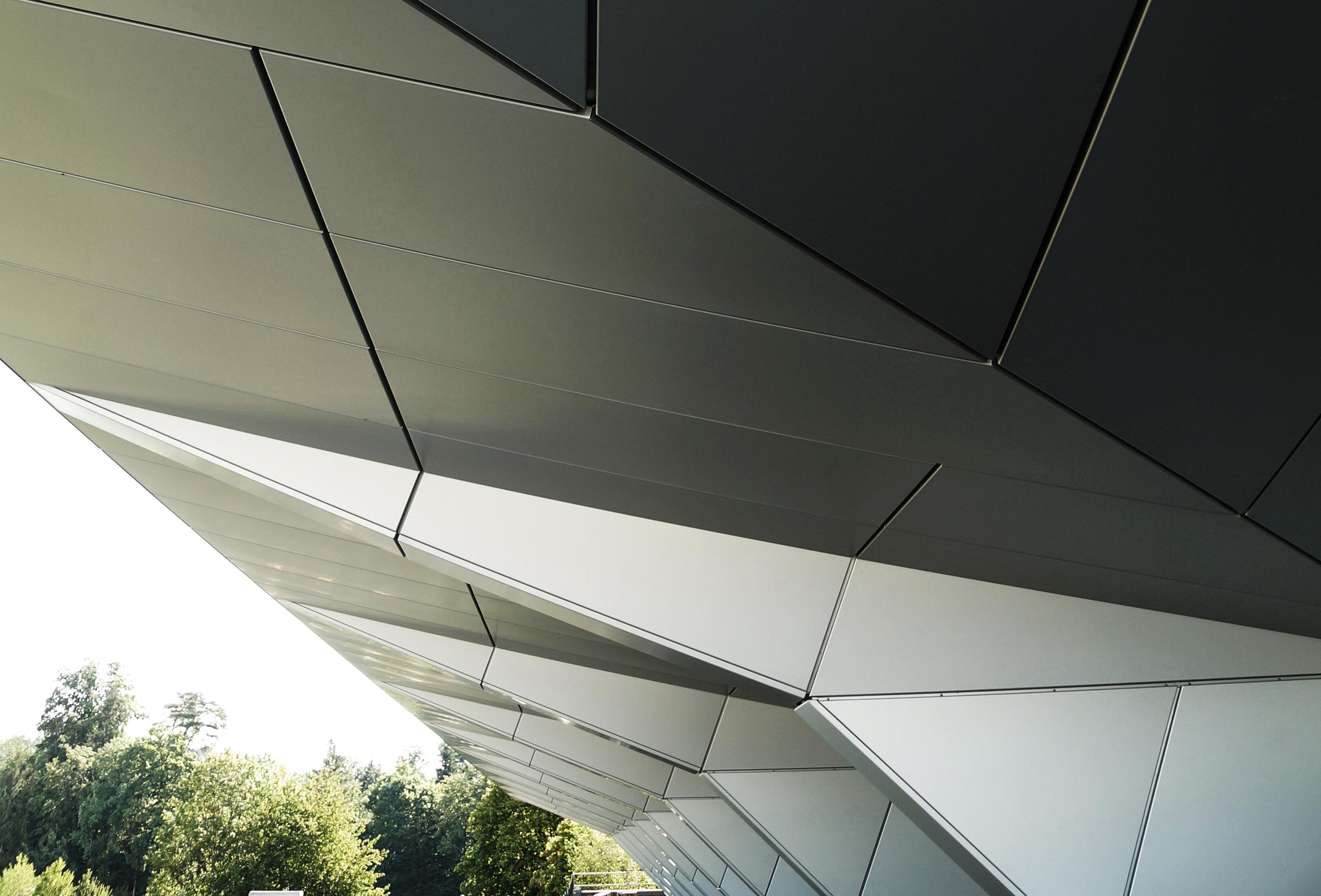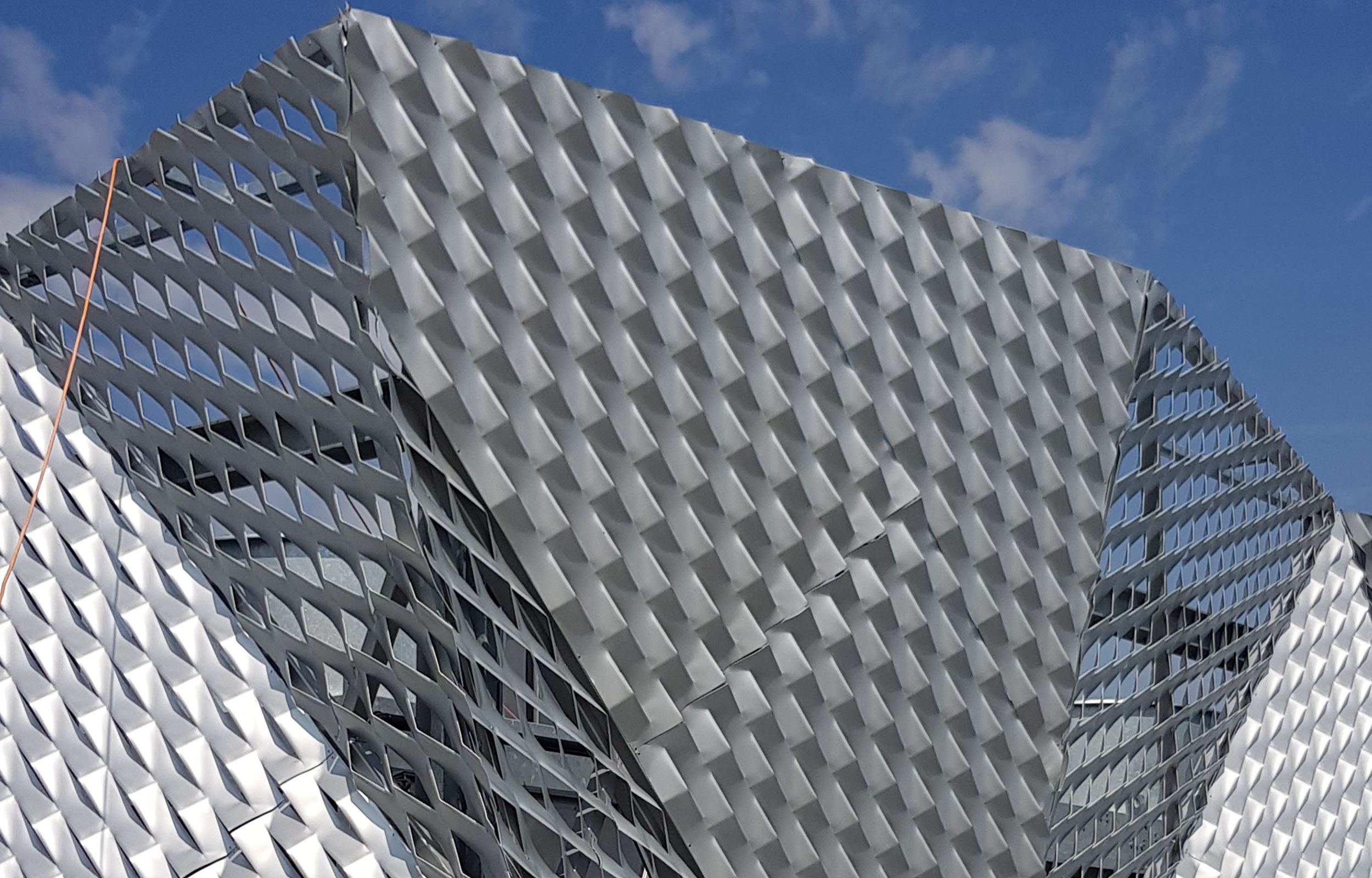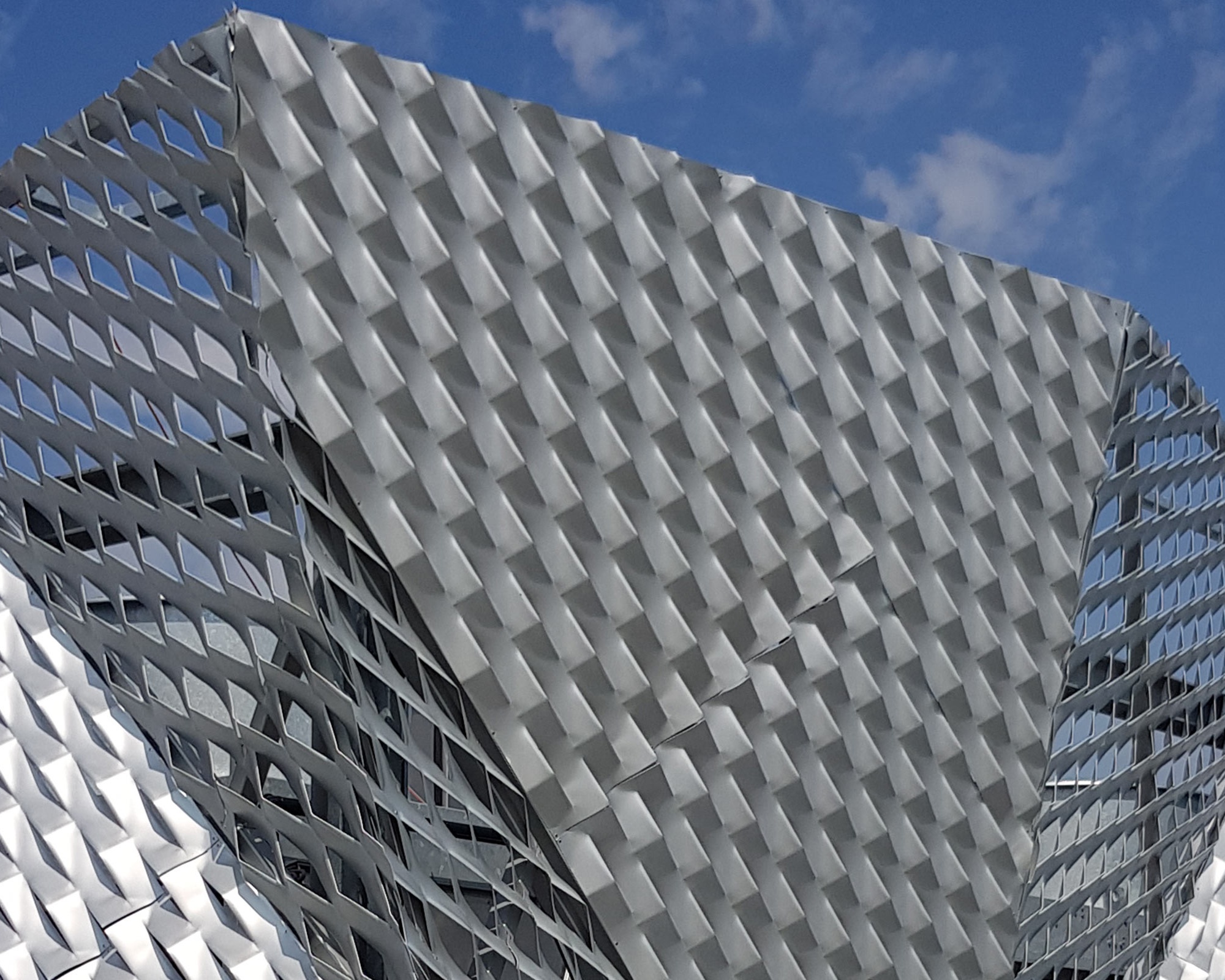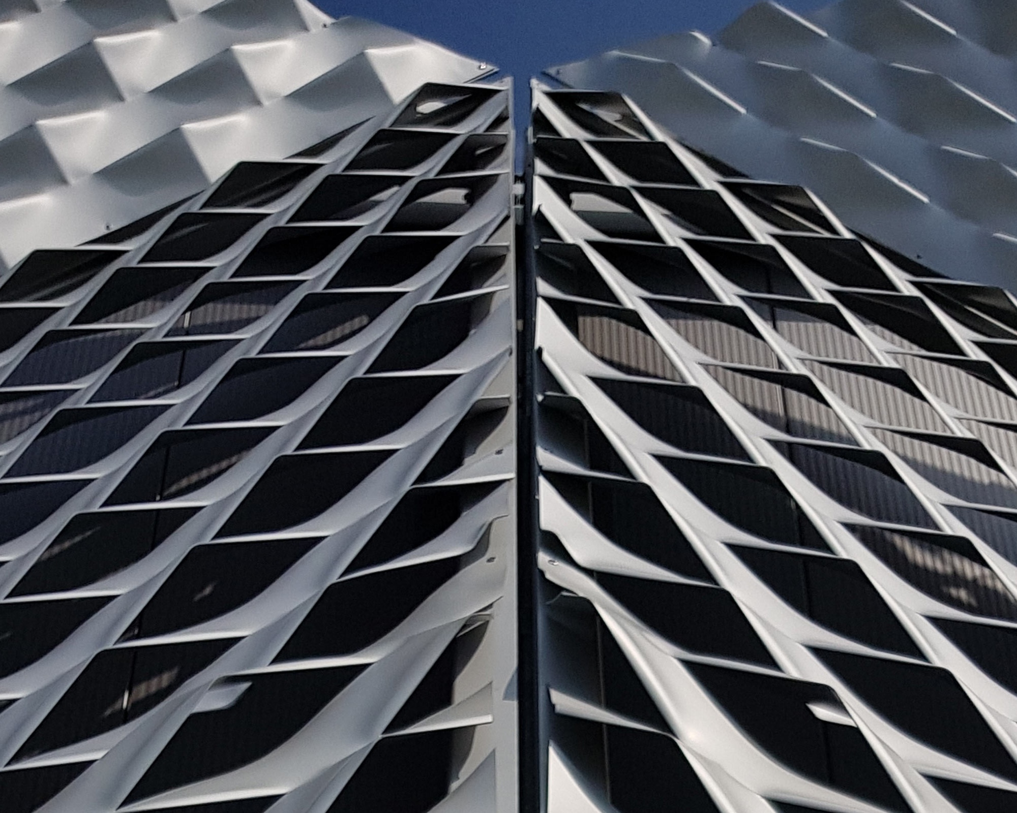 Panneaux de façade habillés avec des panneaux de métal déployé.