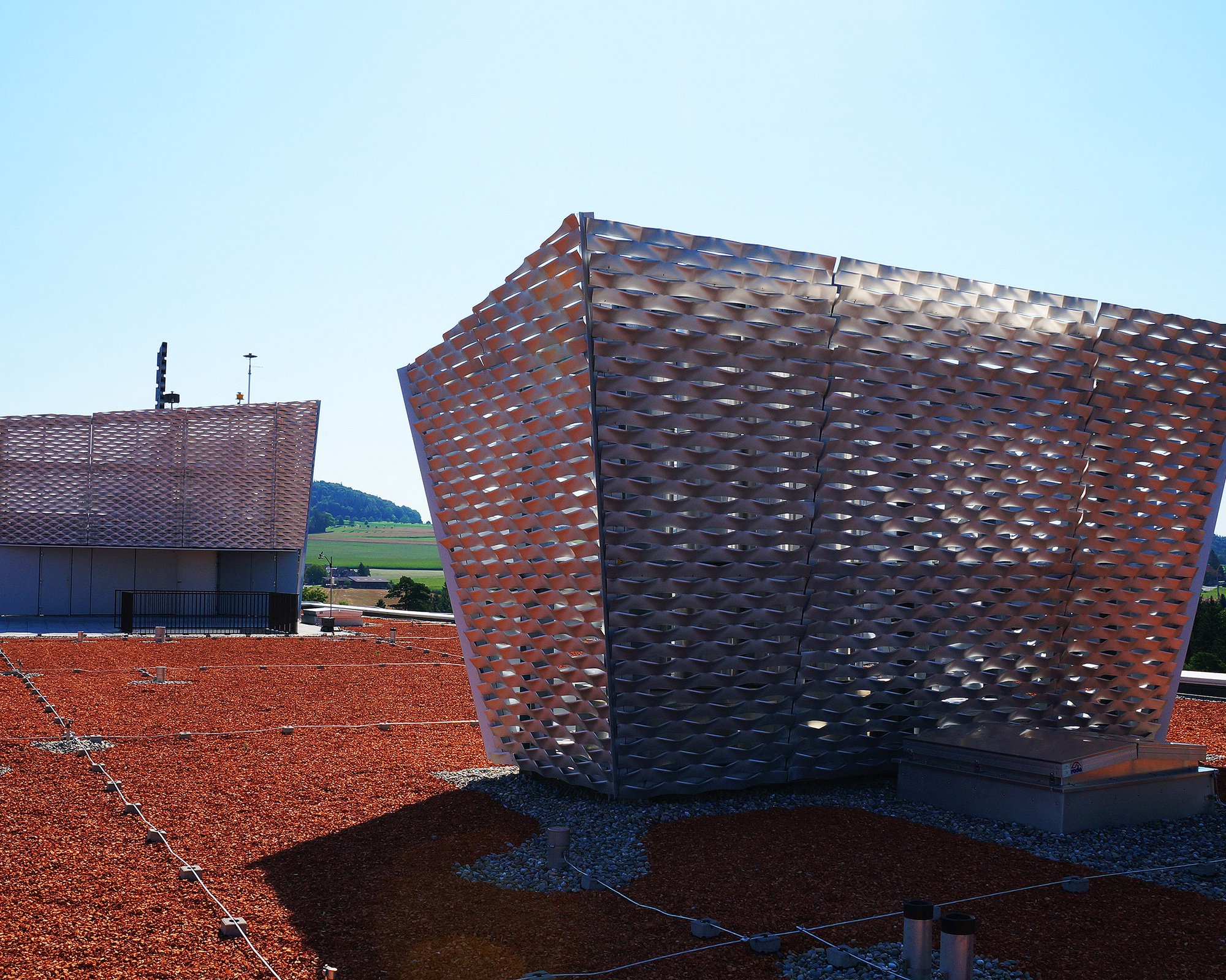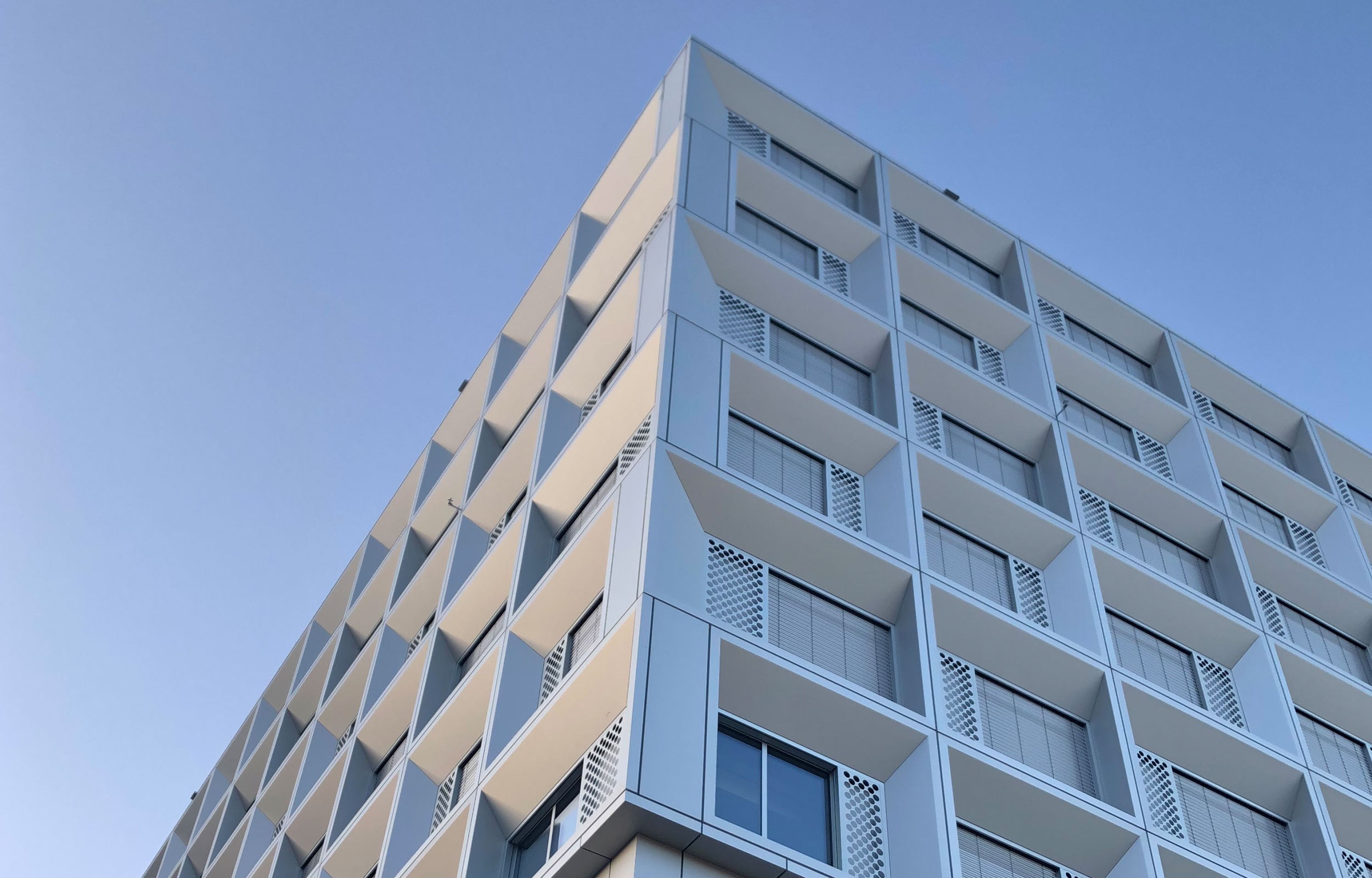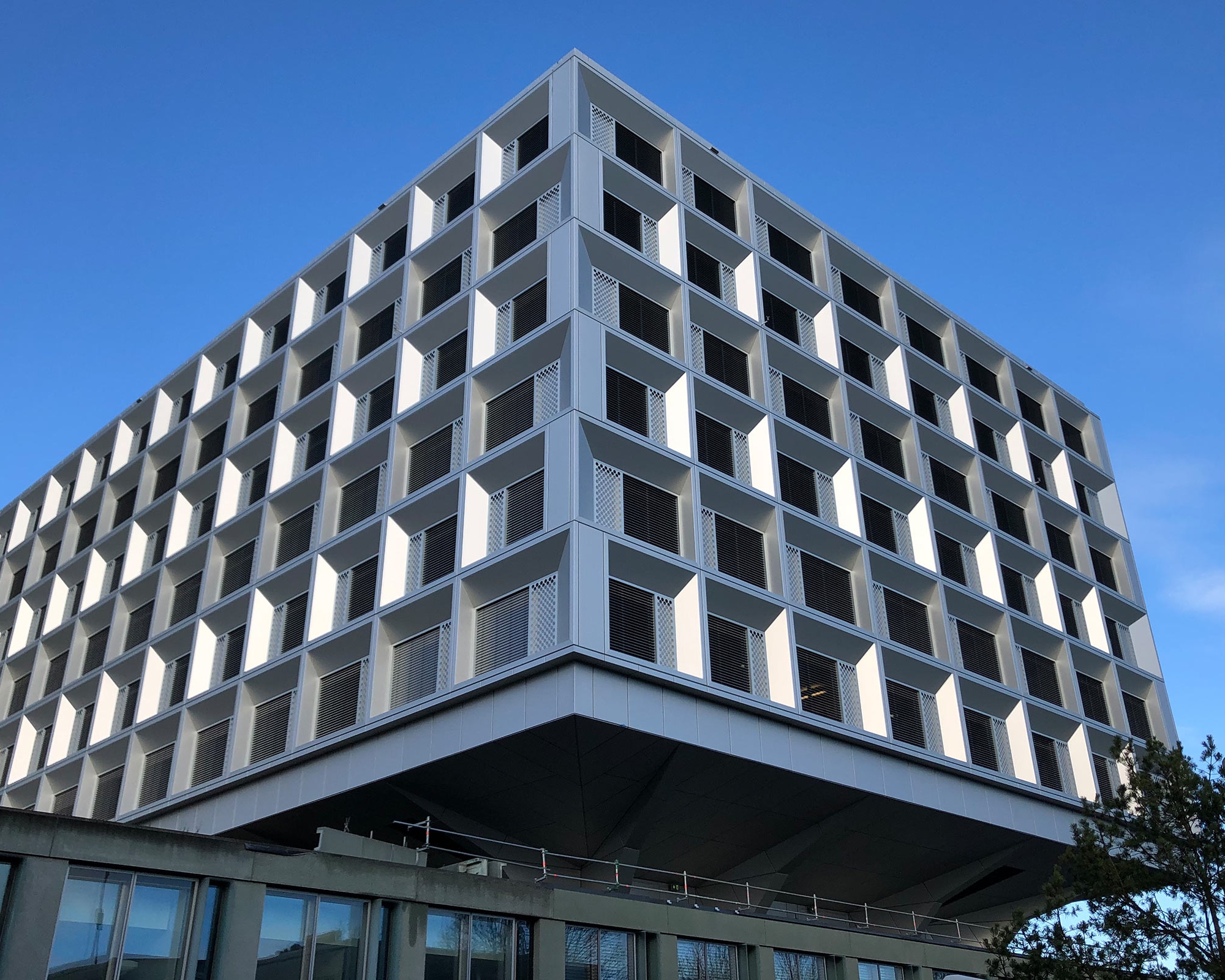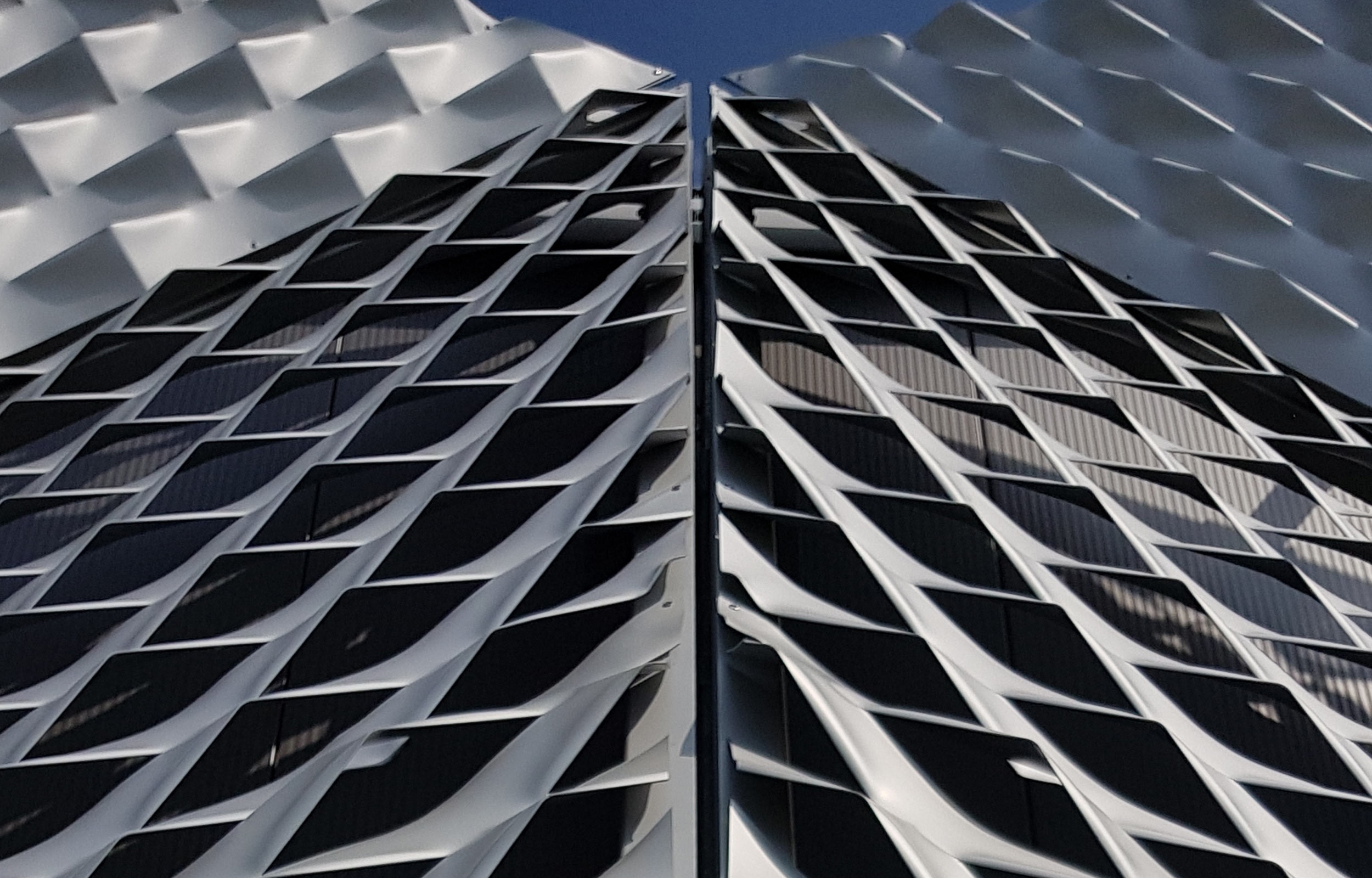Panneaux de façade habillés avec des panneaux de métal déployé.