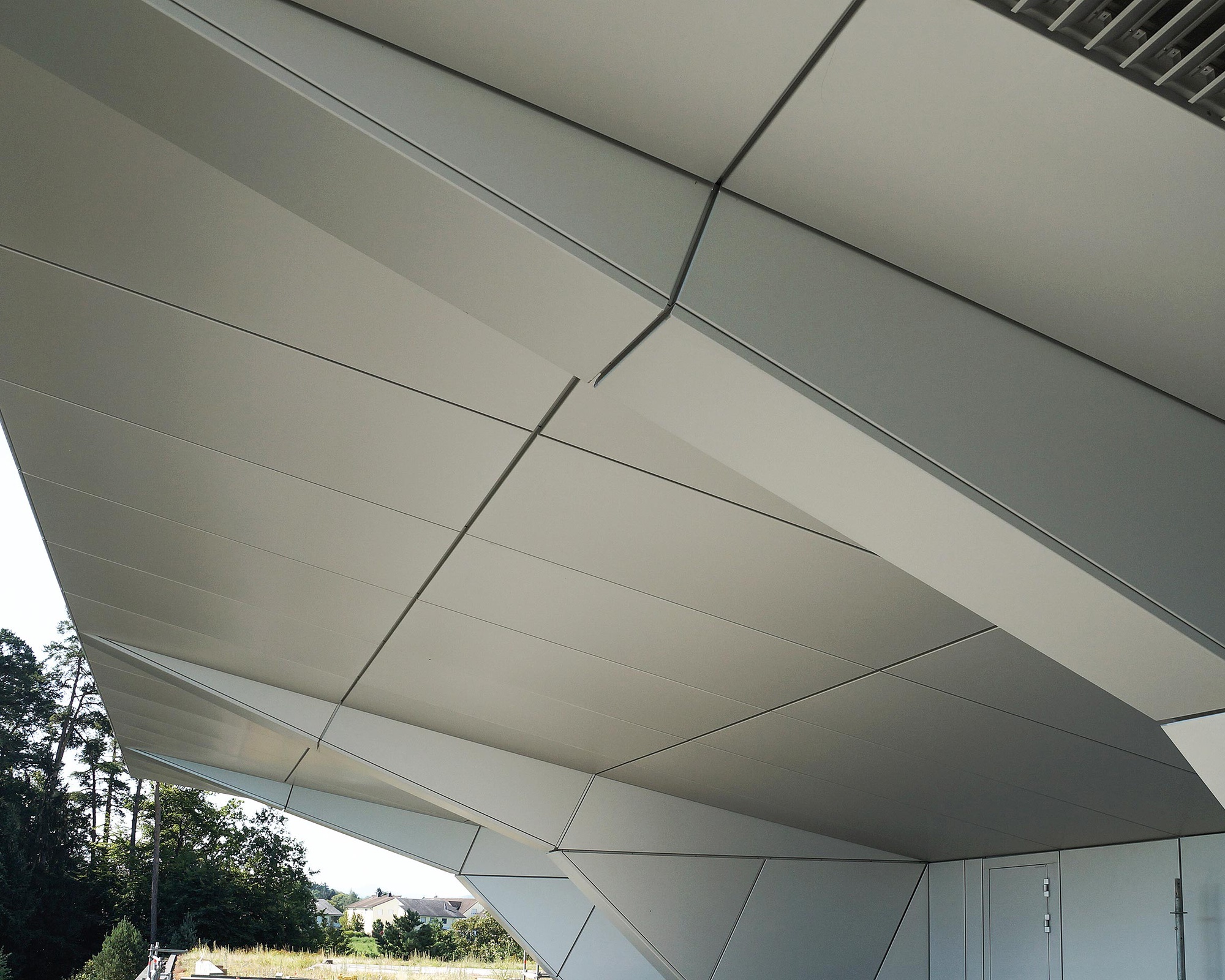 Façade avec éléments de fenêtre et embrasures en tôle montées sur des sous constructions.